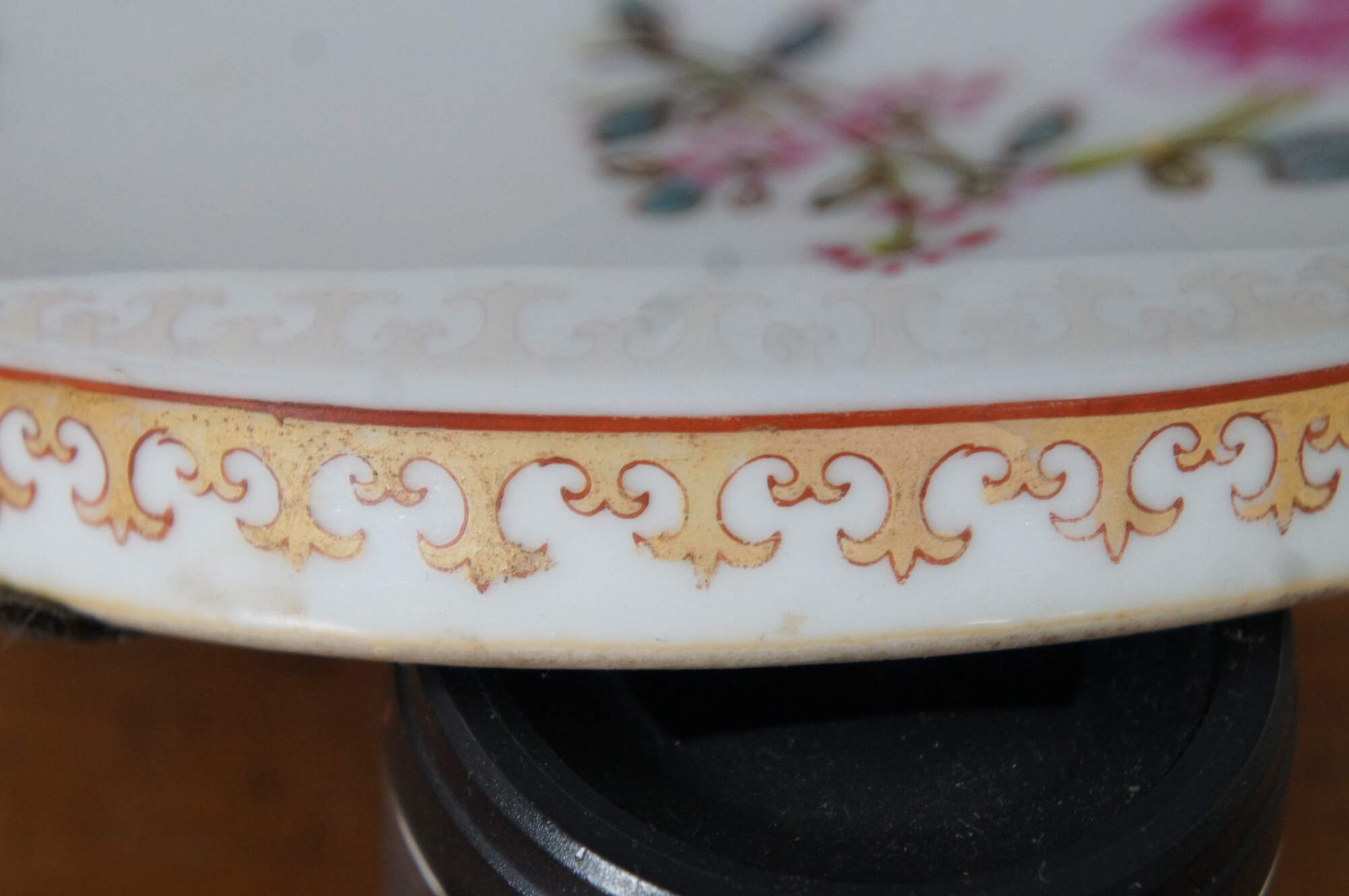 A large and impressive antique Chinese Export porcelain punch bowl featuring a gold and blue armorial coat of arms style crest with fish and dog figures, accented with pink roses, blue stars and an interior border of sea shells.