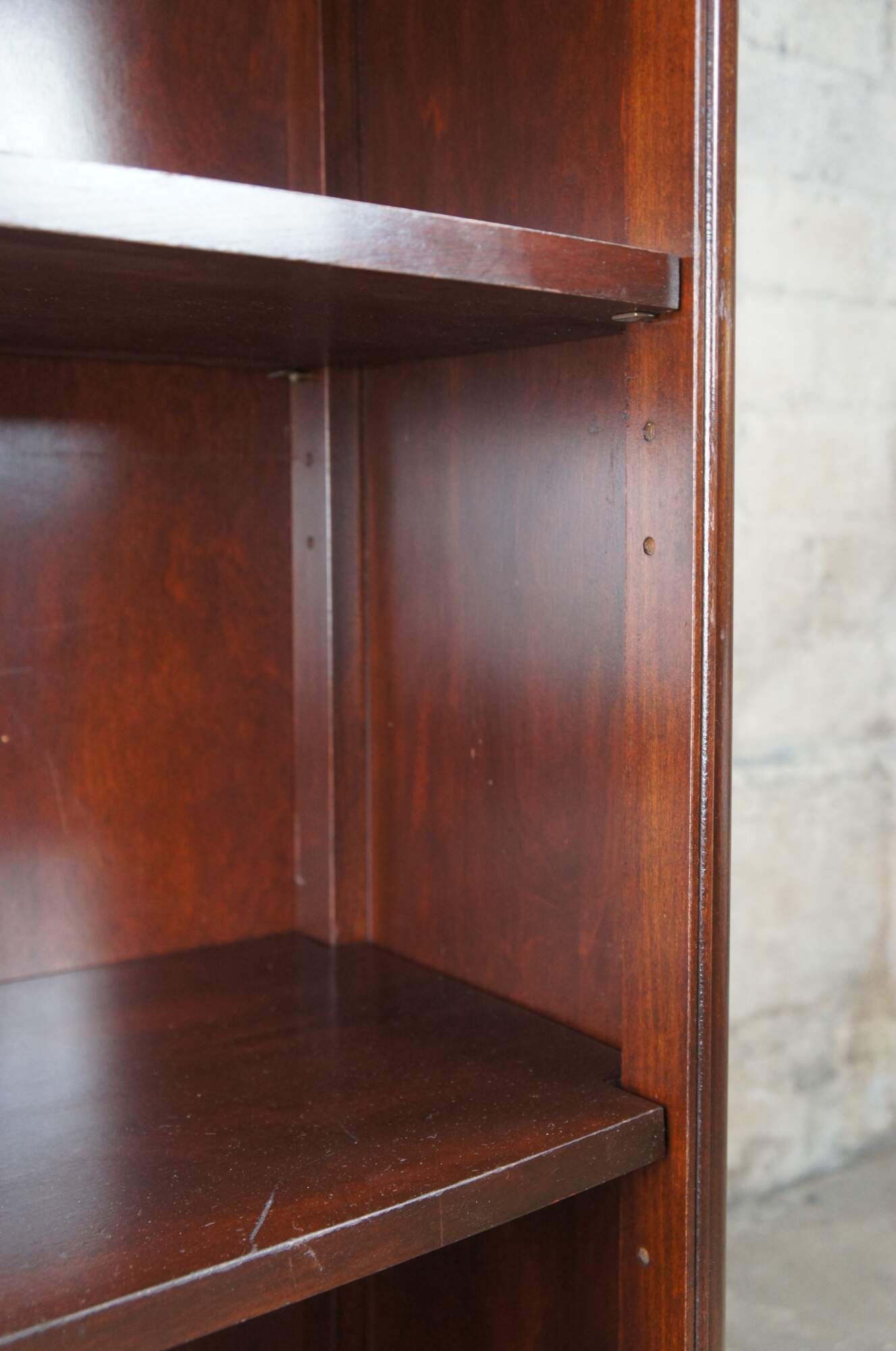 Sligh-Lowry petite mahogany bookcase or console, circa 1960s. Features a petite rectangular form with two adjustable shelves and an upper dovetailed drawer with a brass sheraton style pull. Great for use in an entryway, living room or library.