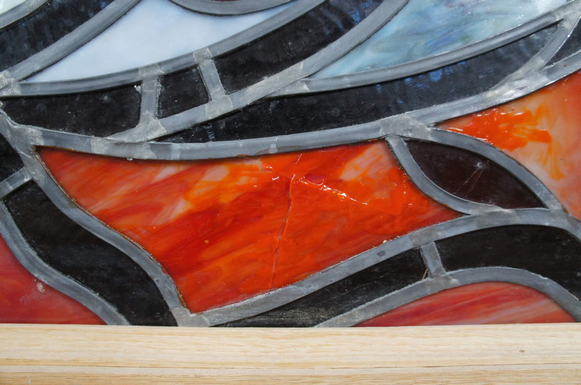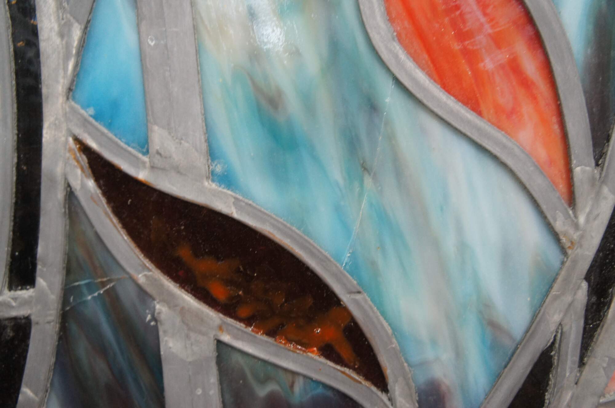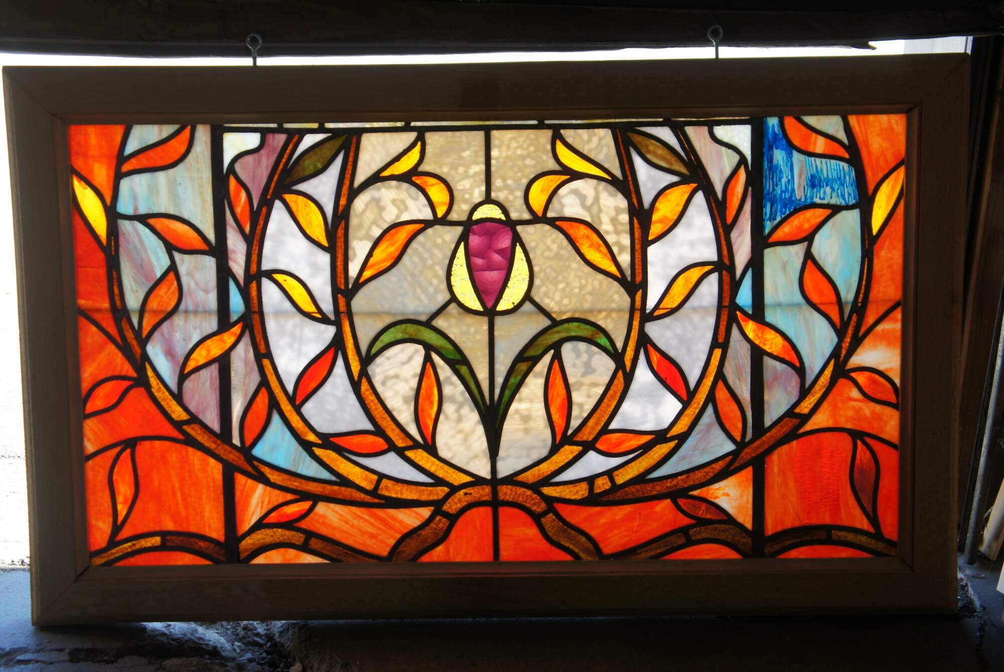 Late 20th century leaded stained glass window hanging panel. Features a field of red with accents of amber, blue and purple. At the center is a rose with foliate surrounds. Framed in a heavy oak with two eye hooks along the top for hanging