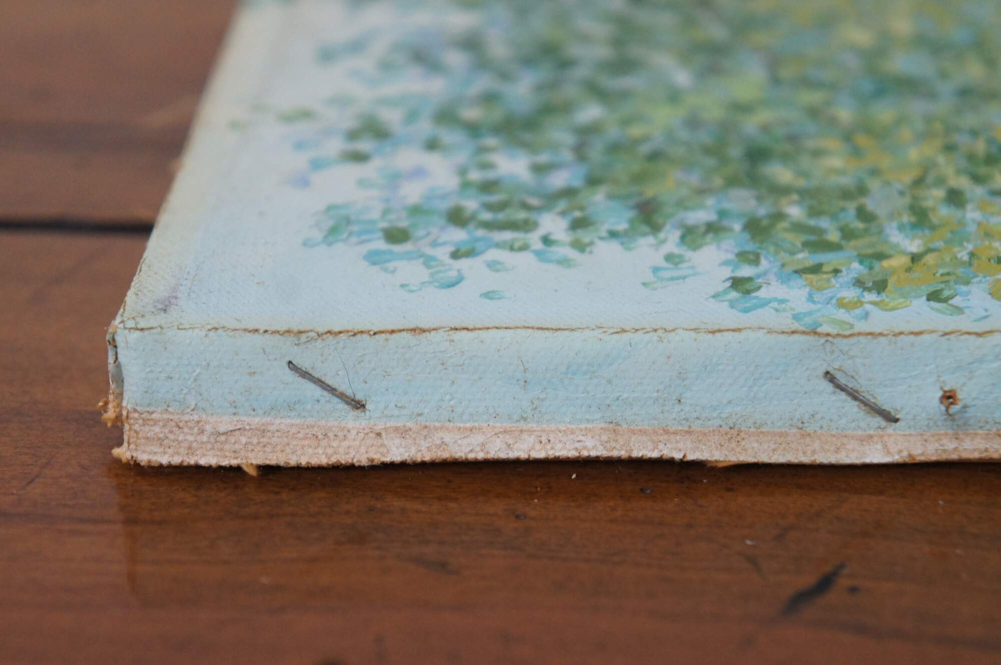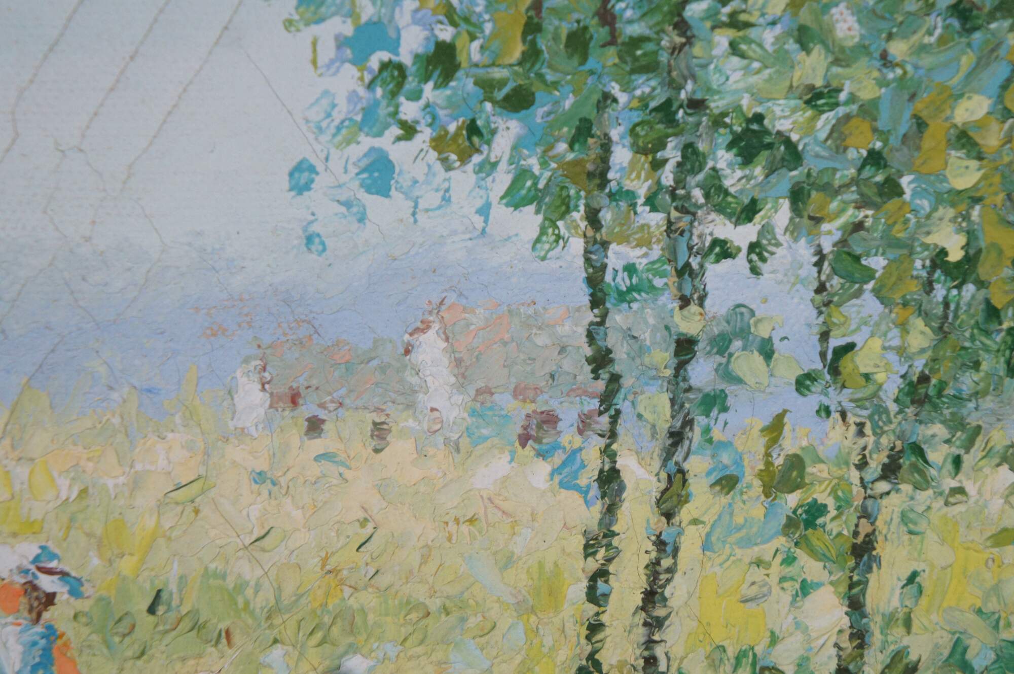 Vintage original Impressionist landscape oil painting on canvas showing a green field with trees and a pair of figures walking toward a cottage. Signed lower right, V. Noorole (Nookole / Noopole?).