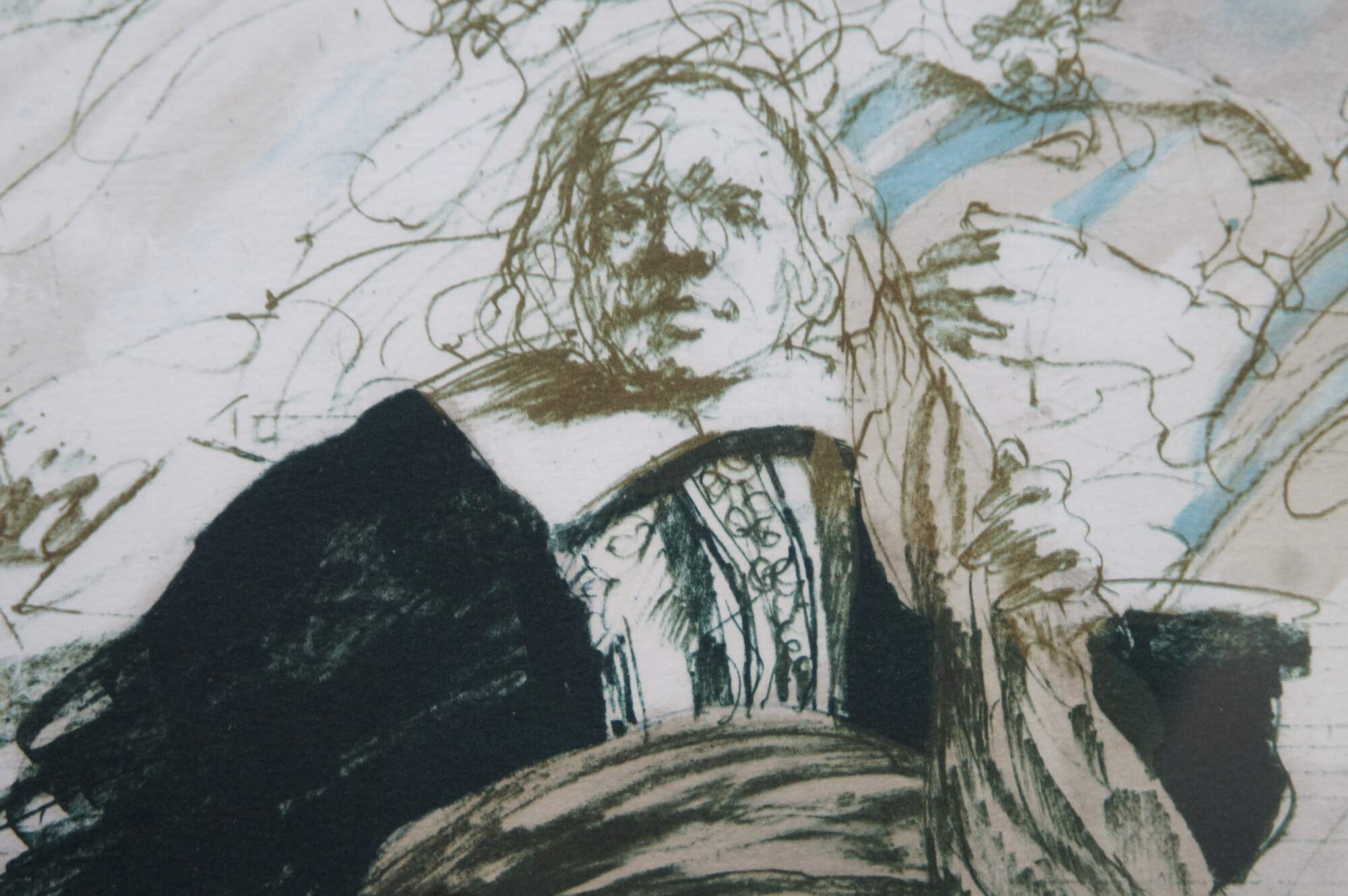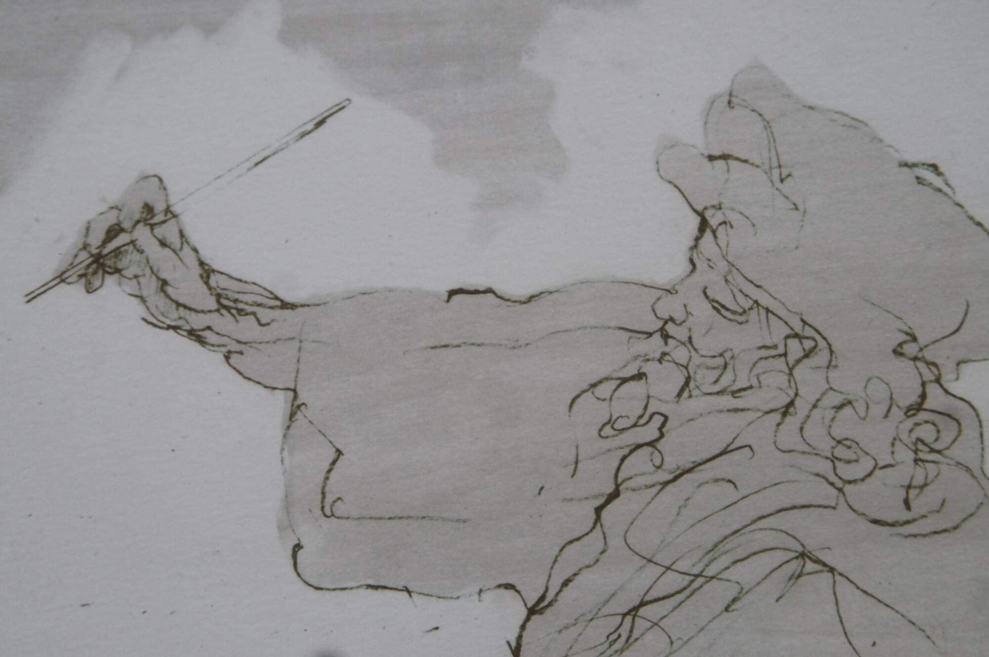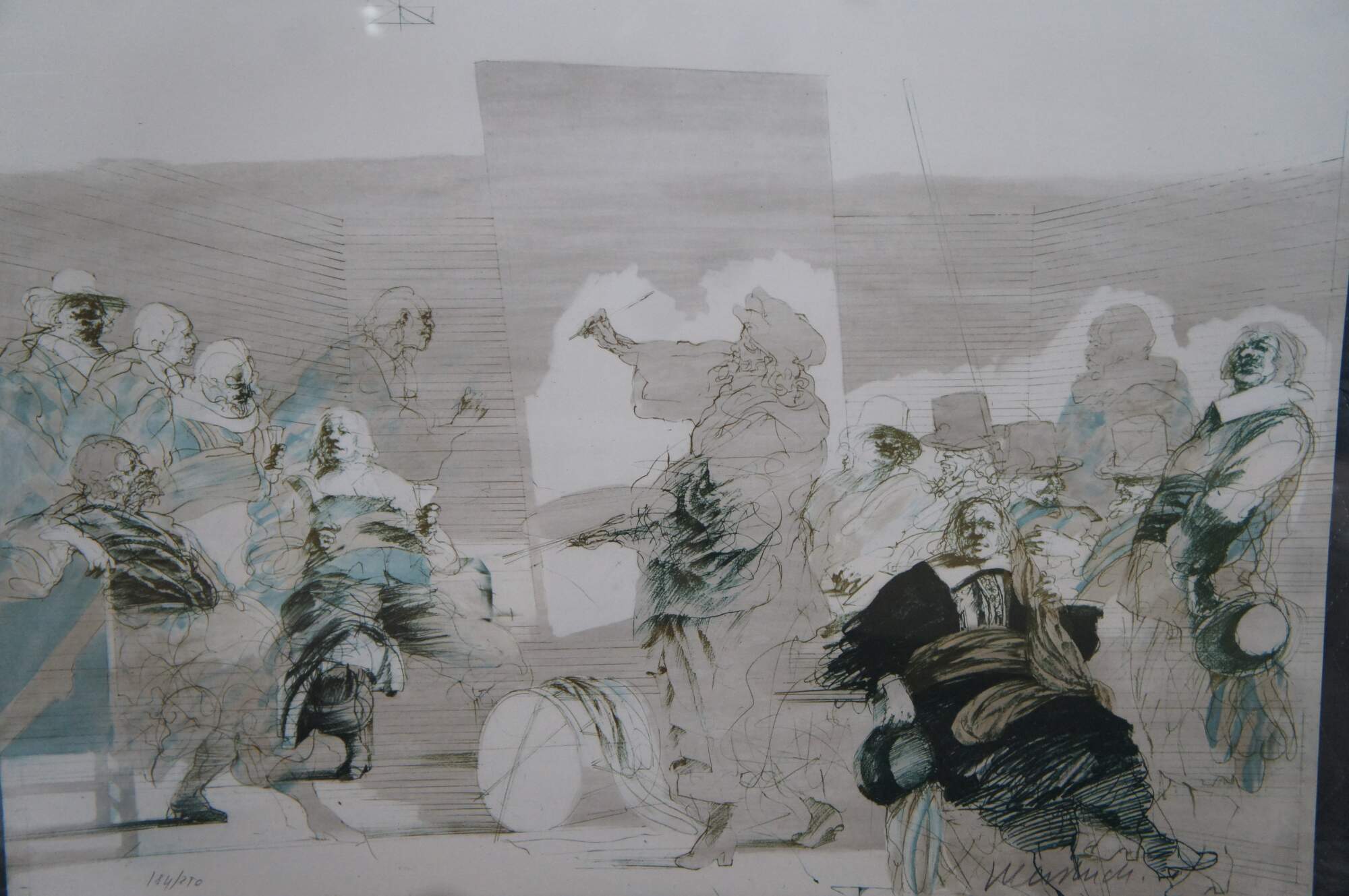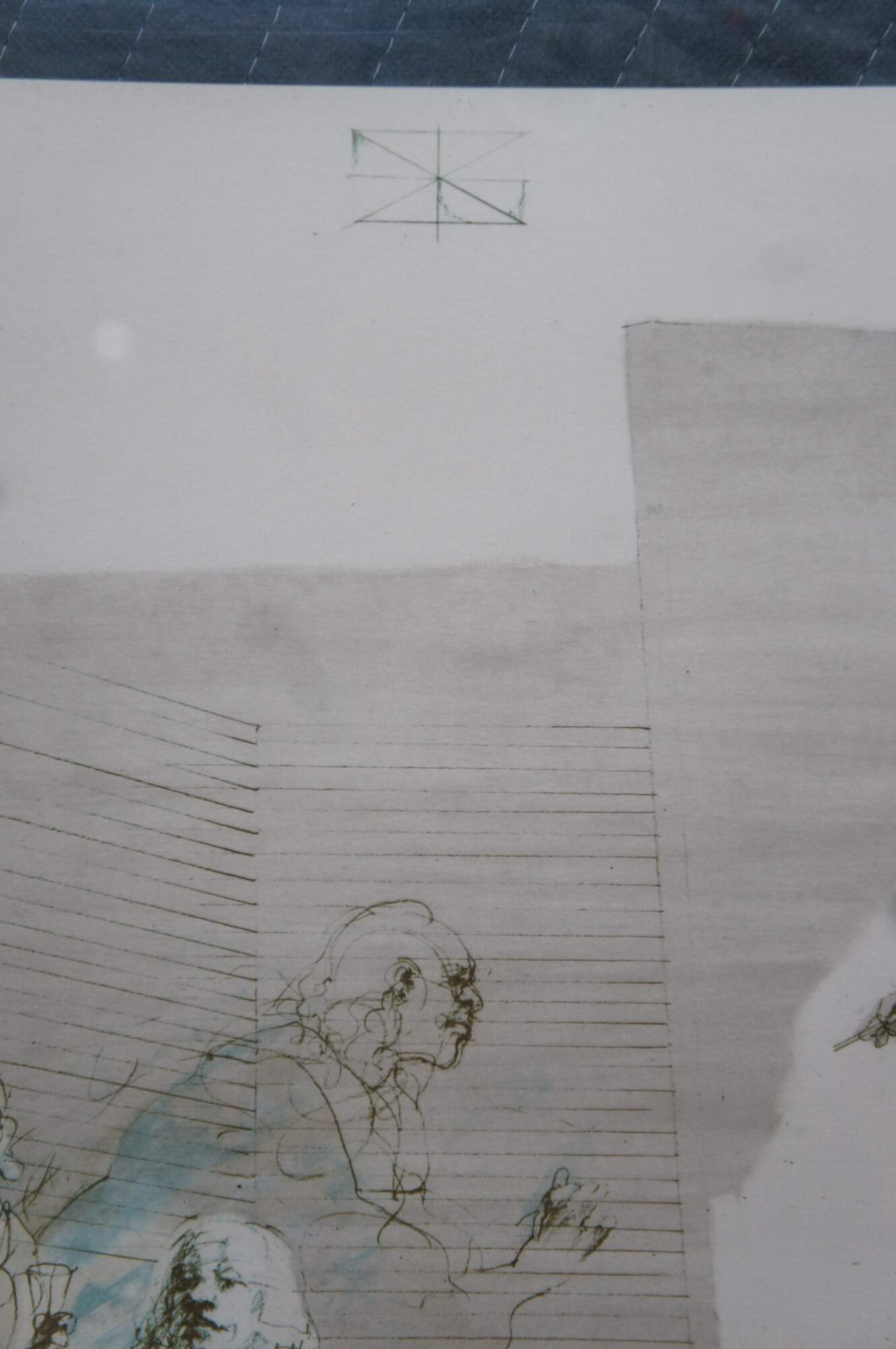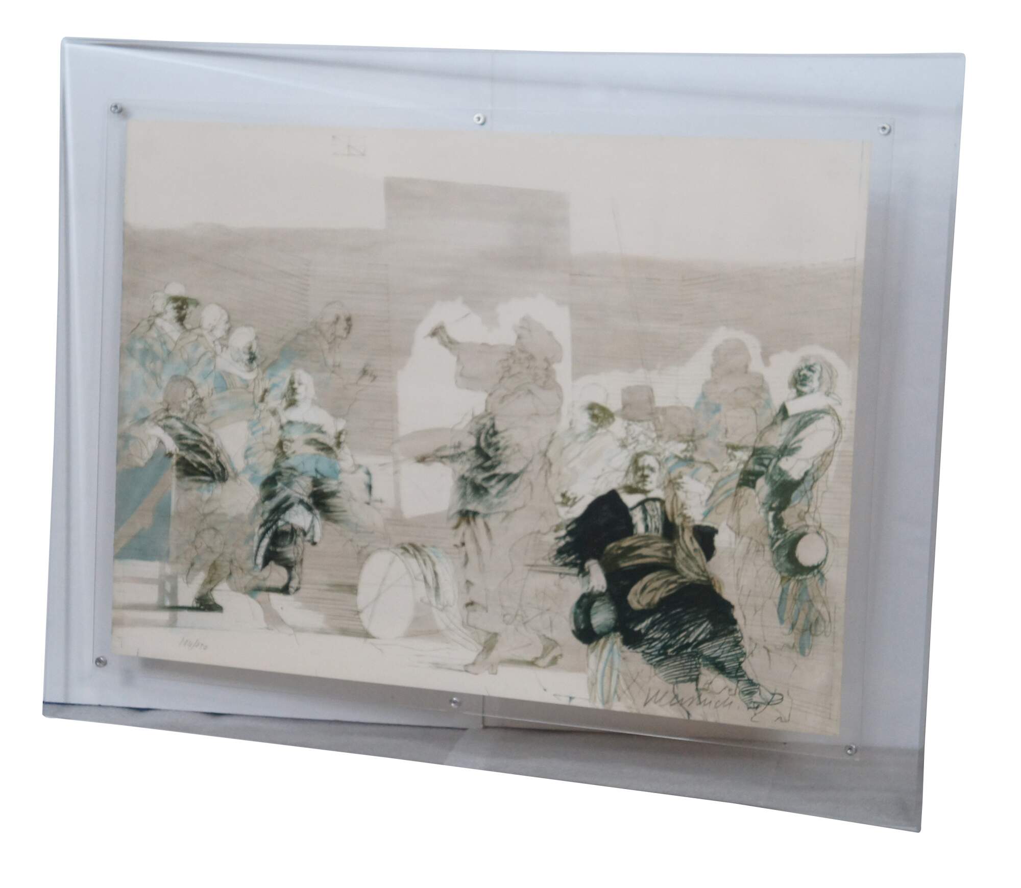 Vintage lithograph sketch or study in the style of the Old Masters of the Renaissance, depicting a male artist at an easel, surrounded by other male figures / scholars / philosophers in various attitudes; pencil signed and numbered 184/270. Mounted in a heavy acrylic frame.