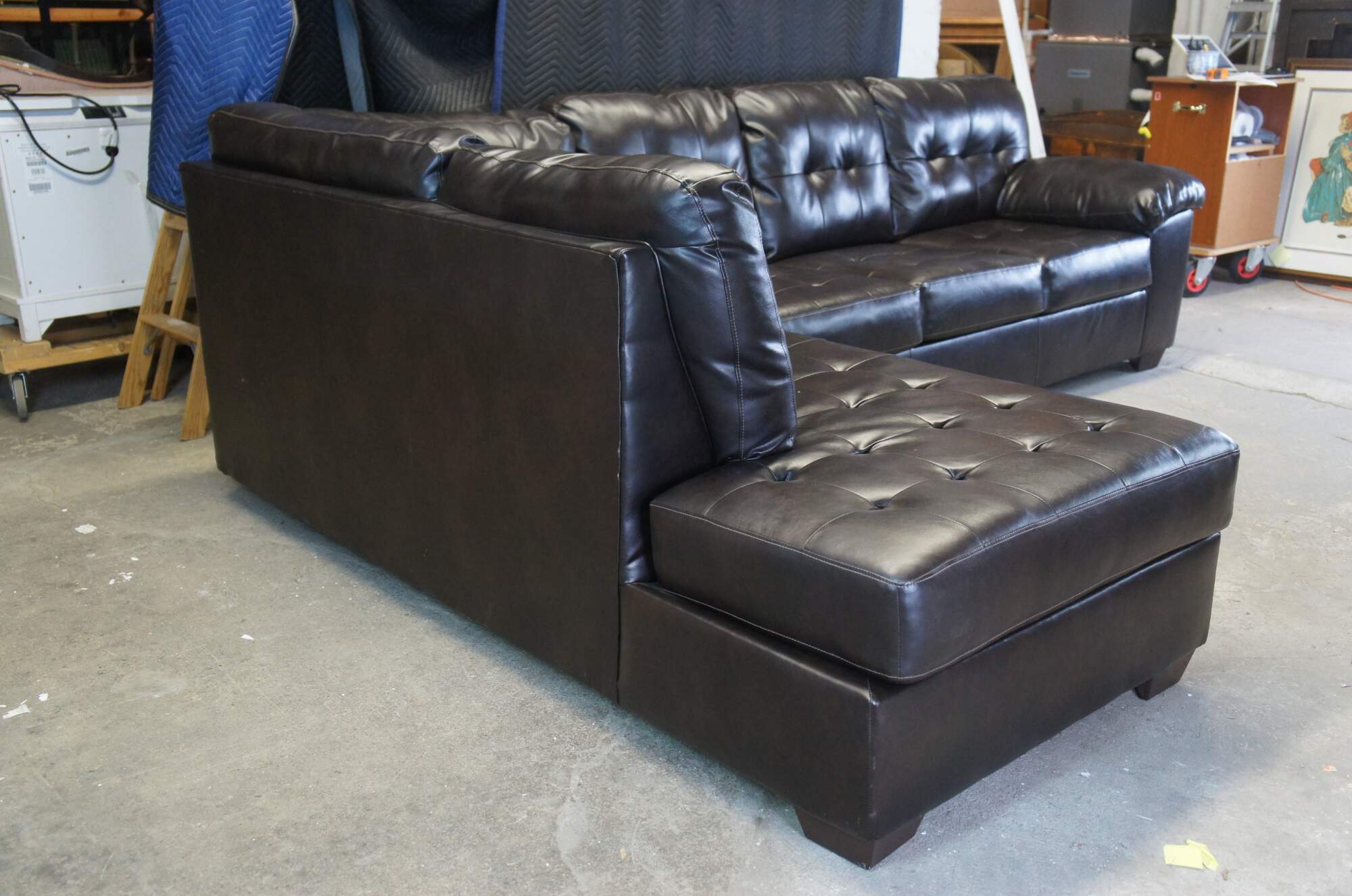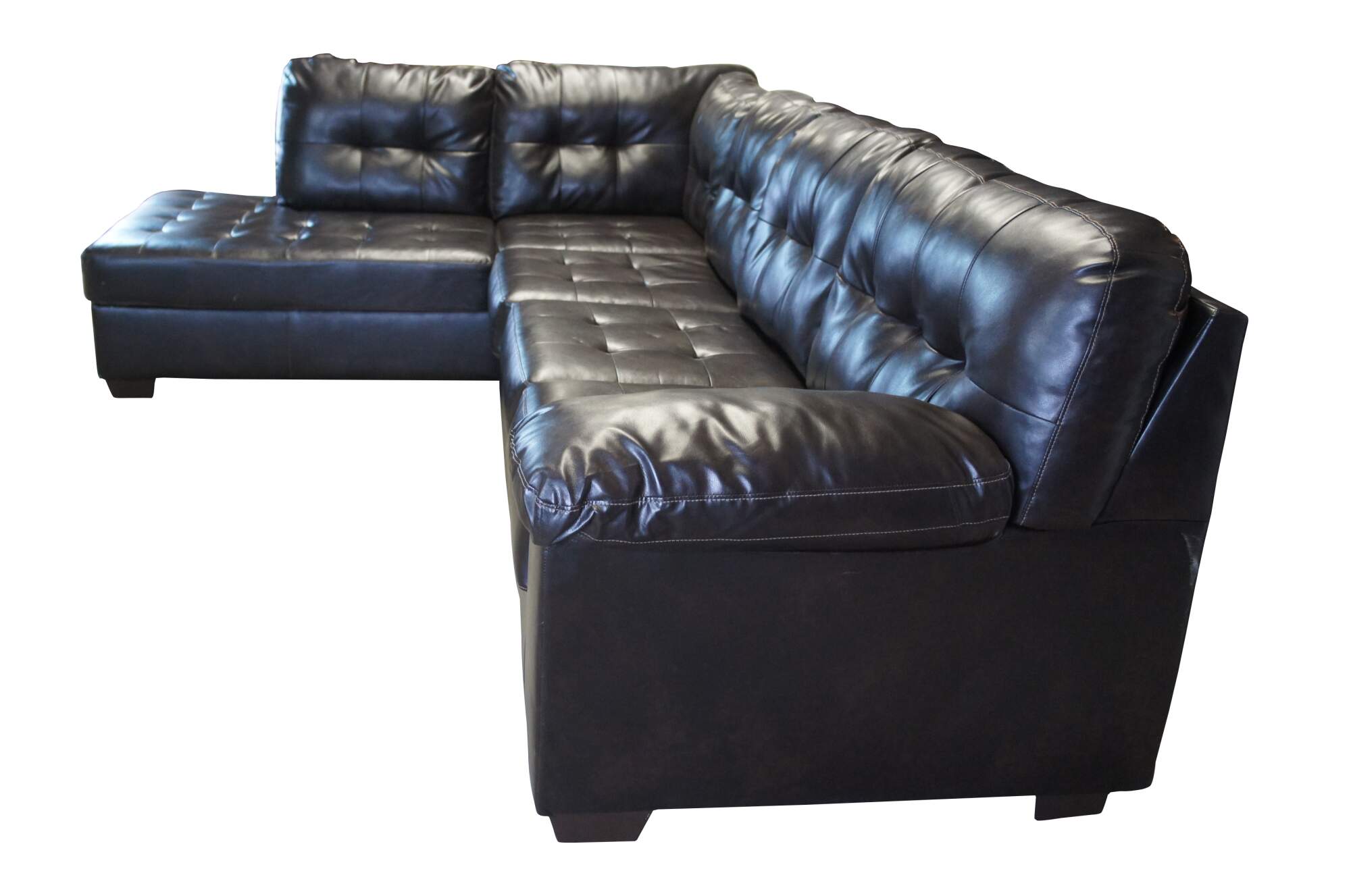 Dressed in rich chocolate faux leather, the Donlen sectional is certain to be the center of attention. With tasteful tufting, padded armrests and a sleek tapered design, its generous scale lets you share the space with family or use it for entertaining when friends drop in.