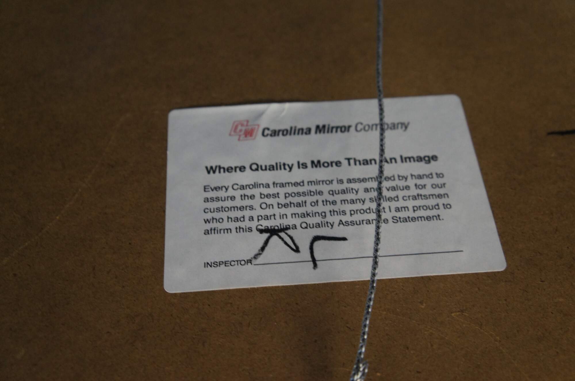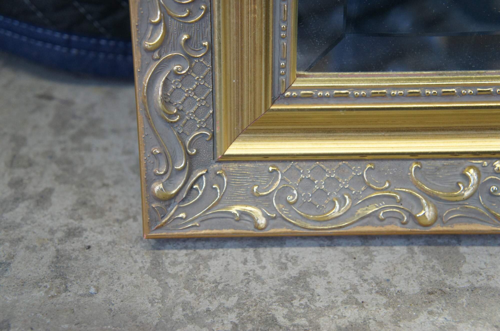 Carolina Mirror Company rectangular mirror with bevelled glass. Features a gold frame with "s" and "c" scrolled detail. Can be hung vertical or rectangular. Great for artwork as well.
