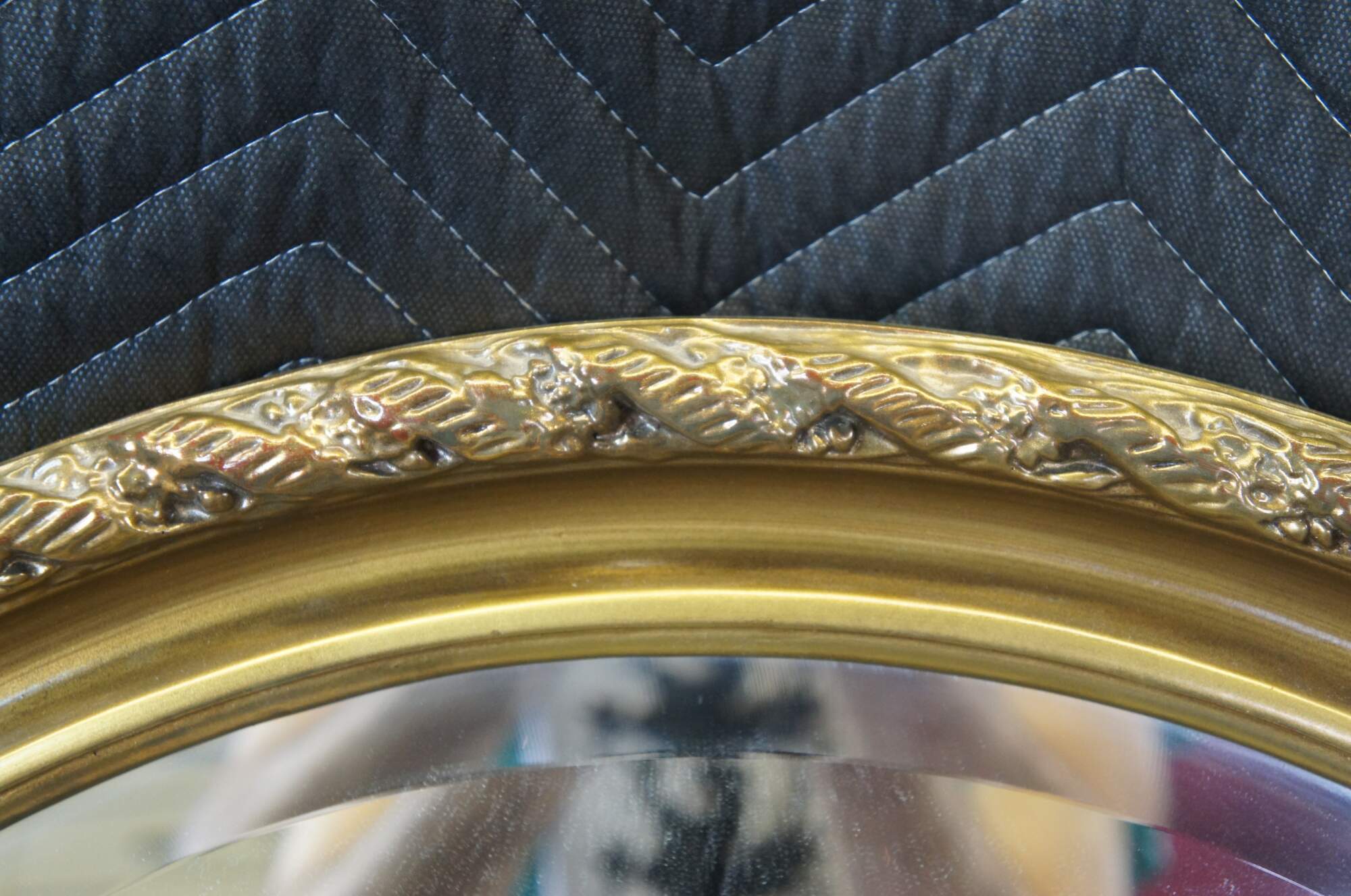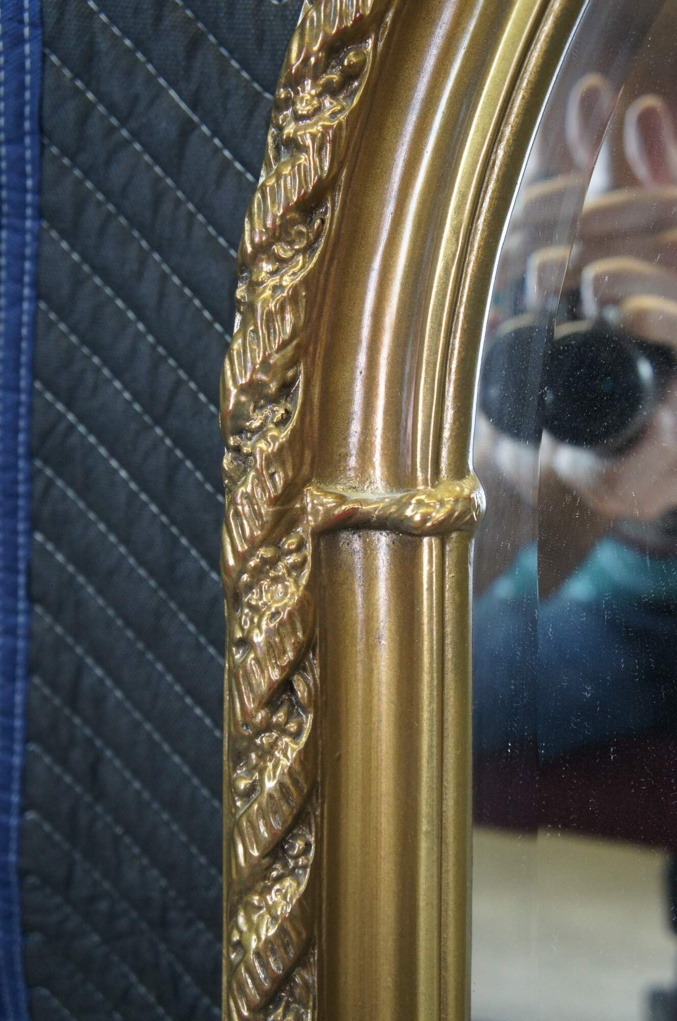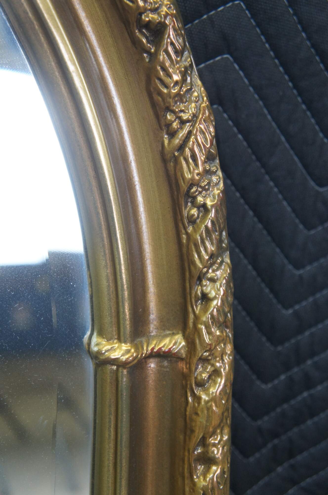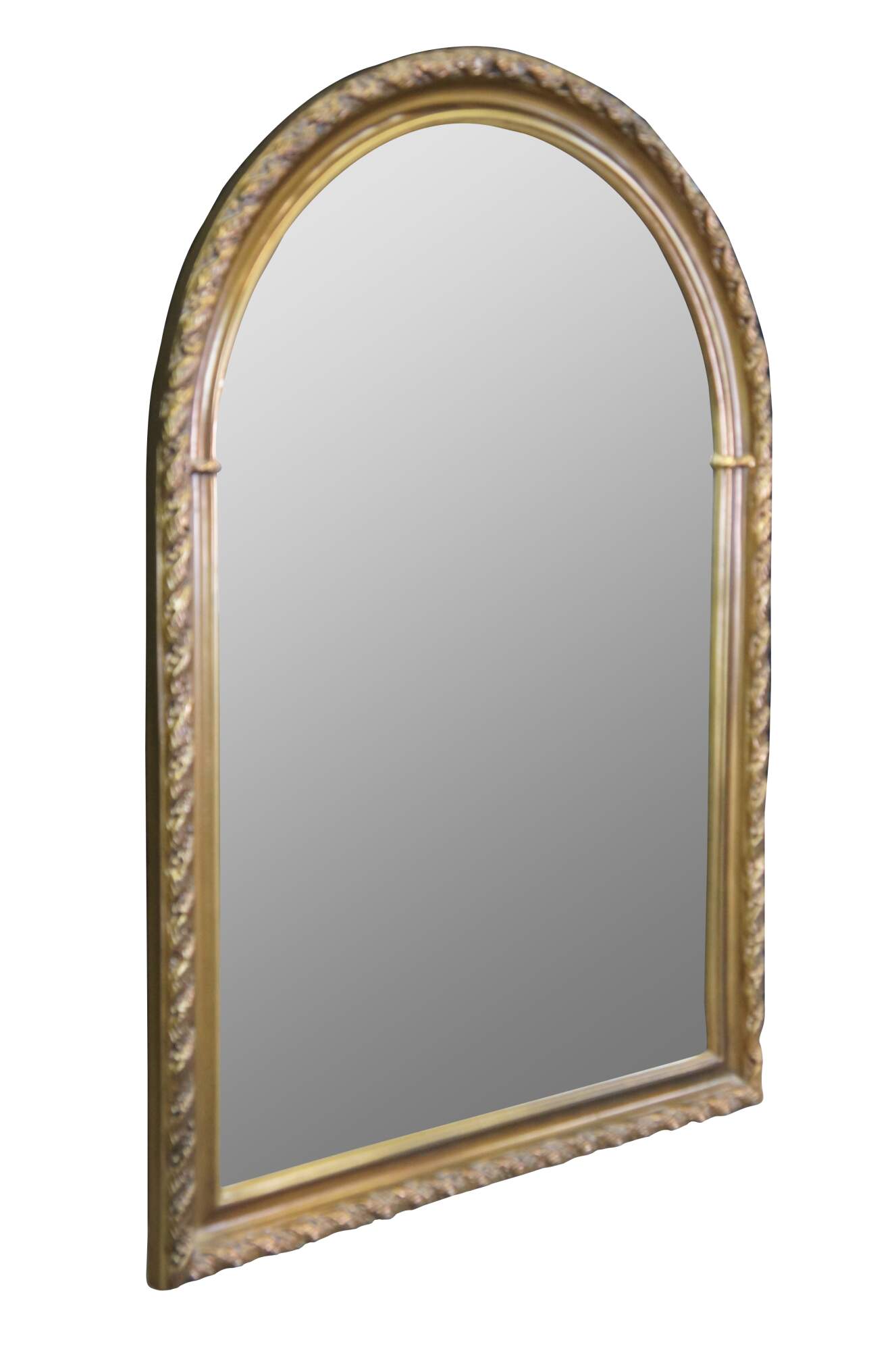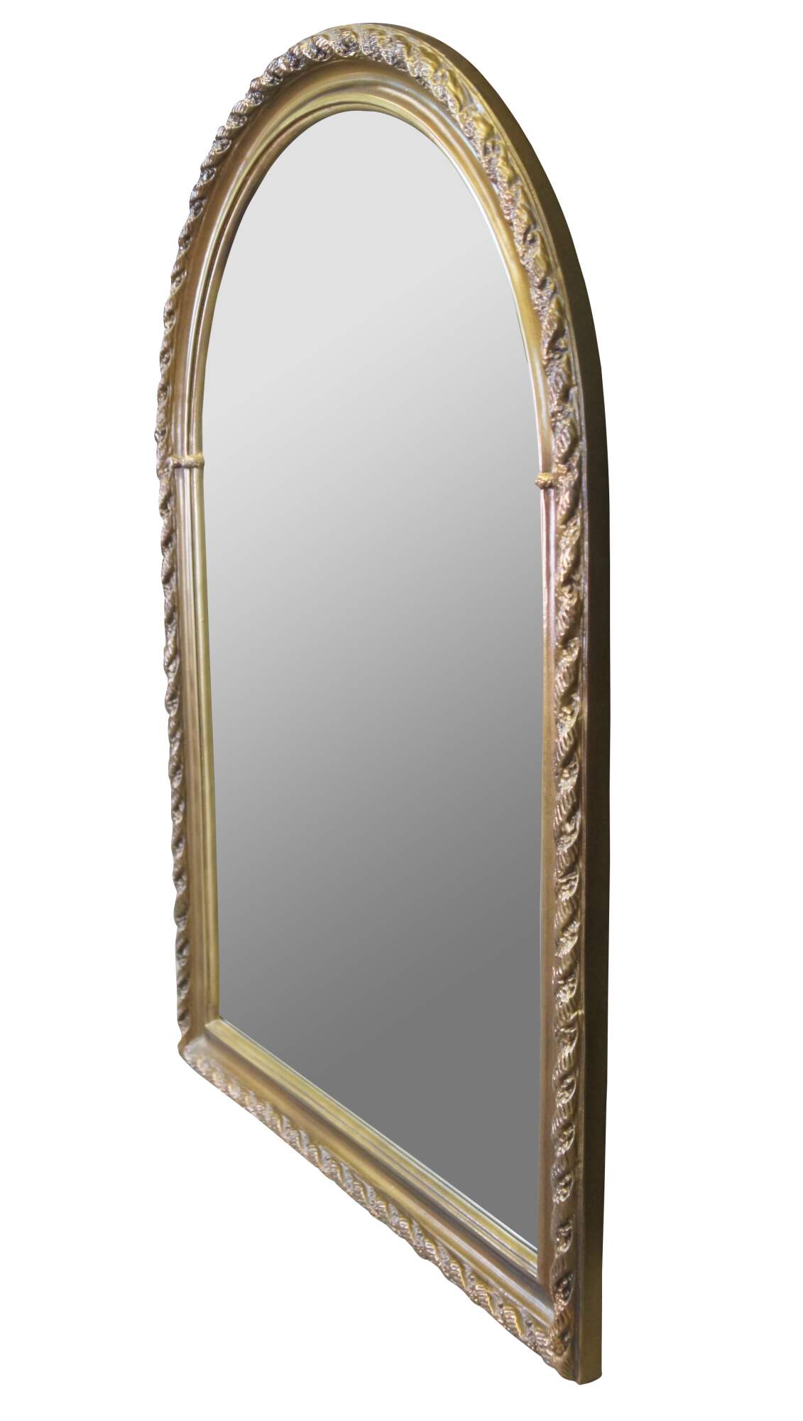 Vintage French Regency inspired arched over mantel or wall mirror, circa 1970s. Features a uniquely ribboned border in a barley twist design. Glass plate is beveled along the edge.