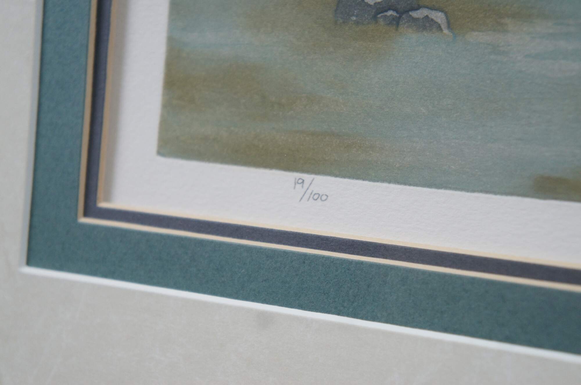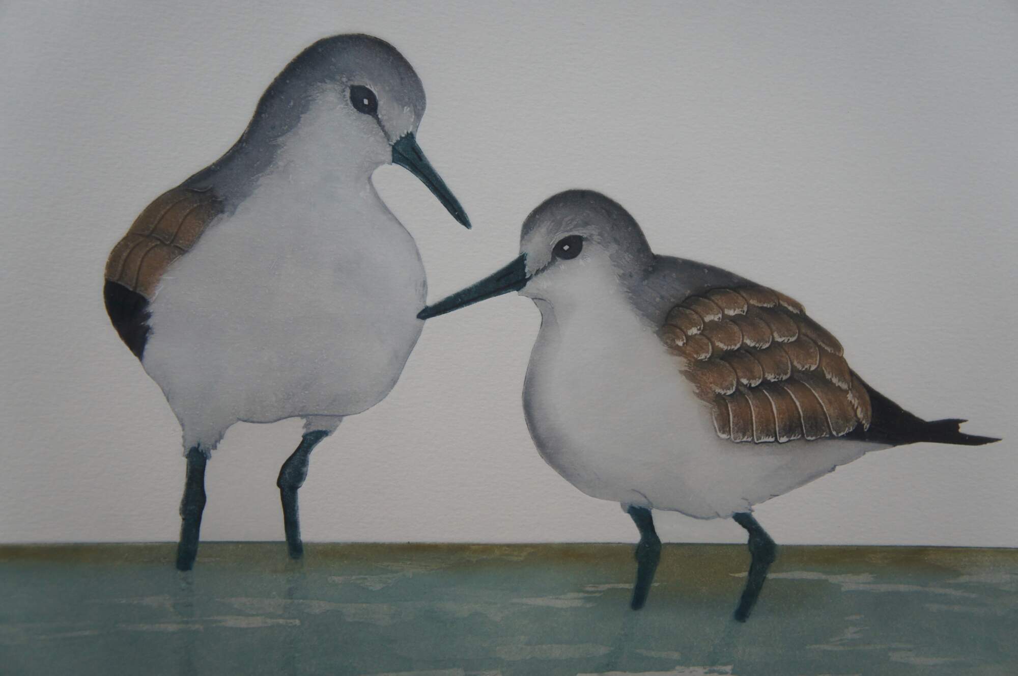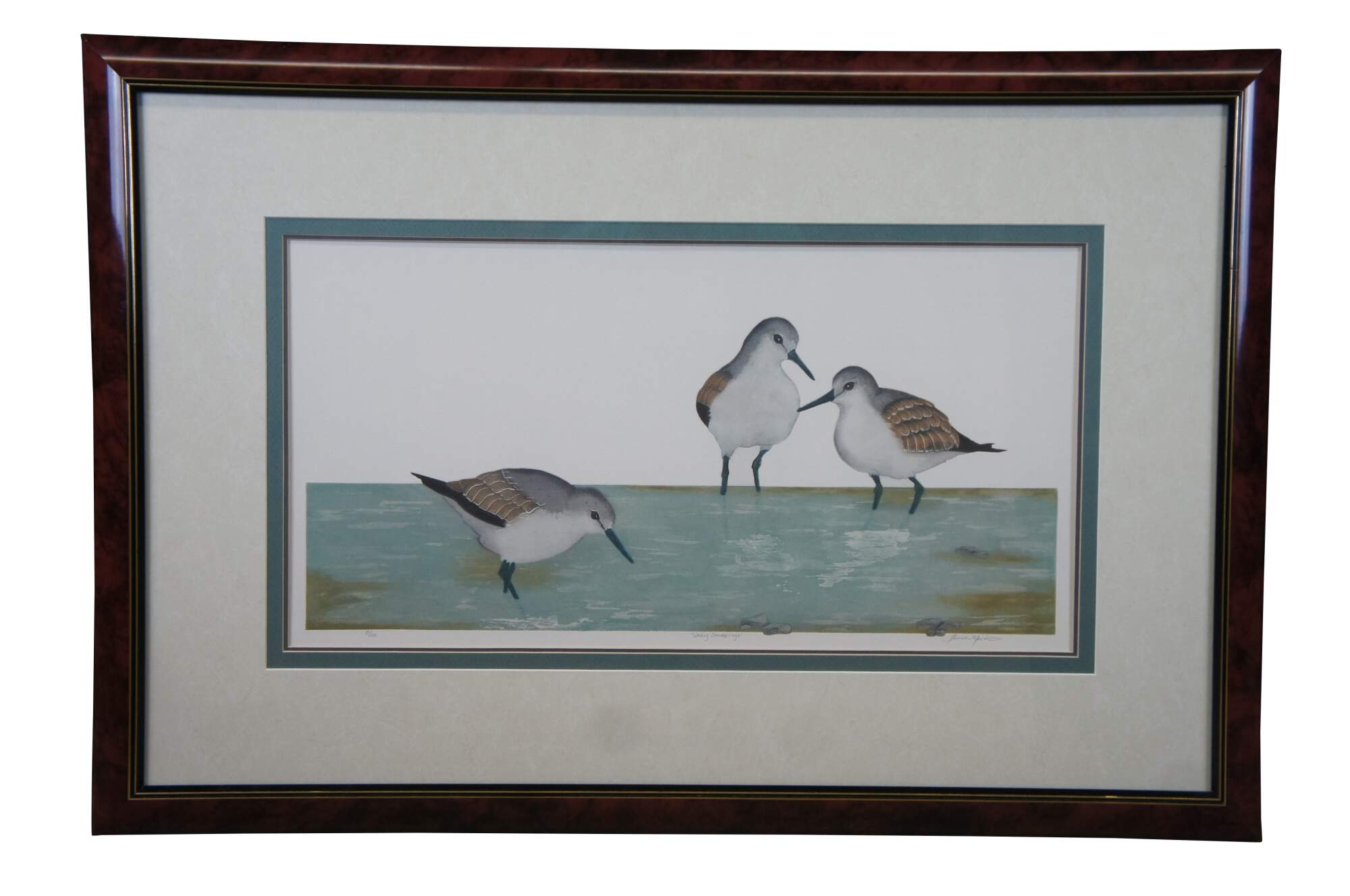 A colorful pair of limited edition lithographs. Titled "Wading Sandpipers" & "Wading Sanderlings". Signed lower right by Laure, last name appears to Nevi. Each piece is numbered along the lower left. Professionally framed with a burled red border.