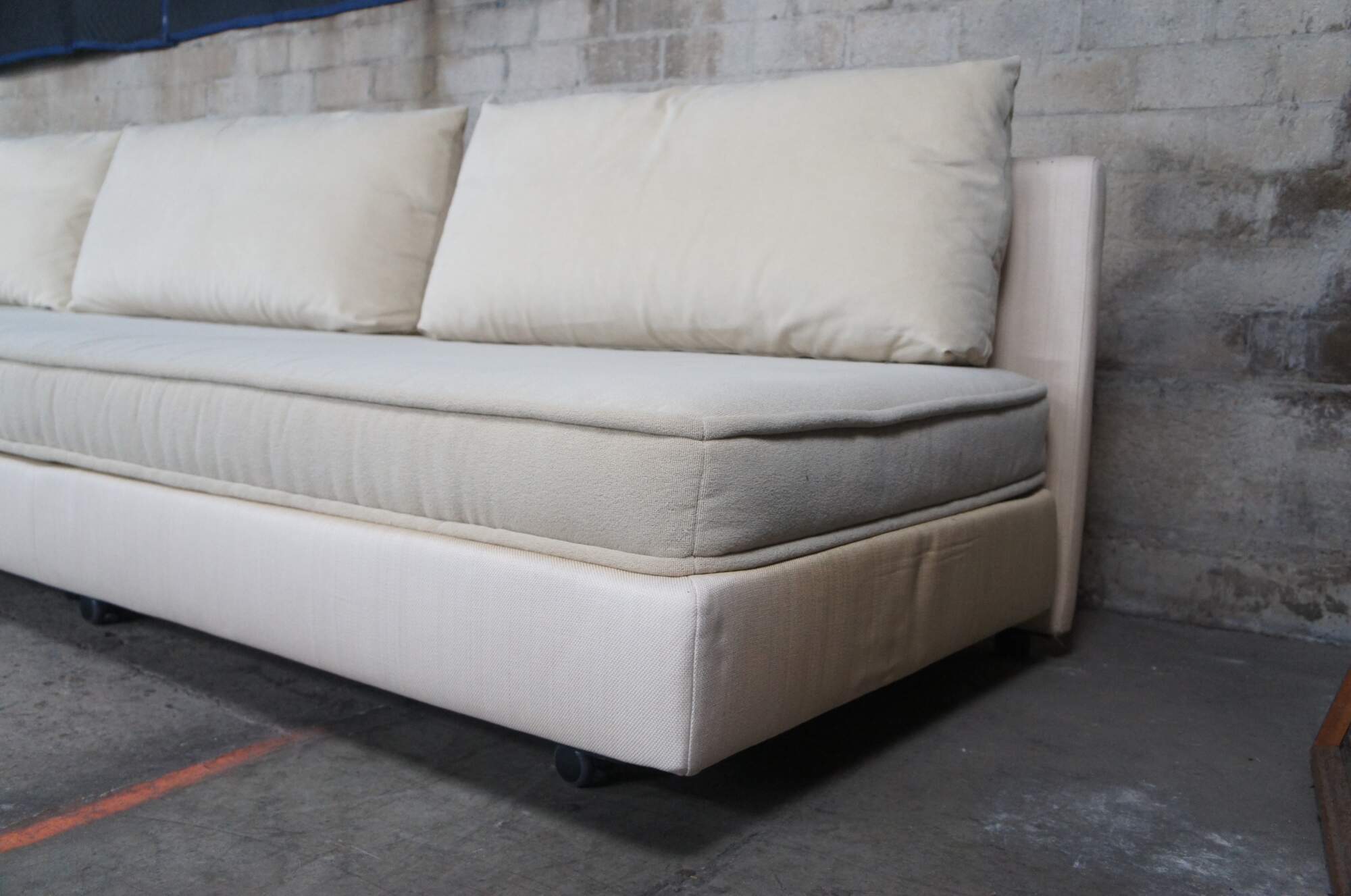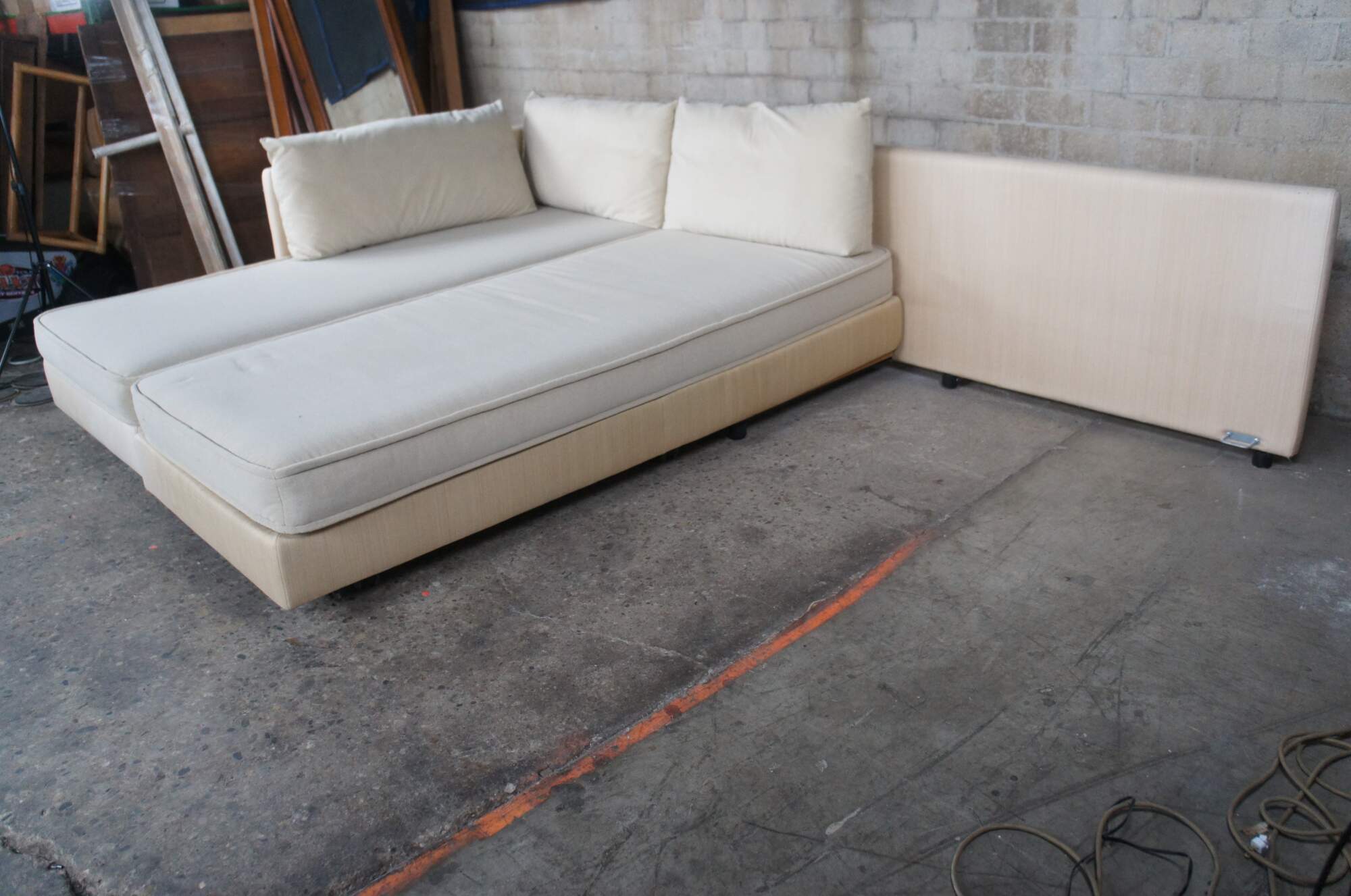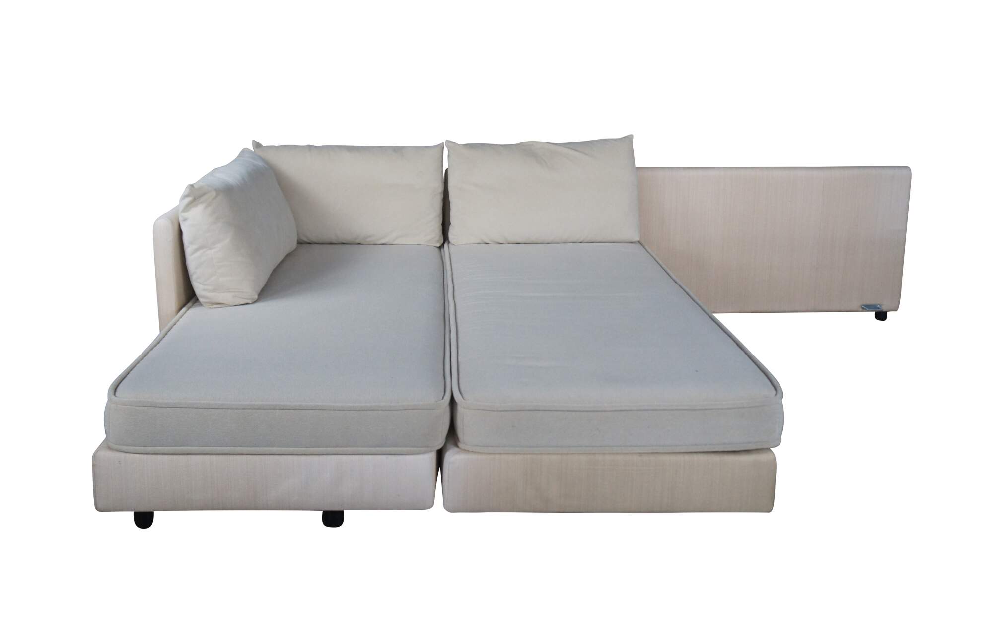 Ligne Roset Nomade II convertible sofa. Ligne Roset is a family business known for its unabashedly modern approach to design, an approach exemplified by this gorgeous sofa. Tastefully covered in a cotton-and-linen blend fabric. The sofa has a smooth feel and timeless details, The back side is positioned on a track allowing it to swivel out to create a queen bed or it can be used as two singles.