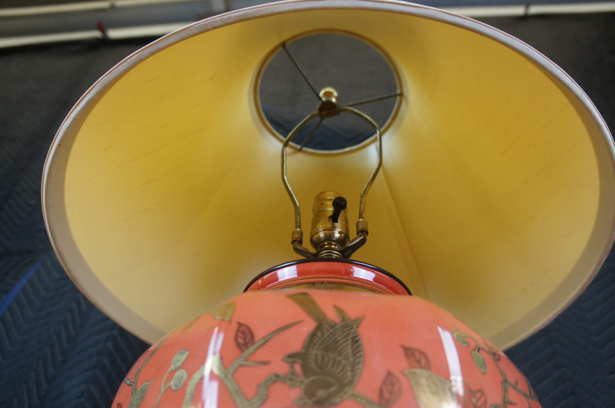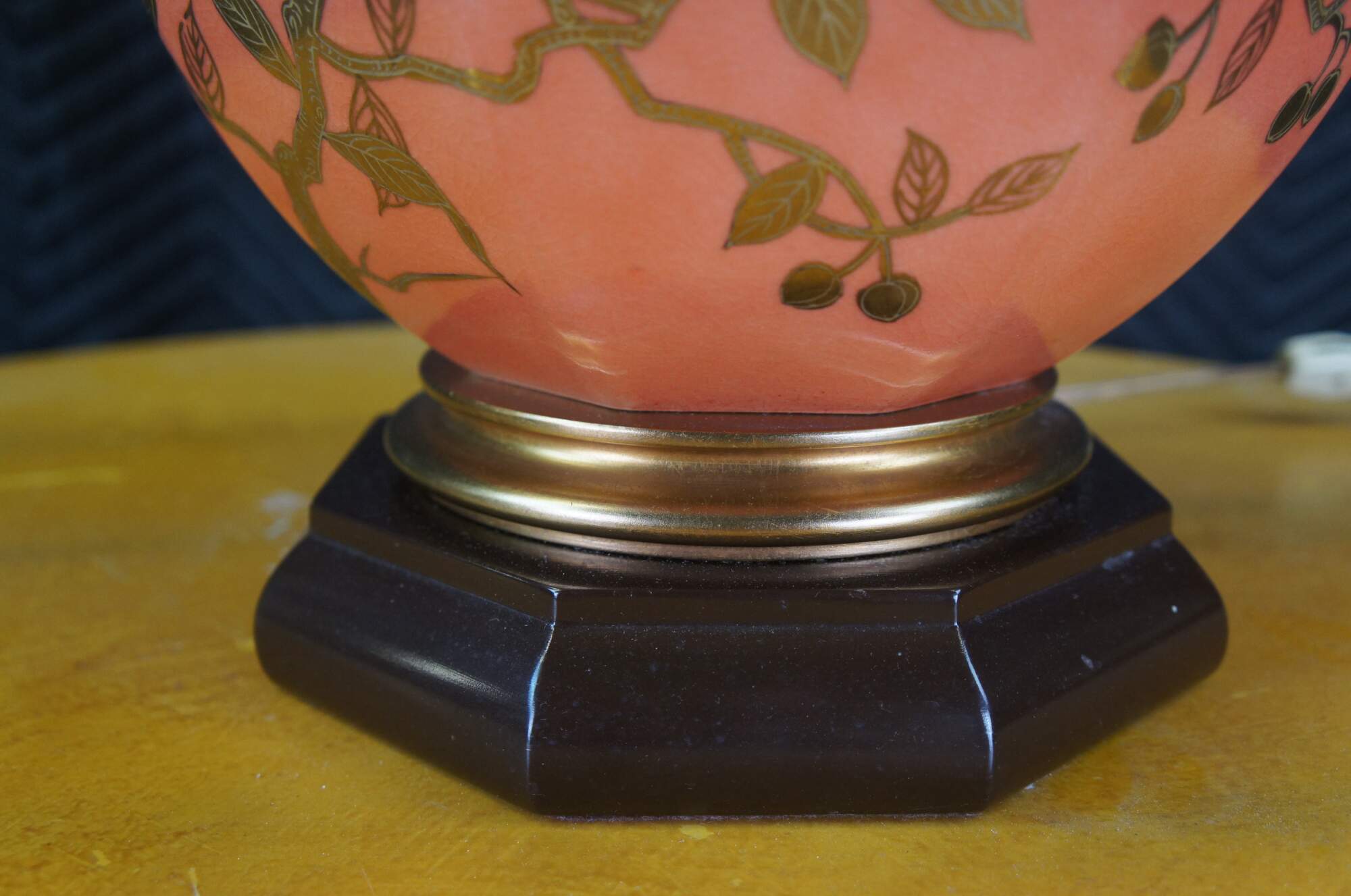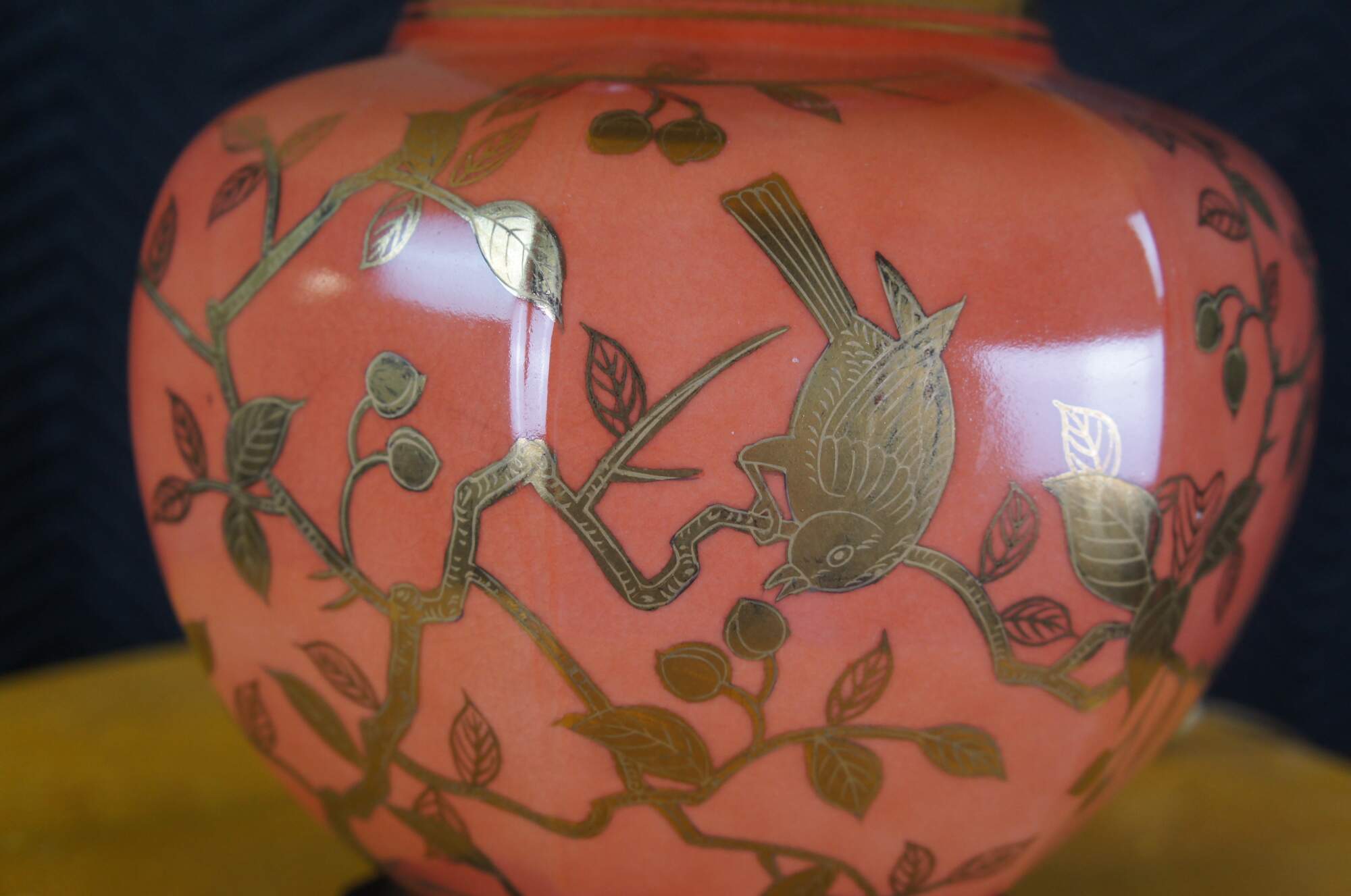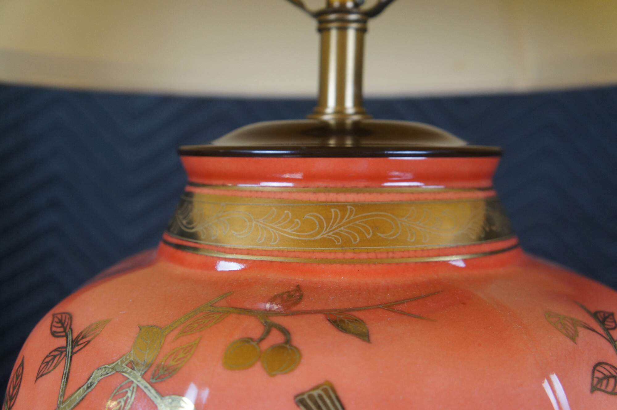 A beautiful polychrome table lamp in the form of a ginger jar. Made from porcelain with a peach/pink background and gold overlaid berry branch design with birds. Features an octagonal base and matching shade.