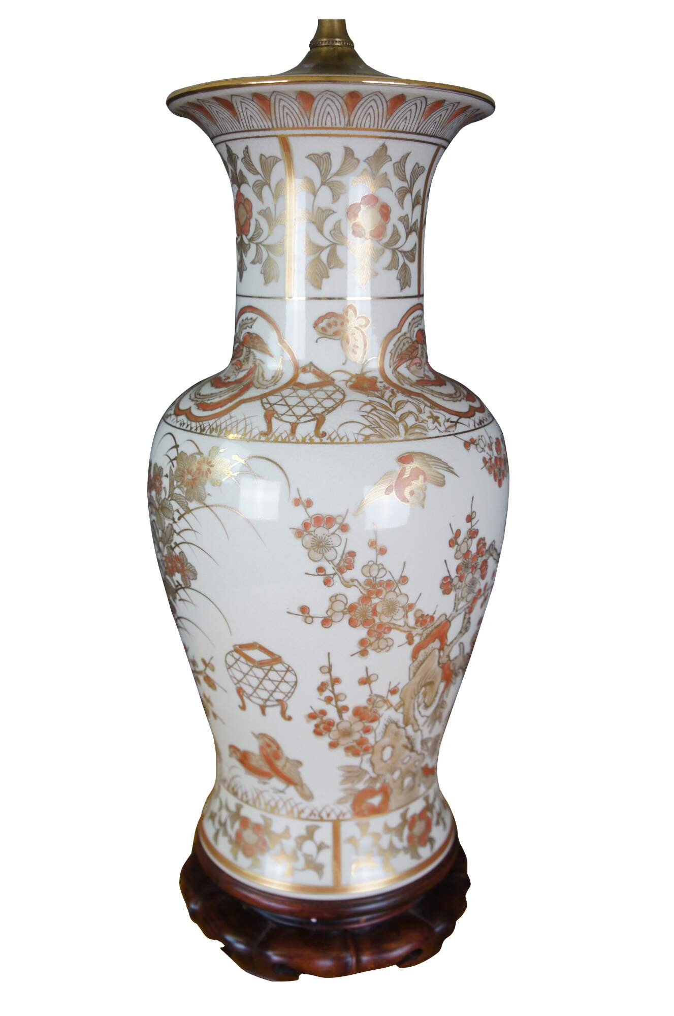 A Chinese porcelain table urn shaped table lamp. White with gold and orange colors. Features cherry blossoms and birds. The lamp is mounted to a wooden base. Features a jade finial and new shade.