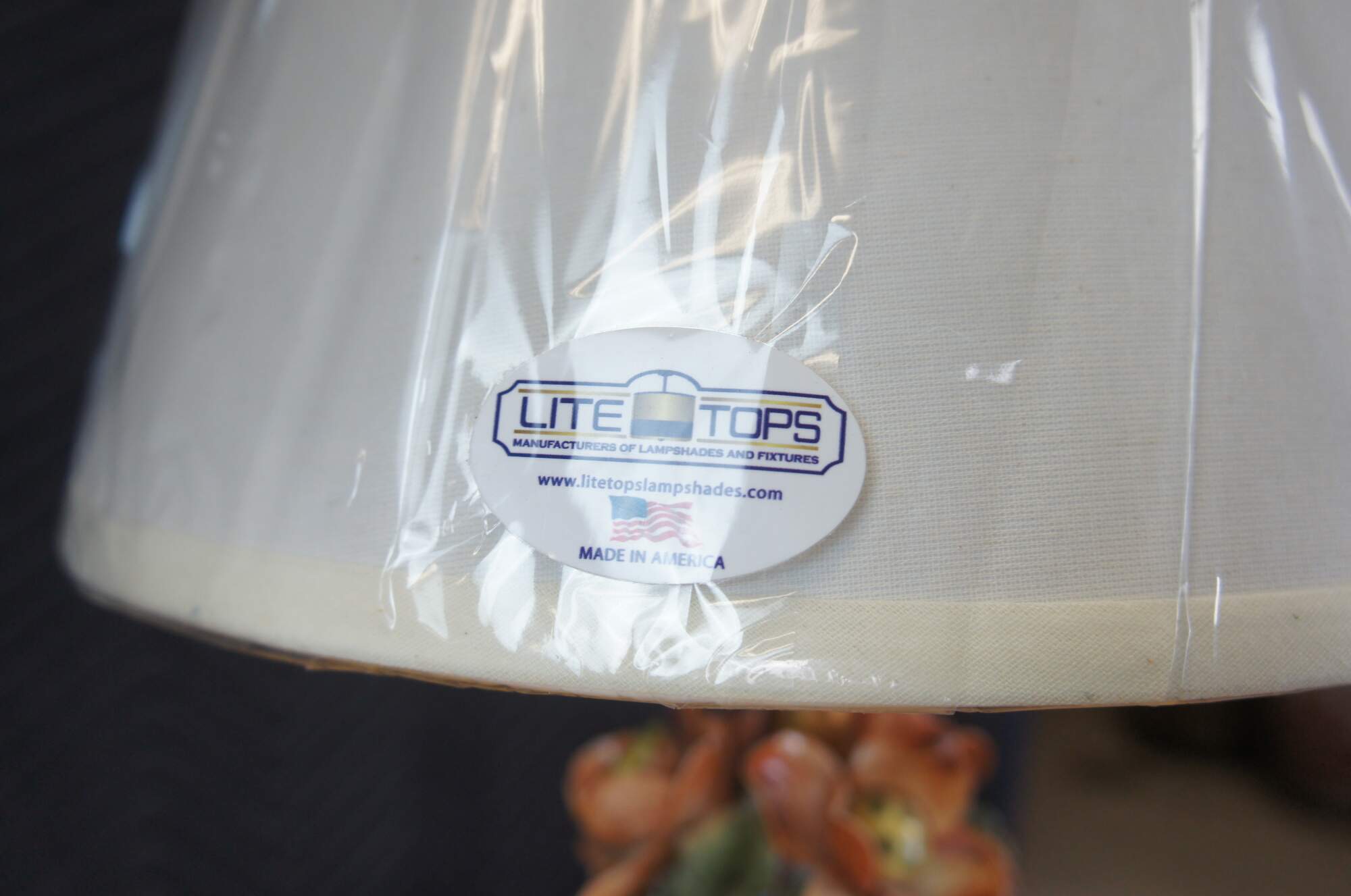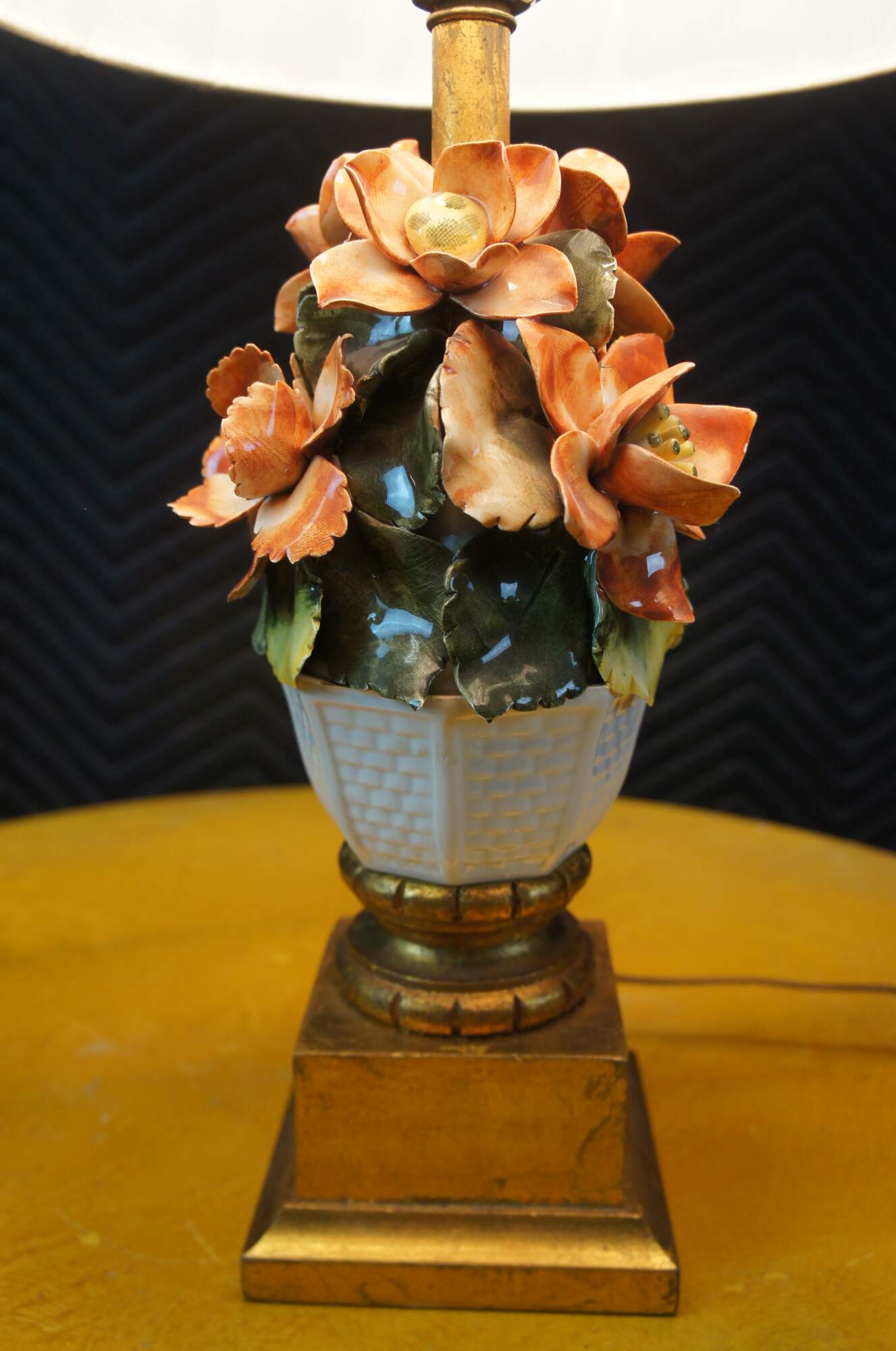 Vintage Italian style table lamp featuring a flower vase over a gold painted wooden base. Includes a new shade.