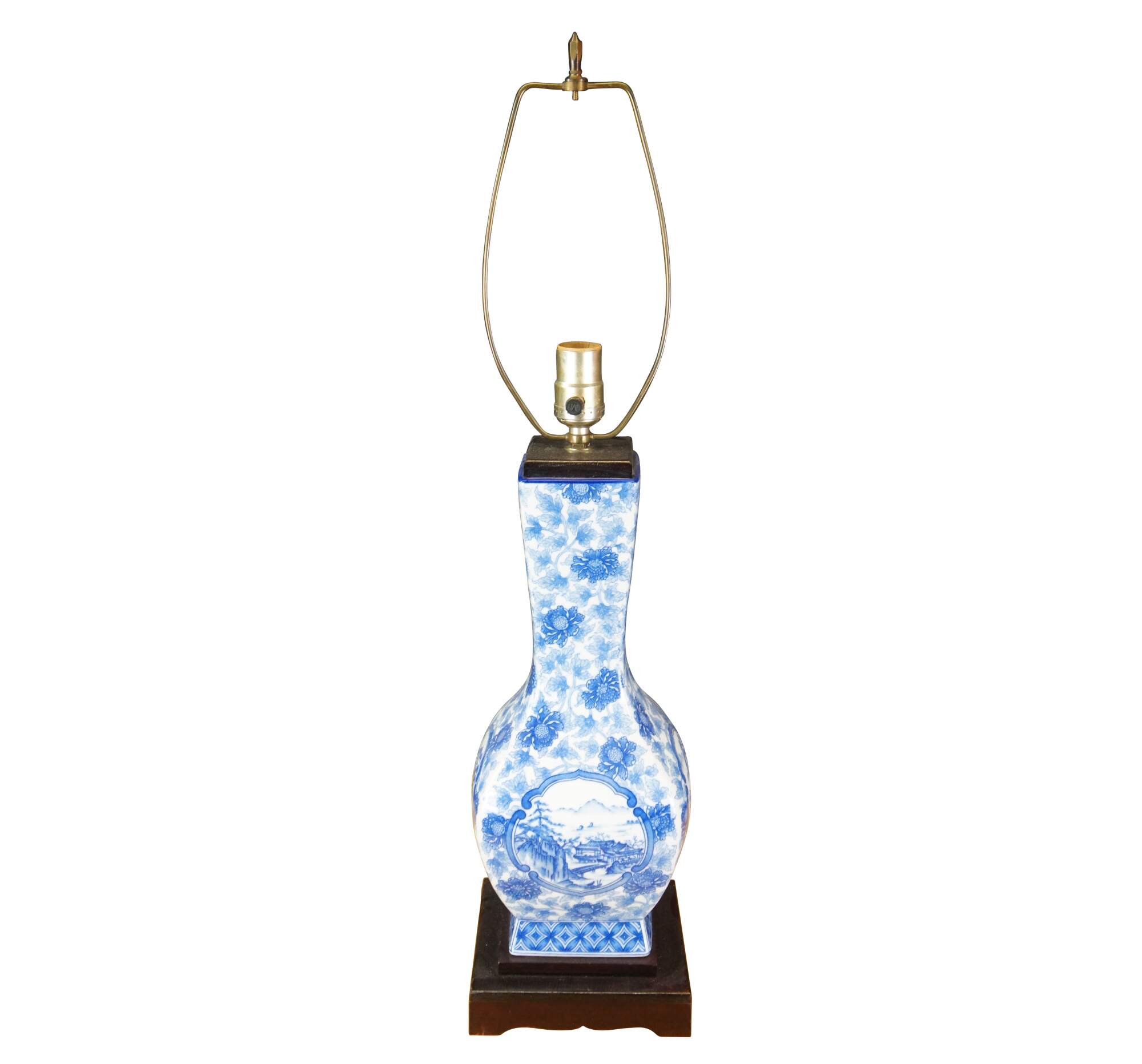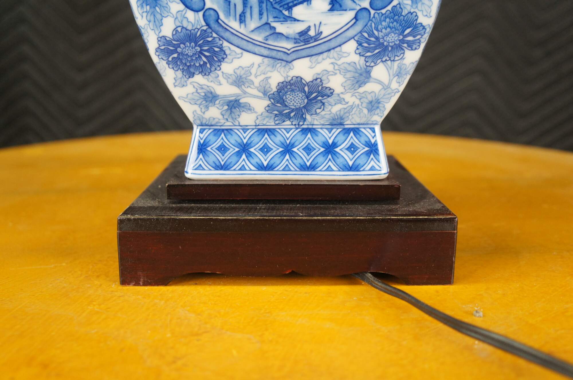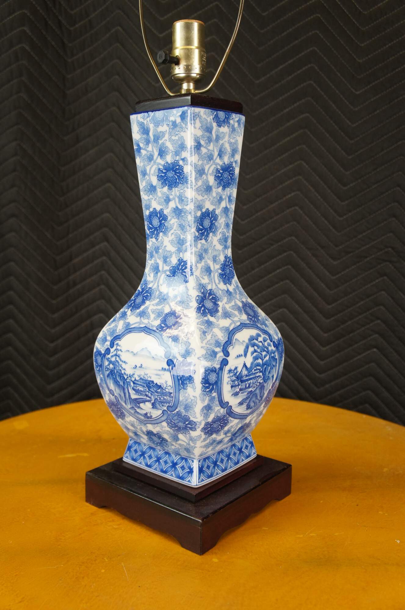 An elegant pair of Chinese table lamps in the form of a vase or urn. The blue and white porcelain vases features a field of Chrysanthemums with a pagoda landscape scene. Each lamp is on a wooden base.