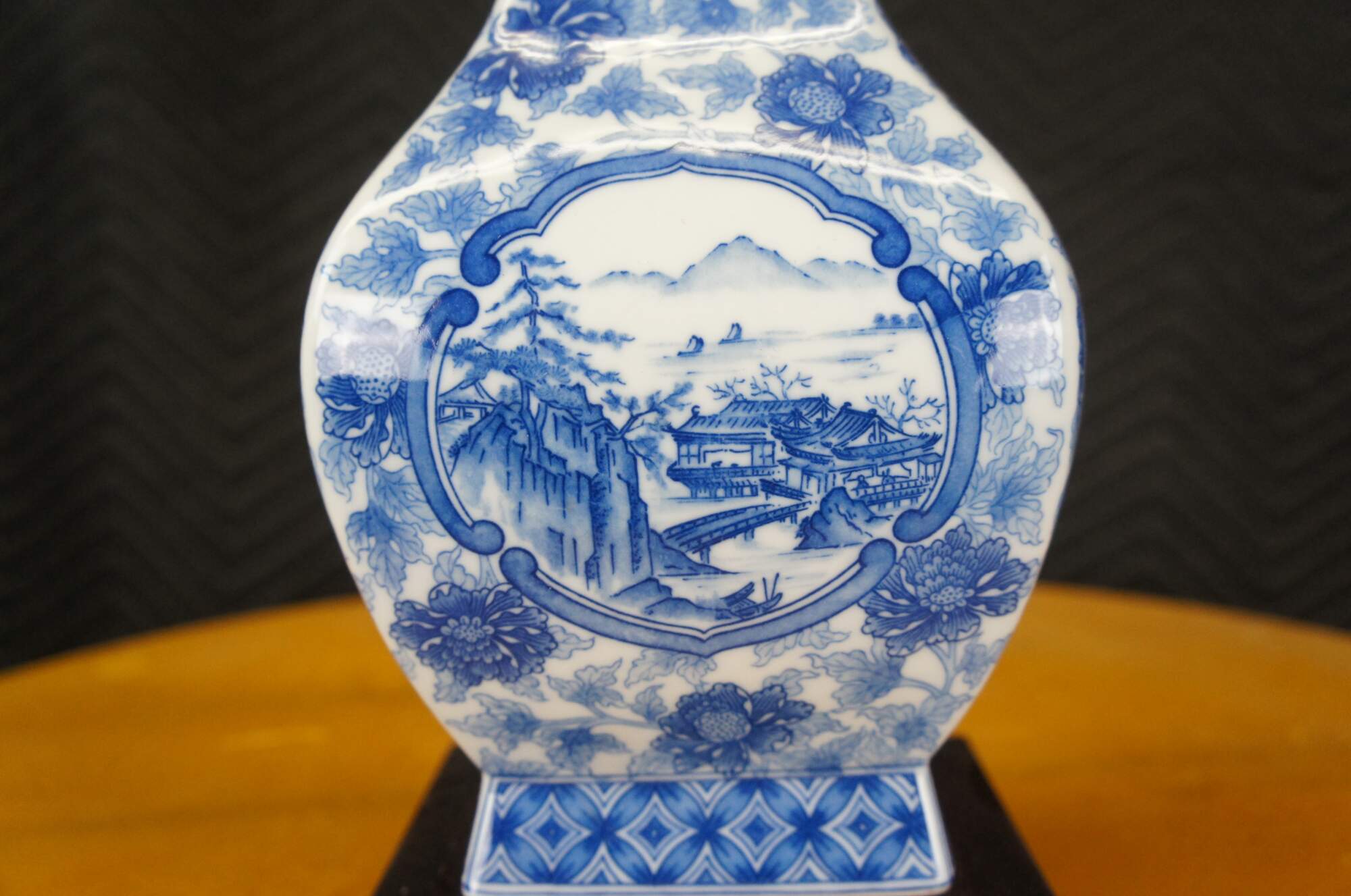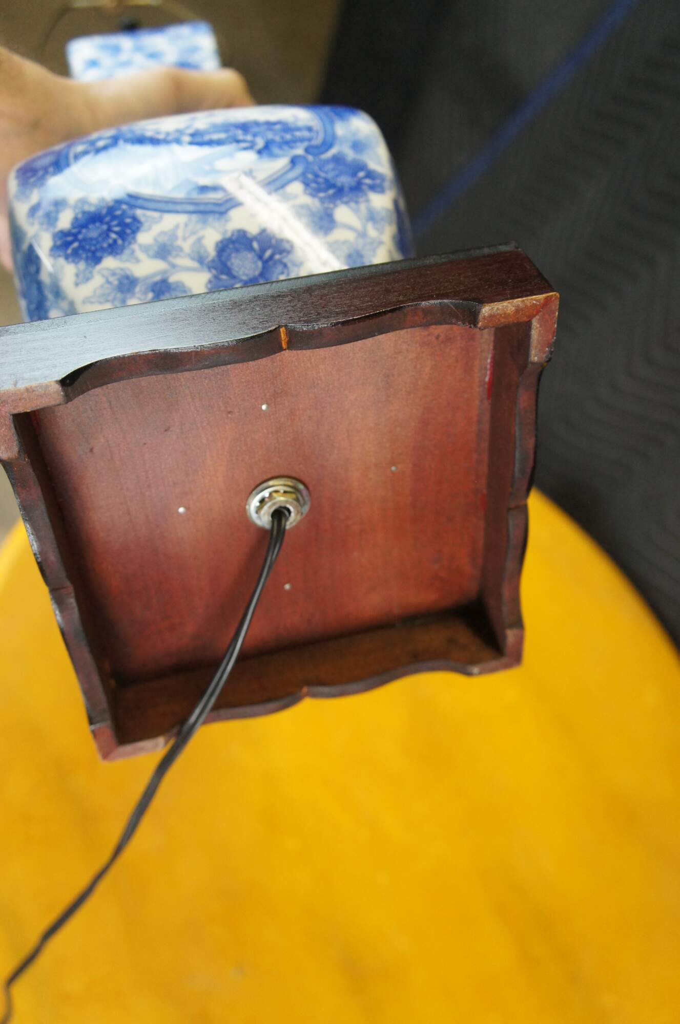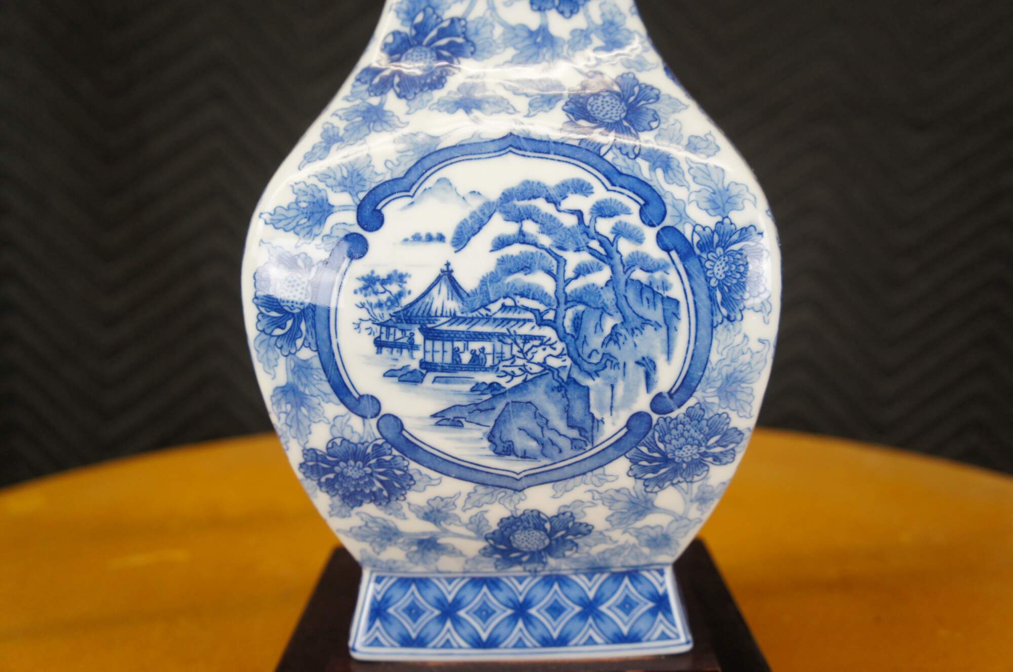 An elegant pair of Chinese table lamps in the form of a vase or urn. The blue and white porcelain vases features a field of Chrysanthemums with a pagoda landscape scene. Each lamp is on a wooden base.