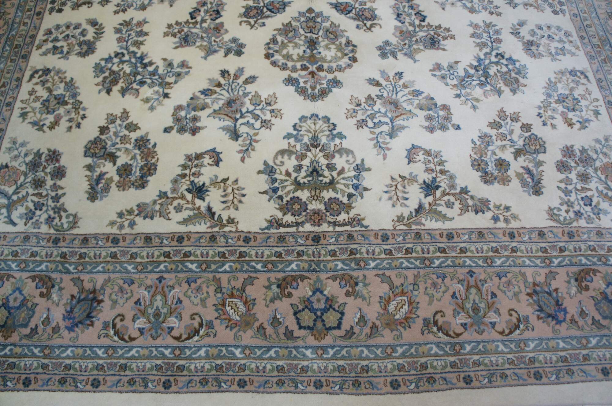 Vintage Indo area rug by Royal Rugs, circa last quarter 20th century. Handmade from 100% wood. Features a floral all over pattern with beige/creme, peaches and blues. Royal rugs has been in business since the 1950s. The company was started by a first generation rug maker after the Chinese invasion of Nepal.