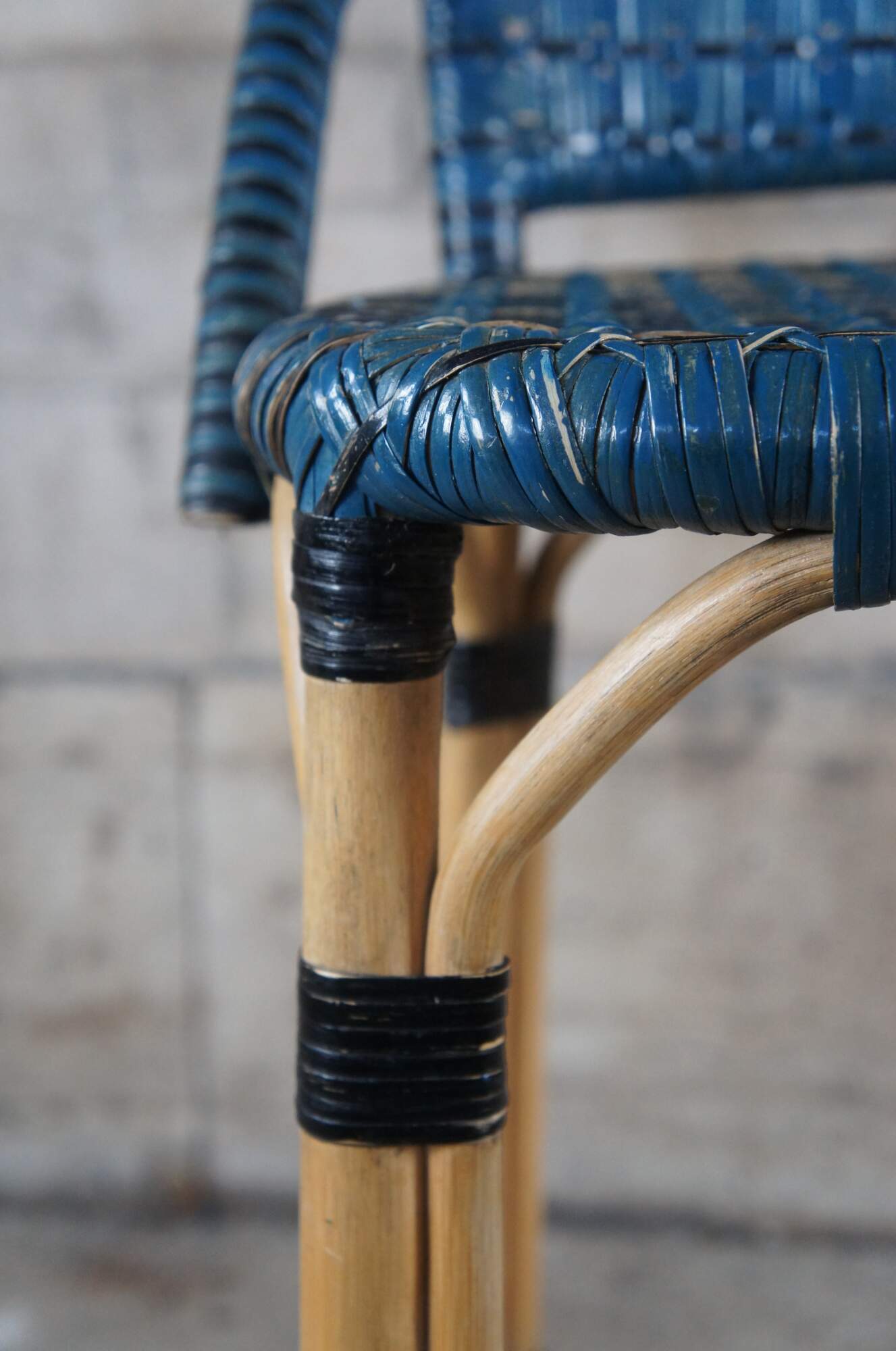 3 vintage bohemian counter height stools after Maison Gatti, circa 1970s. Made from Bamboo and blue woven rattan. Feature a sleek bentwood design with black accents