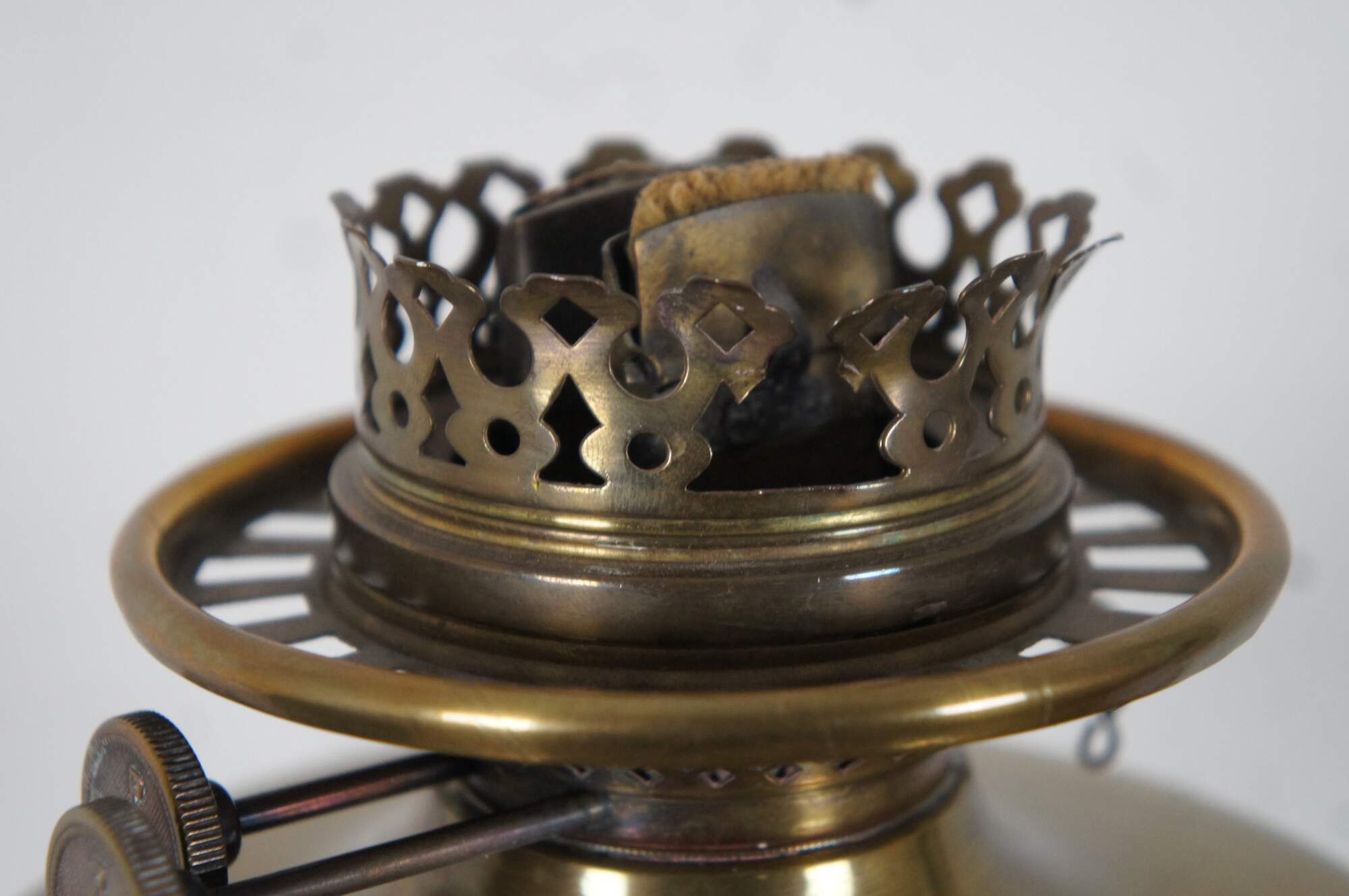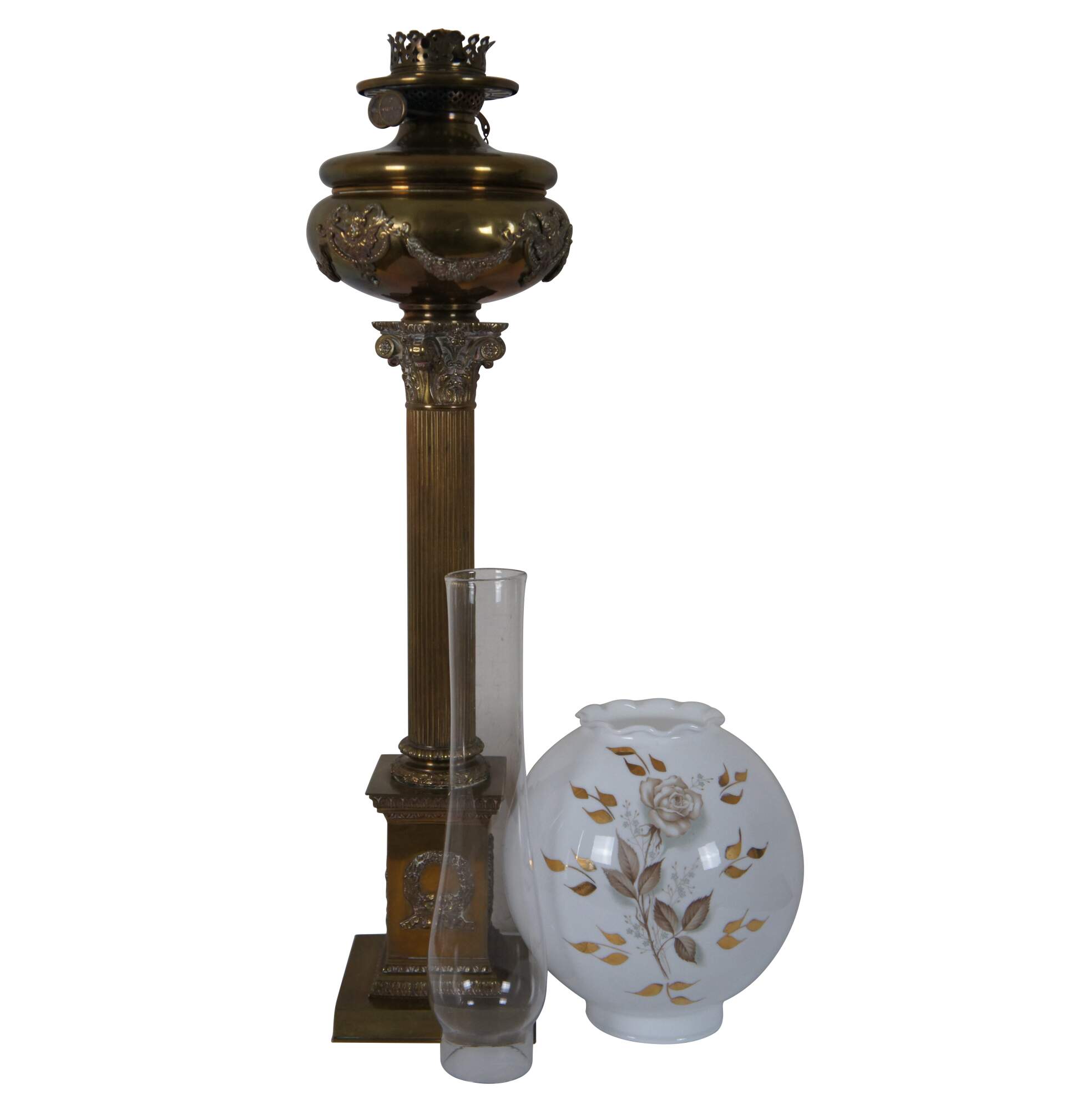 An exquisite Antique English brass Duplex oil lamp , featuring a tall base in the shape of a Corinthian column festooned with cherub / satyr faces and laurel wreaths / swag. The milk glass shade features a scalloped upper edge and transferware brown rose accented with hand painted gilding. Lamp contains a double wick. Hole in side of base indicates the beginning of conversion to electric.