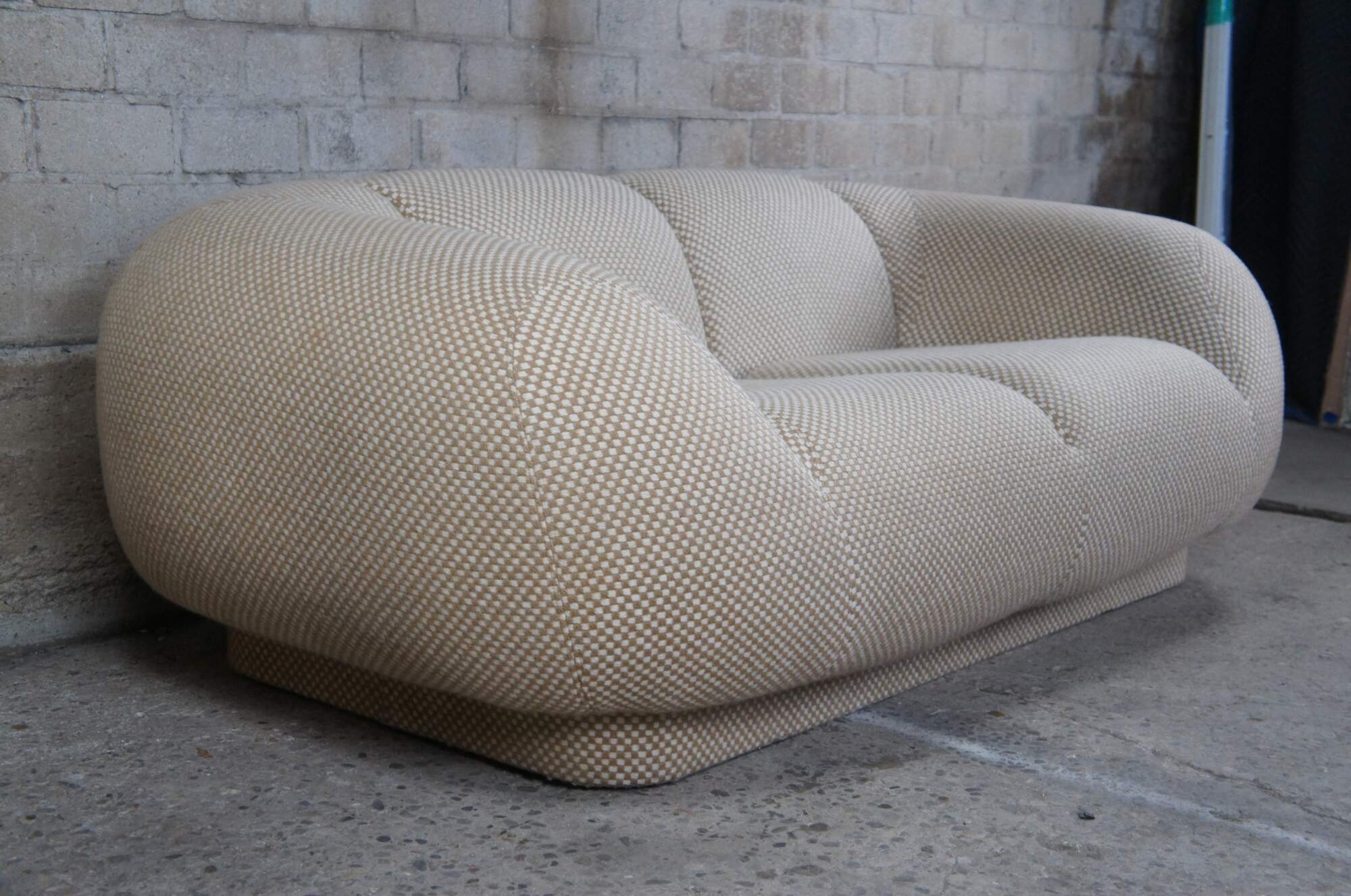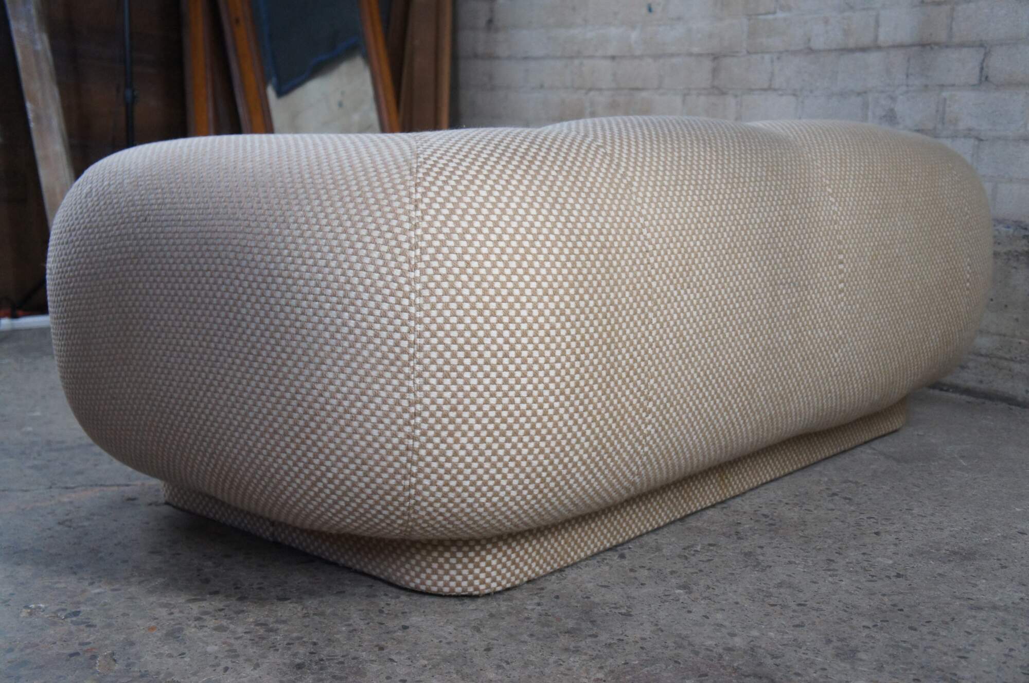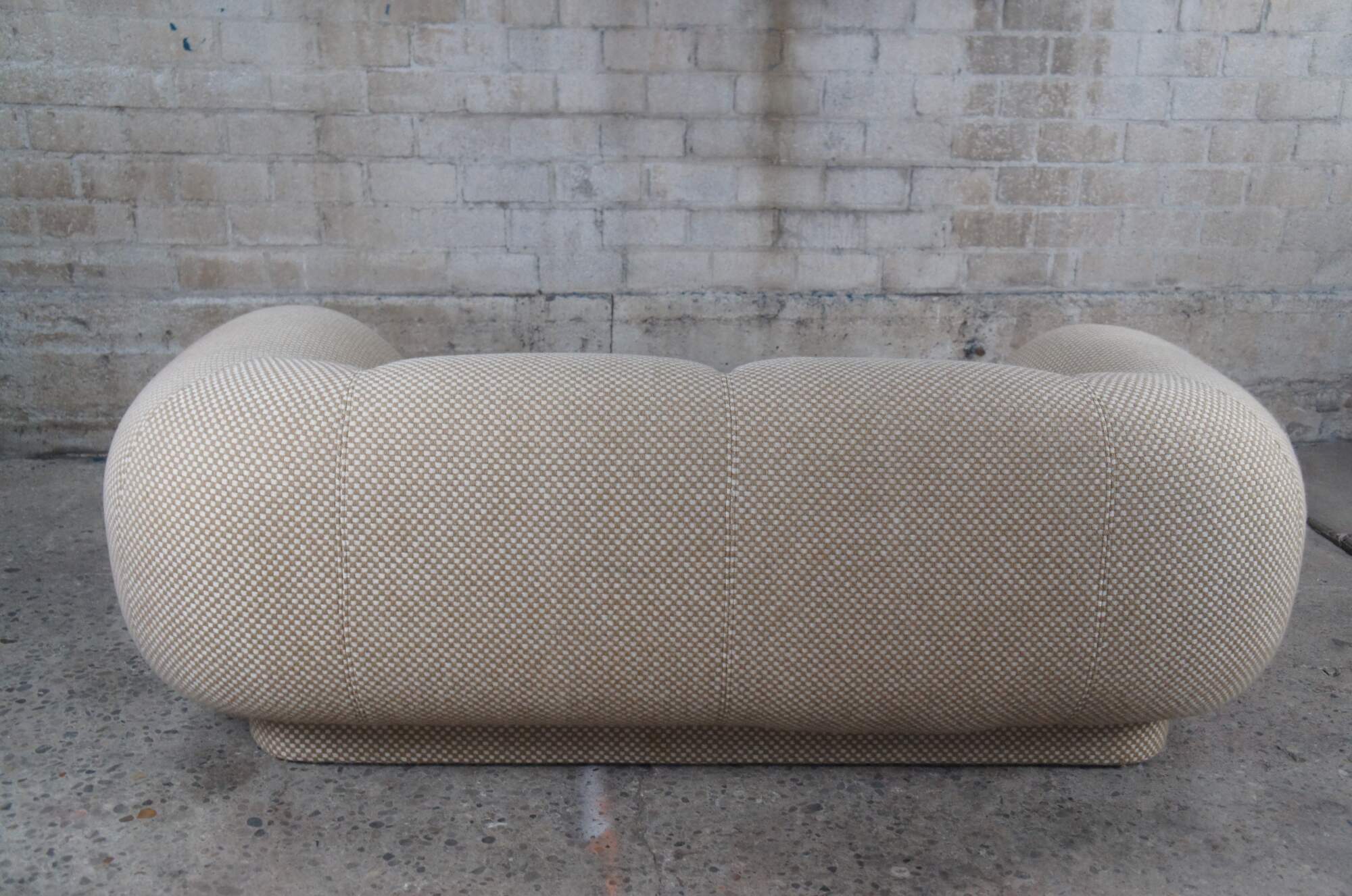 An iconic pair of Steve Chase "Amphibious" sofas for Preview, circa 1970s. Features the original checkered wool upholstery with an architectural marshmallow frame over a plinth base.