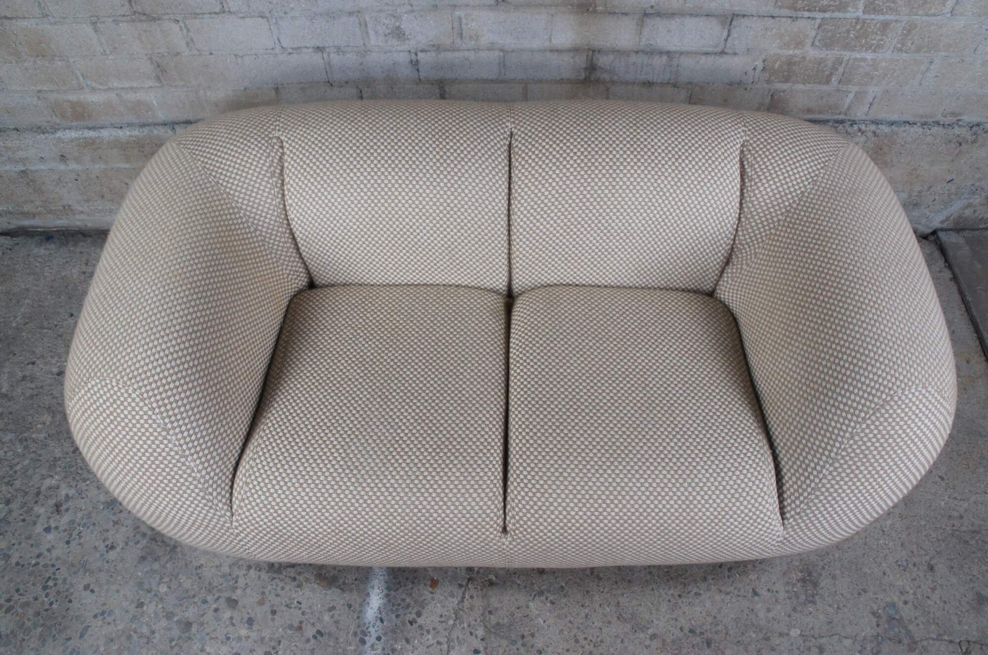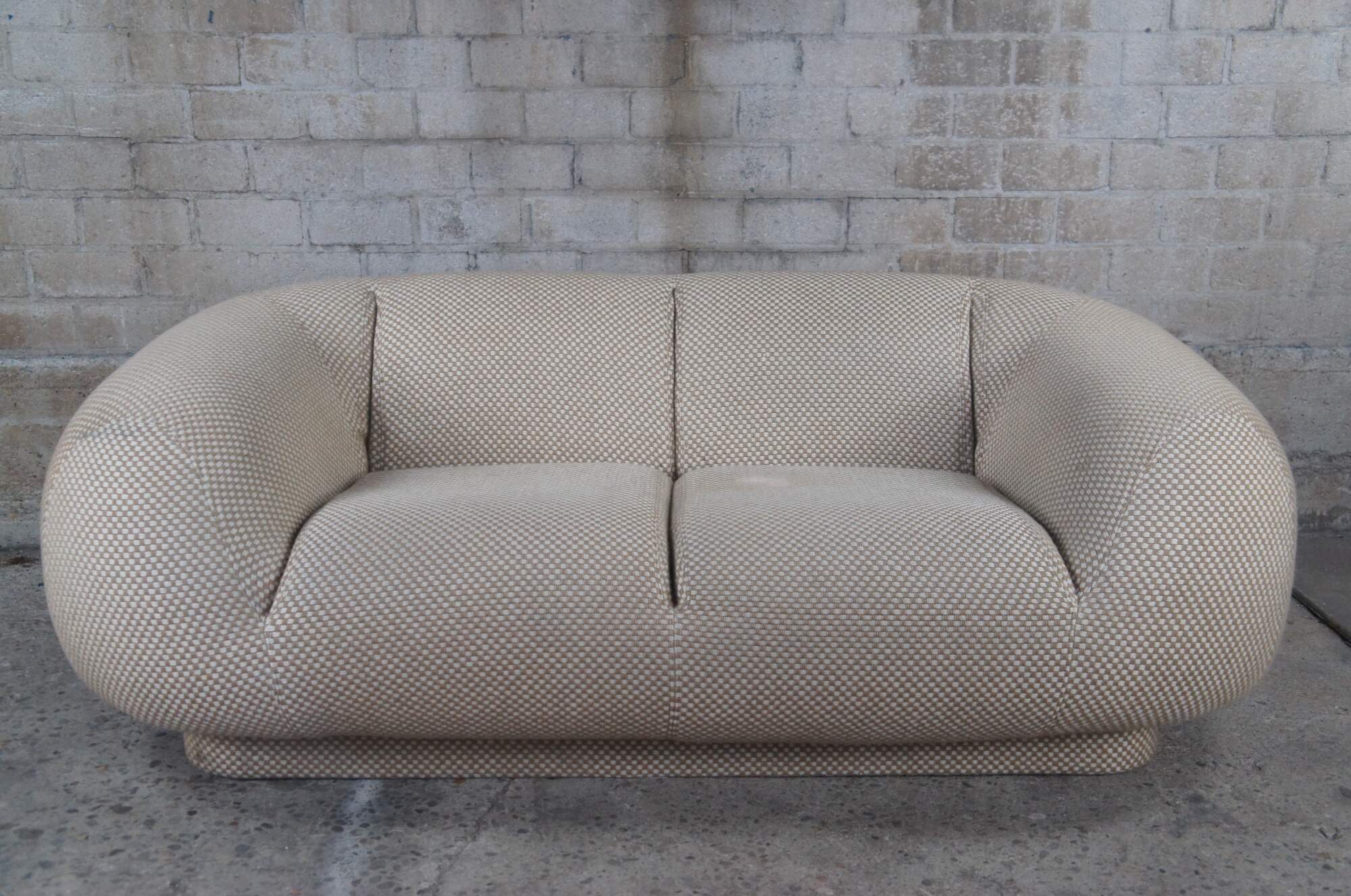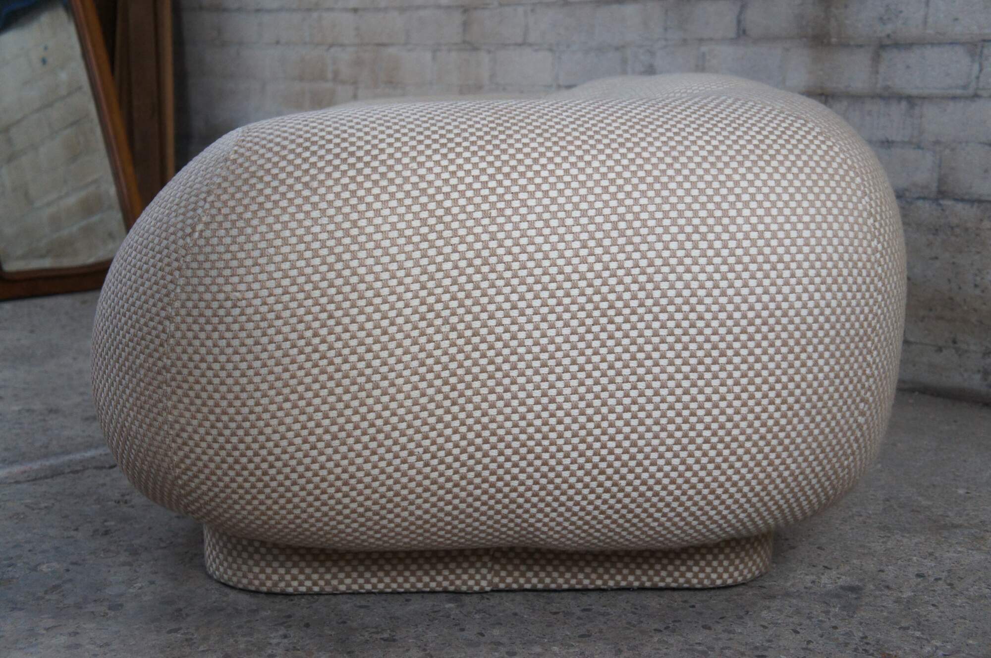 An iconic pair of Steve Chase "Amphibious" sofas for Preview, circa 1970s. Features the original checkered wool upholstery with an architectural marshmallow frame over a plinth base.