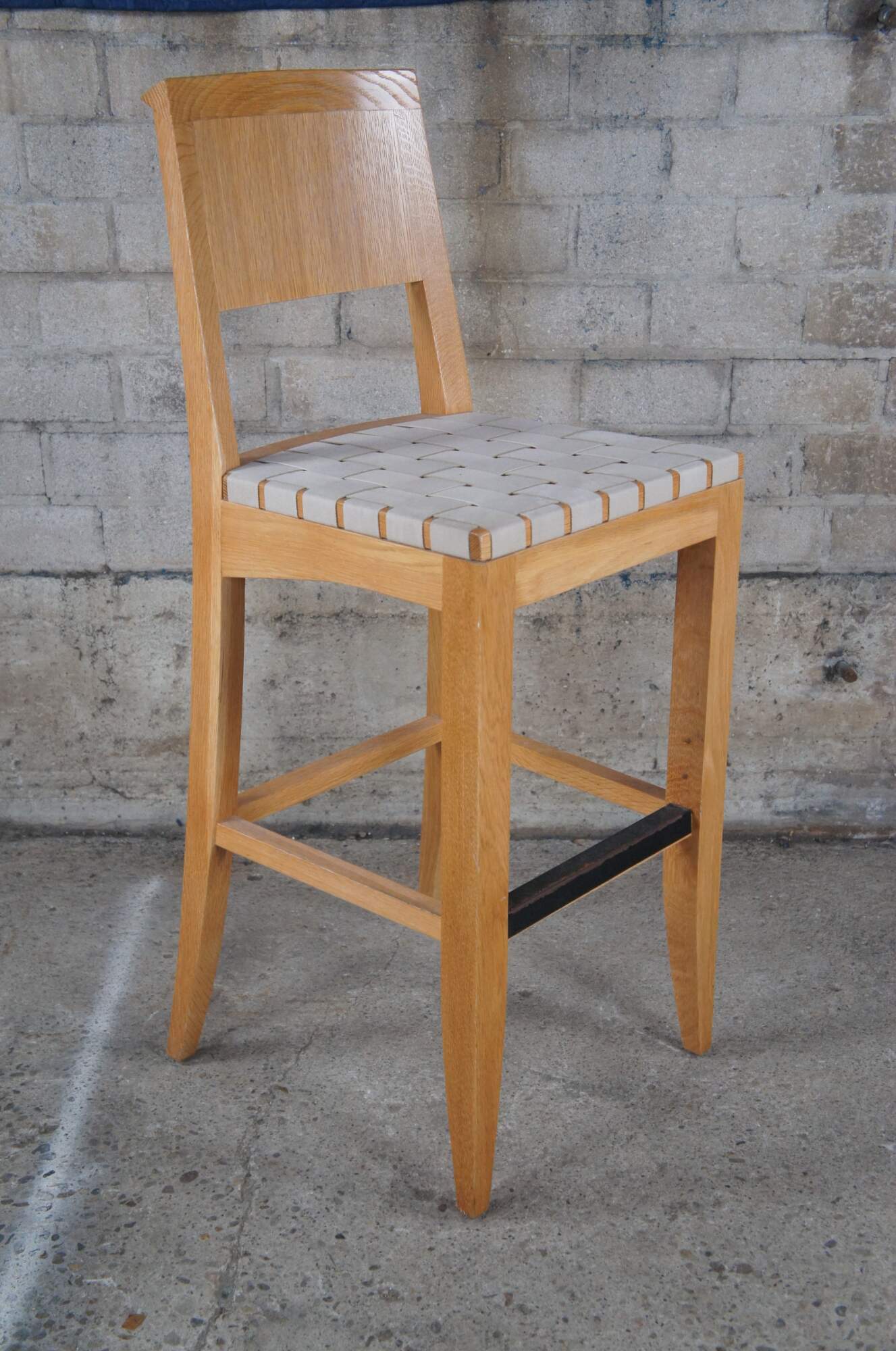 A sturdy set of solid oak bar stools with woven strap seats. Features a foot rest with metal cover and triangular cut crest rail.