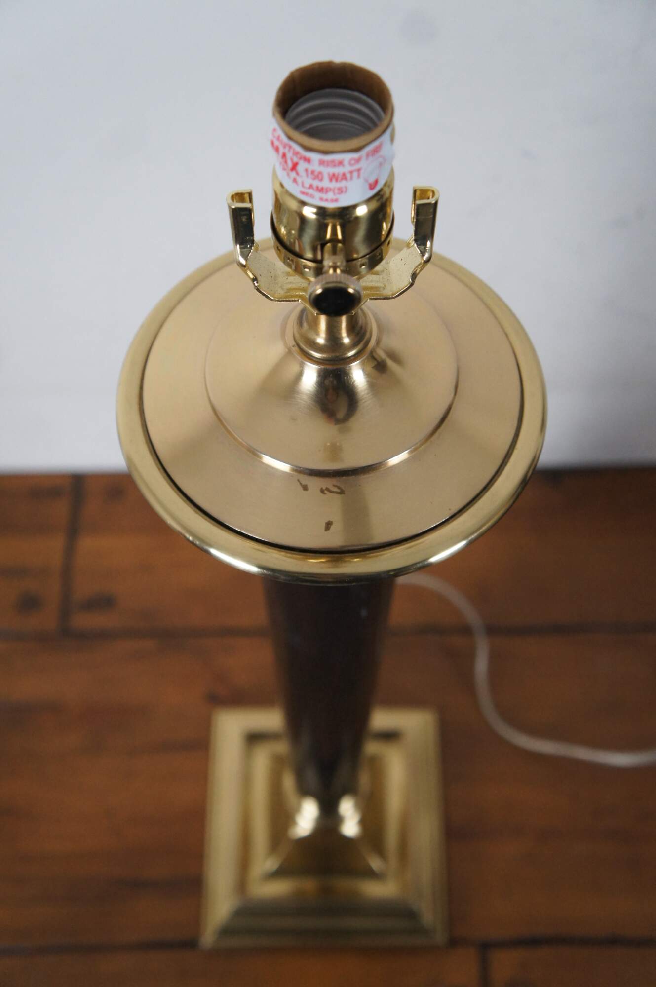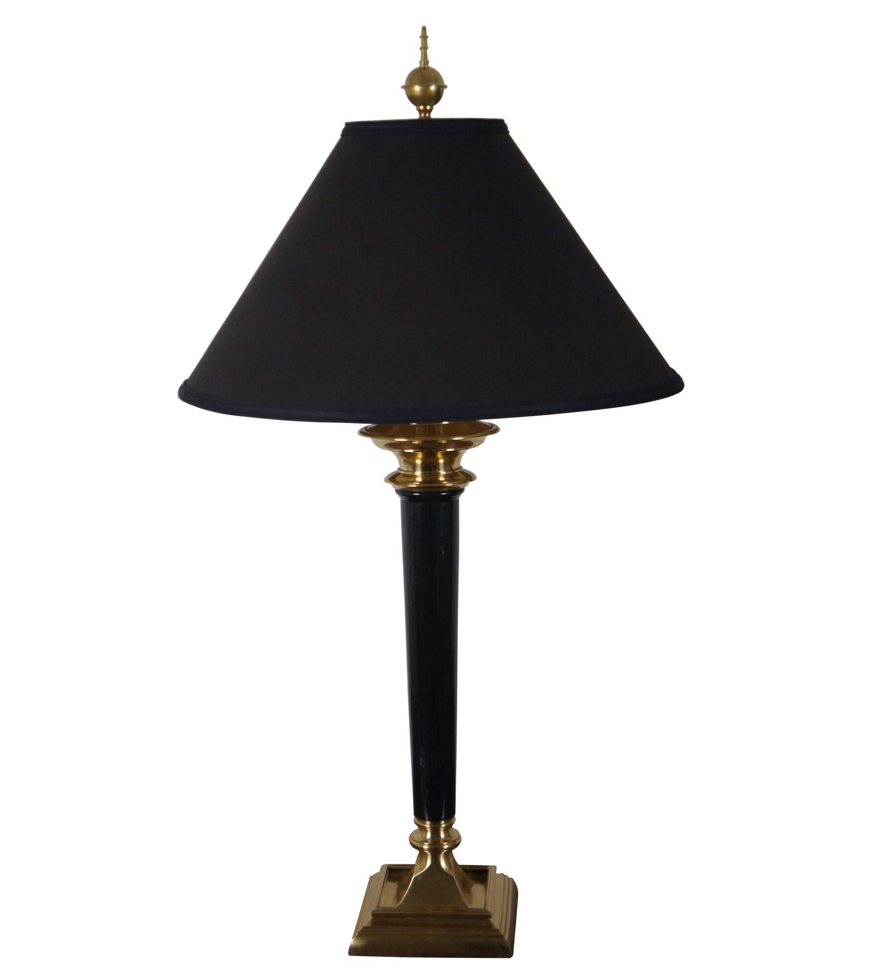 Pair of vintage American Empire or Regency style brass and black marble torch shaped table lamps by Speer Collectibles with spindle shaped finial and black shades with gilded interiors.