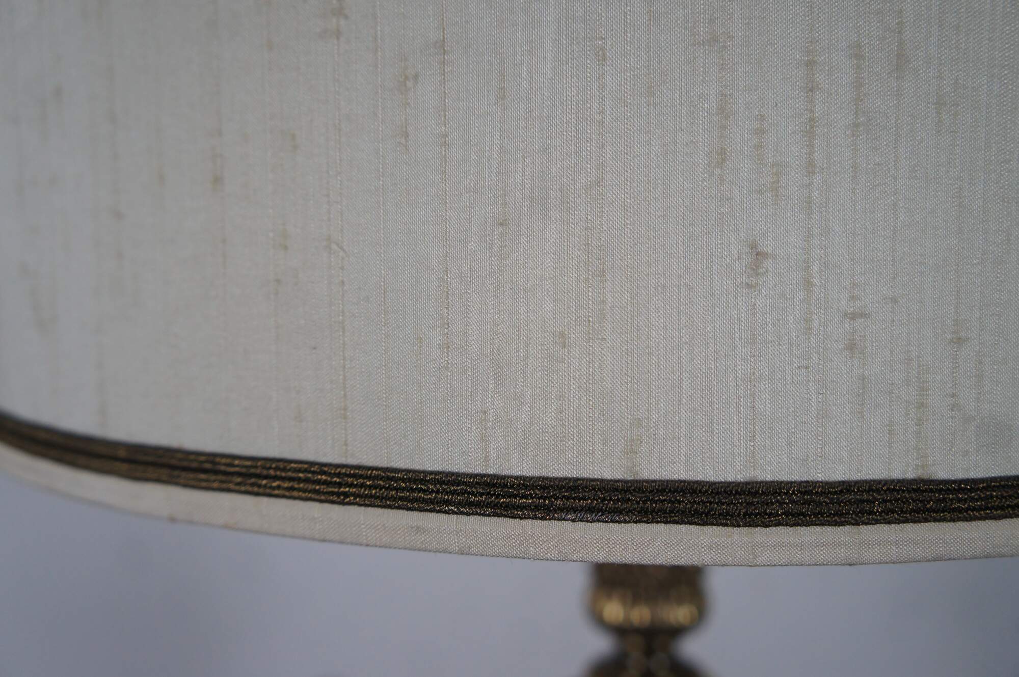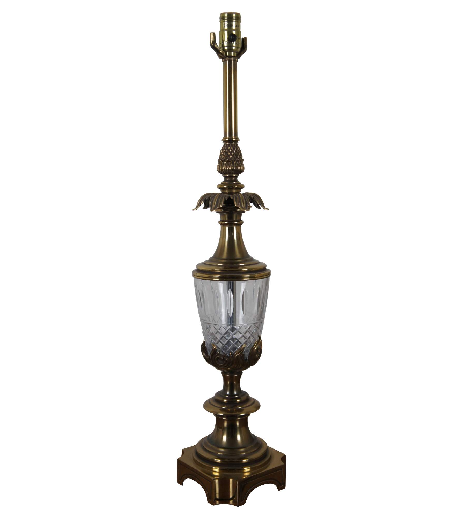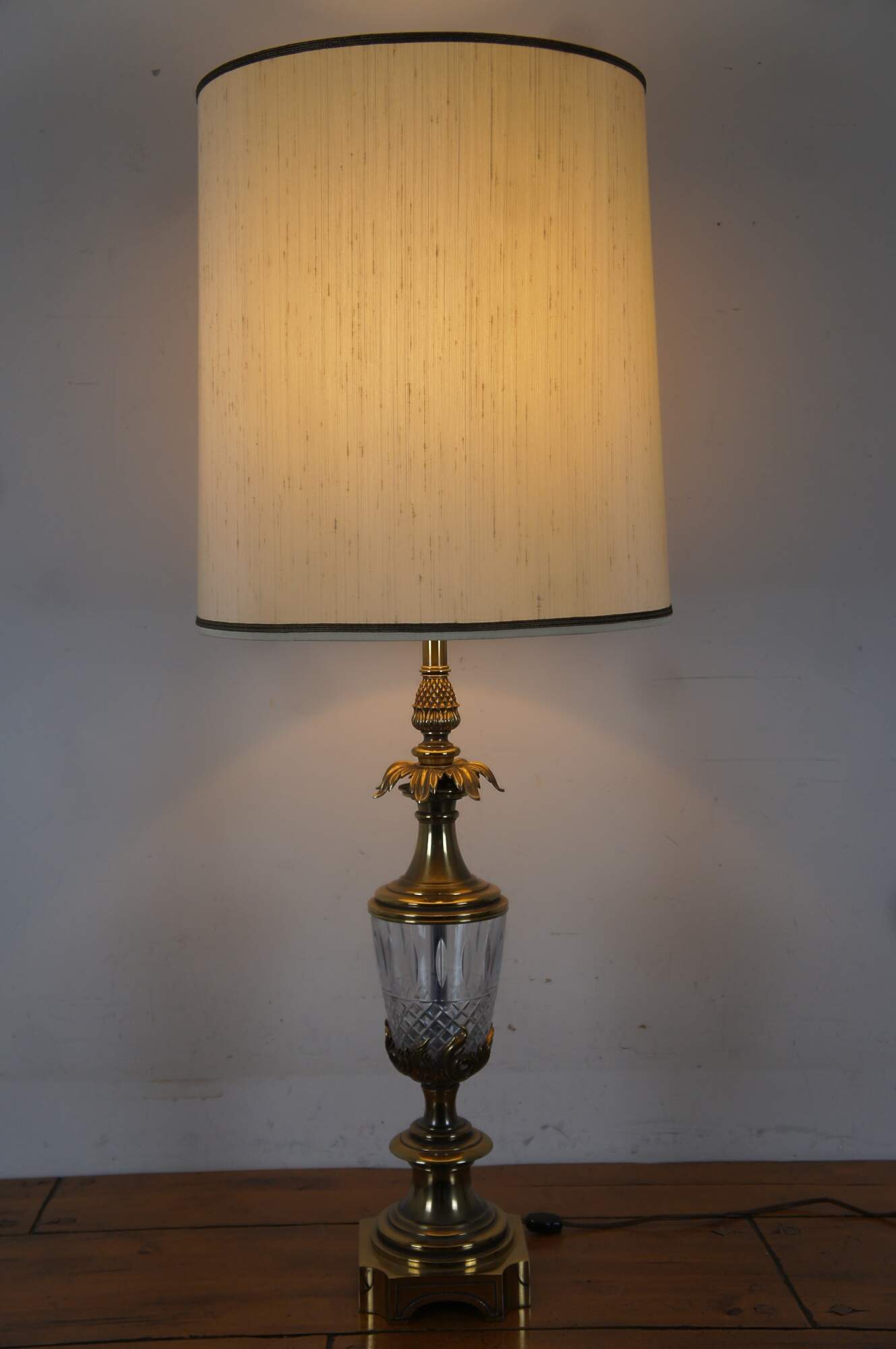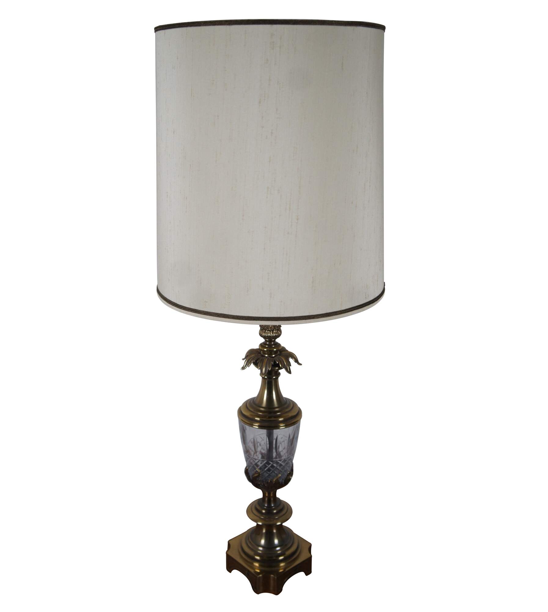 Vintage mid century Stiffel brass and cut glass pineapple, Hollywood regency style table lamp. Includes off white linen shade with metallic bronze trim.