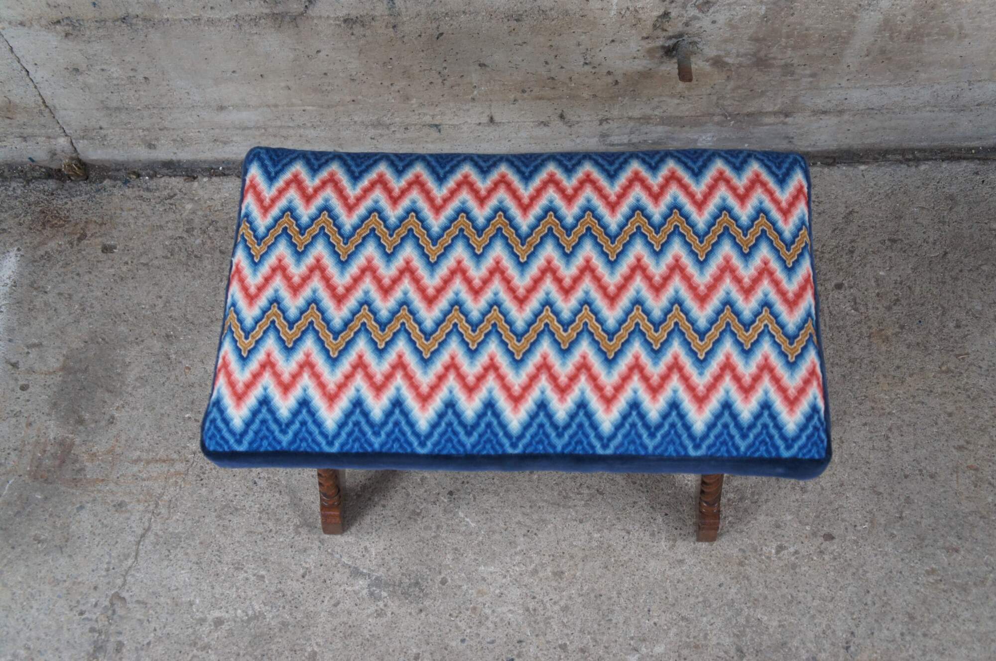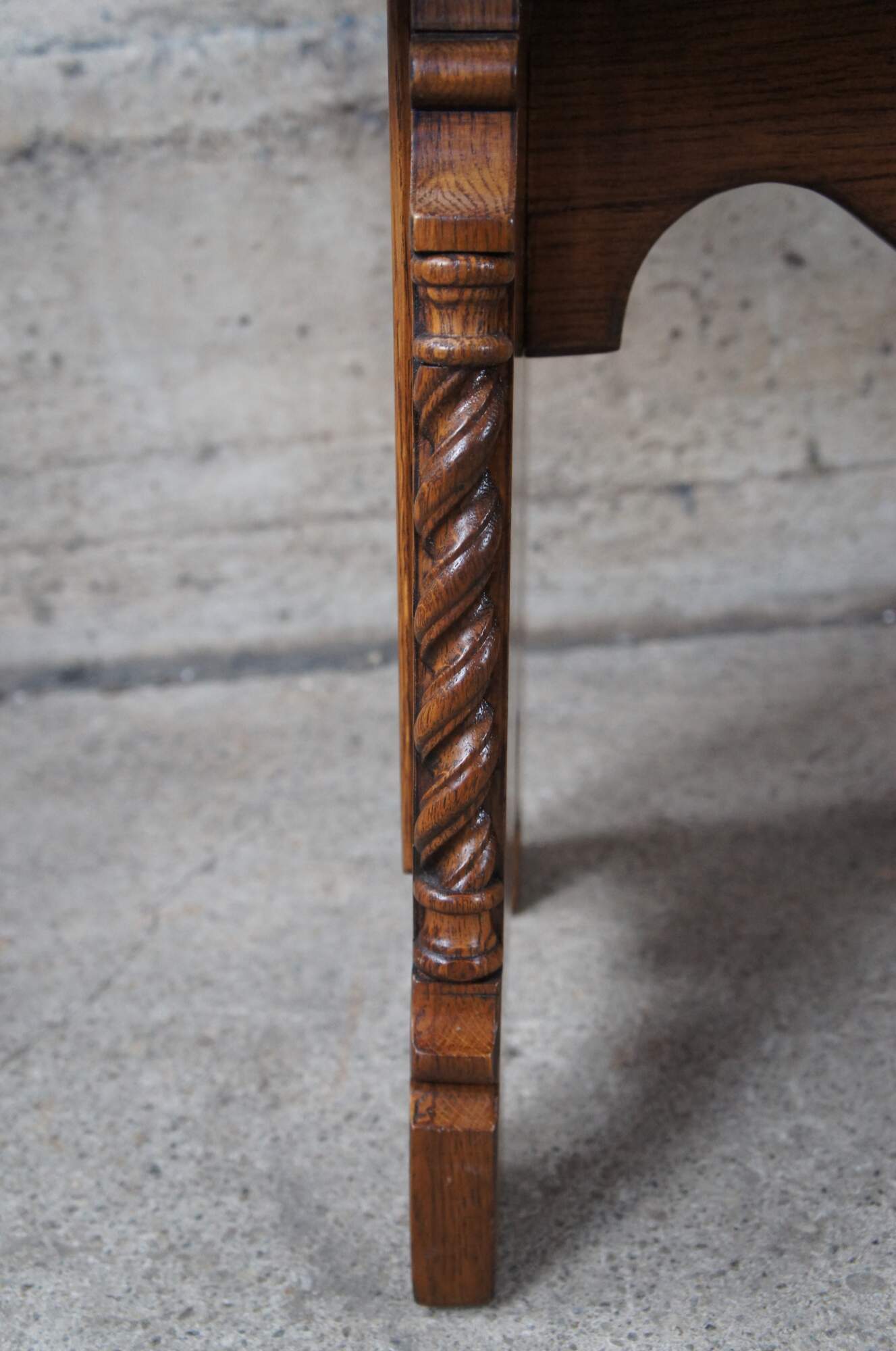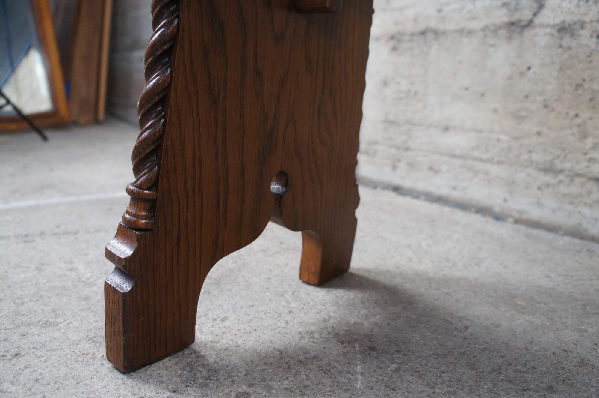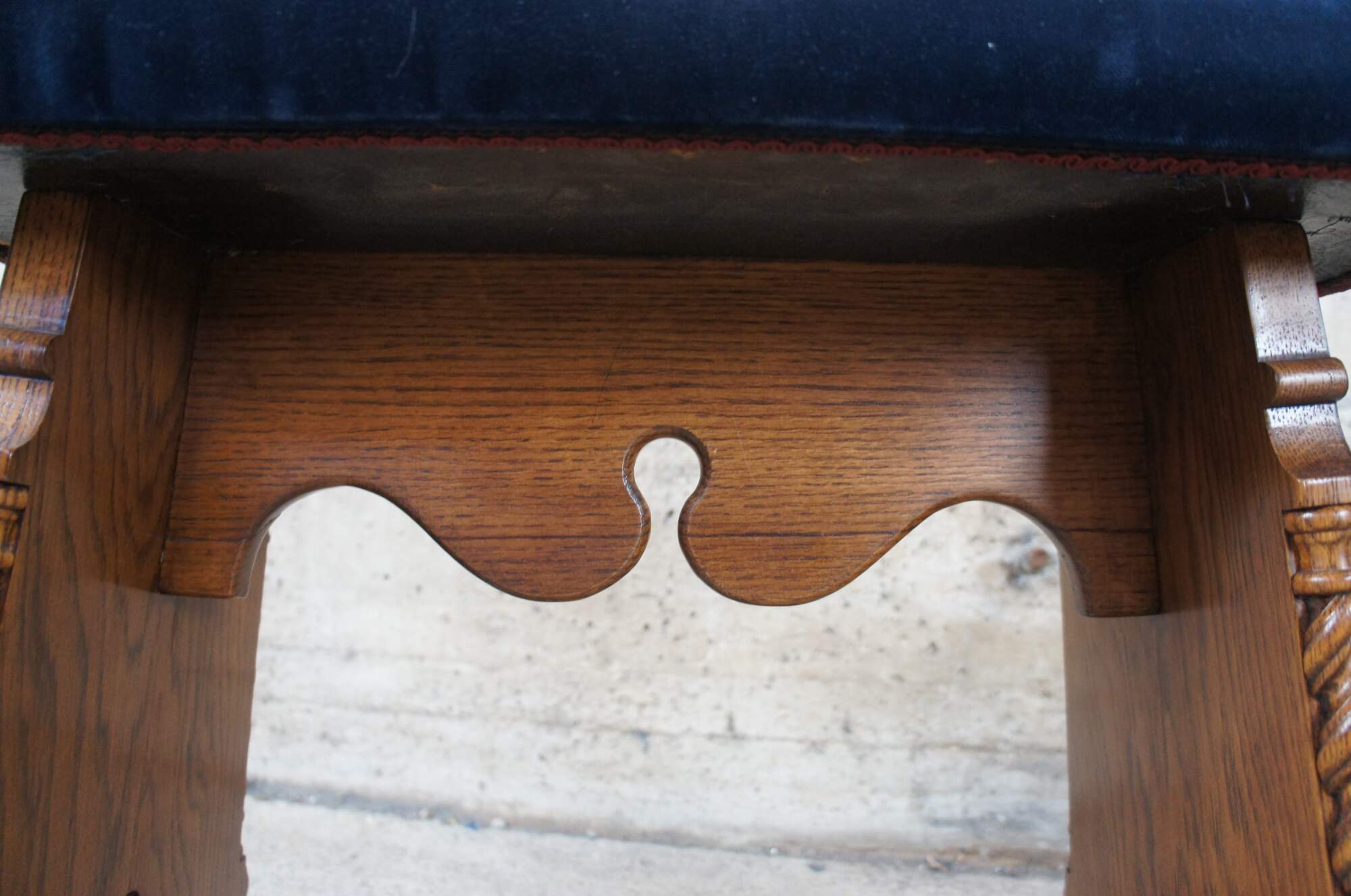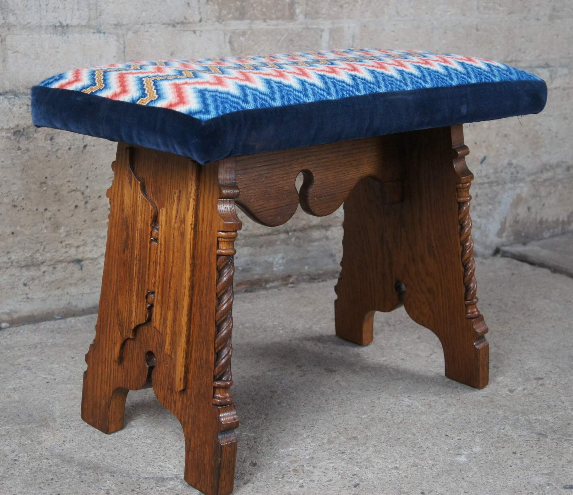 Antique American Furniture Company Gothic Revival vanity stool or piano bench. Made of oak featuring a rectangular zigzag upholstered seat over linen fold carved base with barley twisted accents.