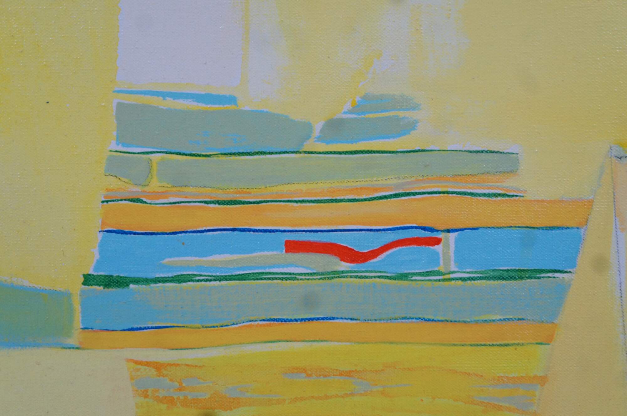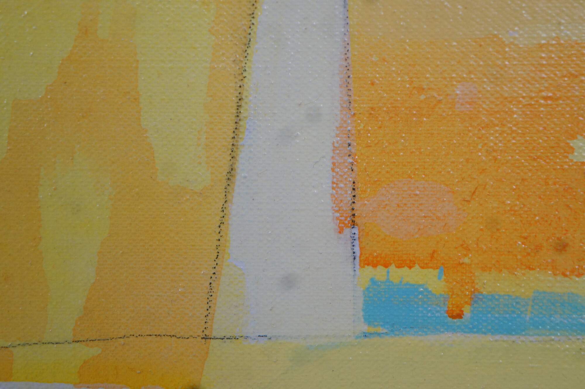 Vintage 1975 acrylic on canvas painting by Ohio born artist Todd Chalk titled “A Trip Around,” showing what appears to be an abstracted seascape with sail boats in an array of yellows, greens, and blues. This piece was once included in the Circulating Gallery of the Dayton Art Institute.