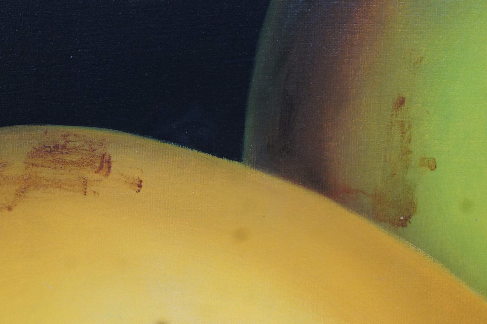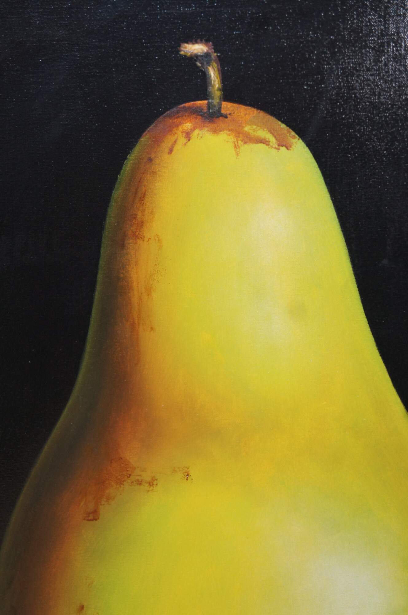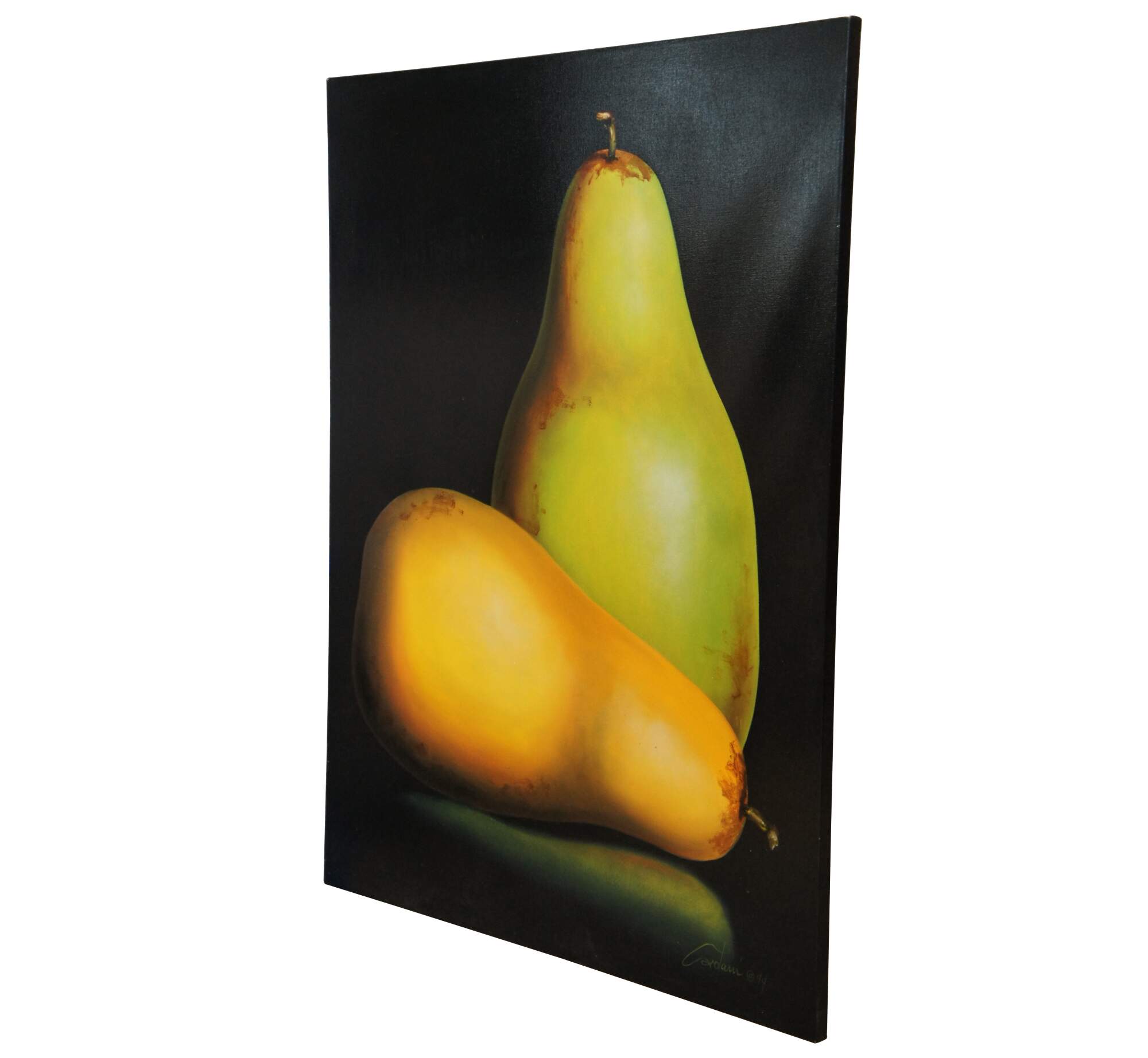 Vintage 1999 large scale oil on canvas painting of a pair of pears, done with intense chiaroscuro. Chiaroscuro in art, is the use of strong contrasts between light and dark, usually bold contrasts affecting a whole composition. Signed and dated in the lower right.