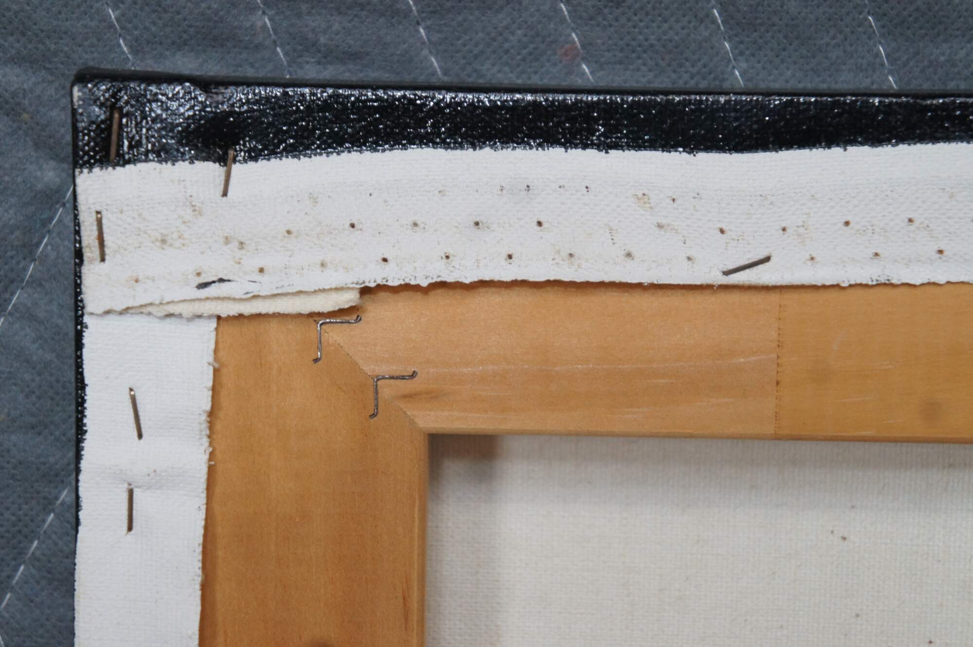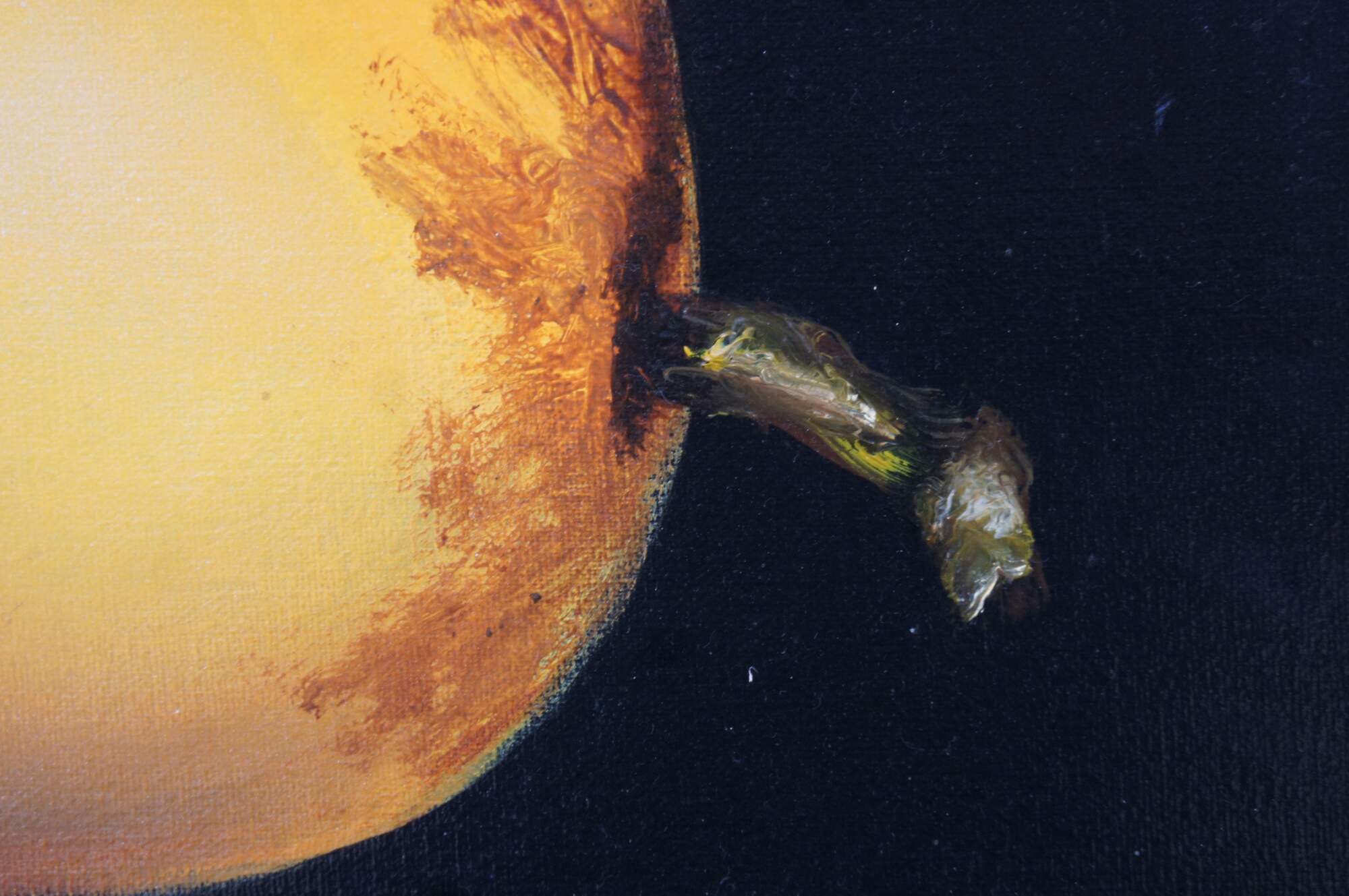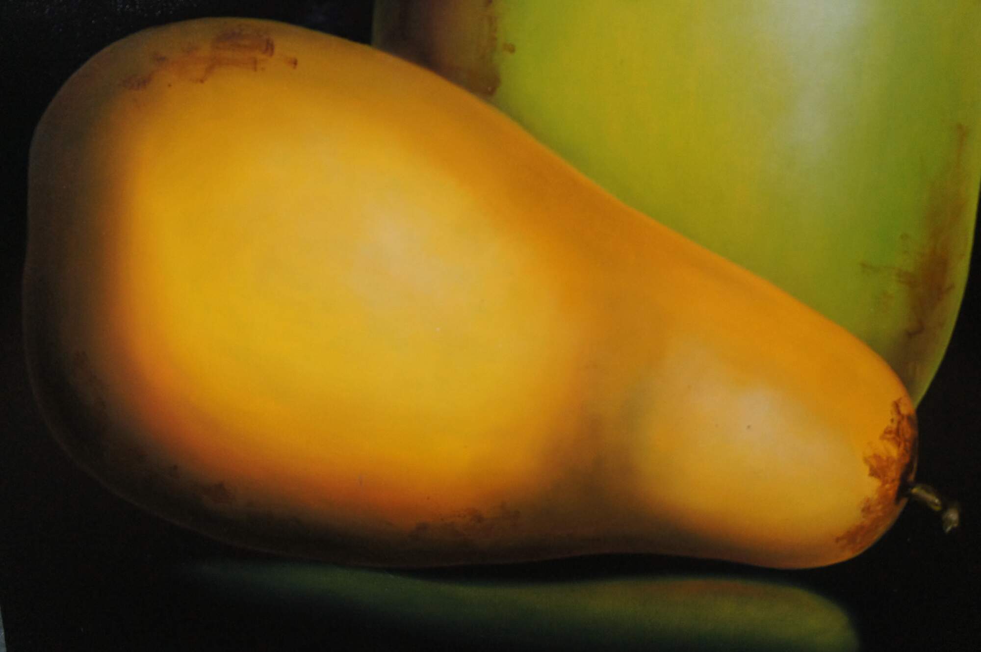 Vintage 1999 large scale oil on canvas painting of a pair of pears, done with intense chiaroscuro. Chiaroscuro in art, is the use of strong contrasts between light and dark, usually bold contrasts affecting a whole composition. Signed and dated in the lower right.