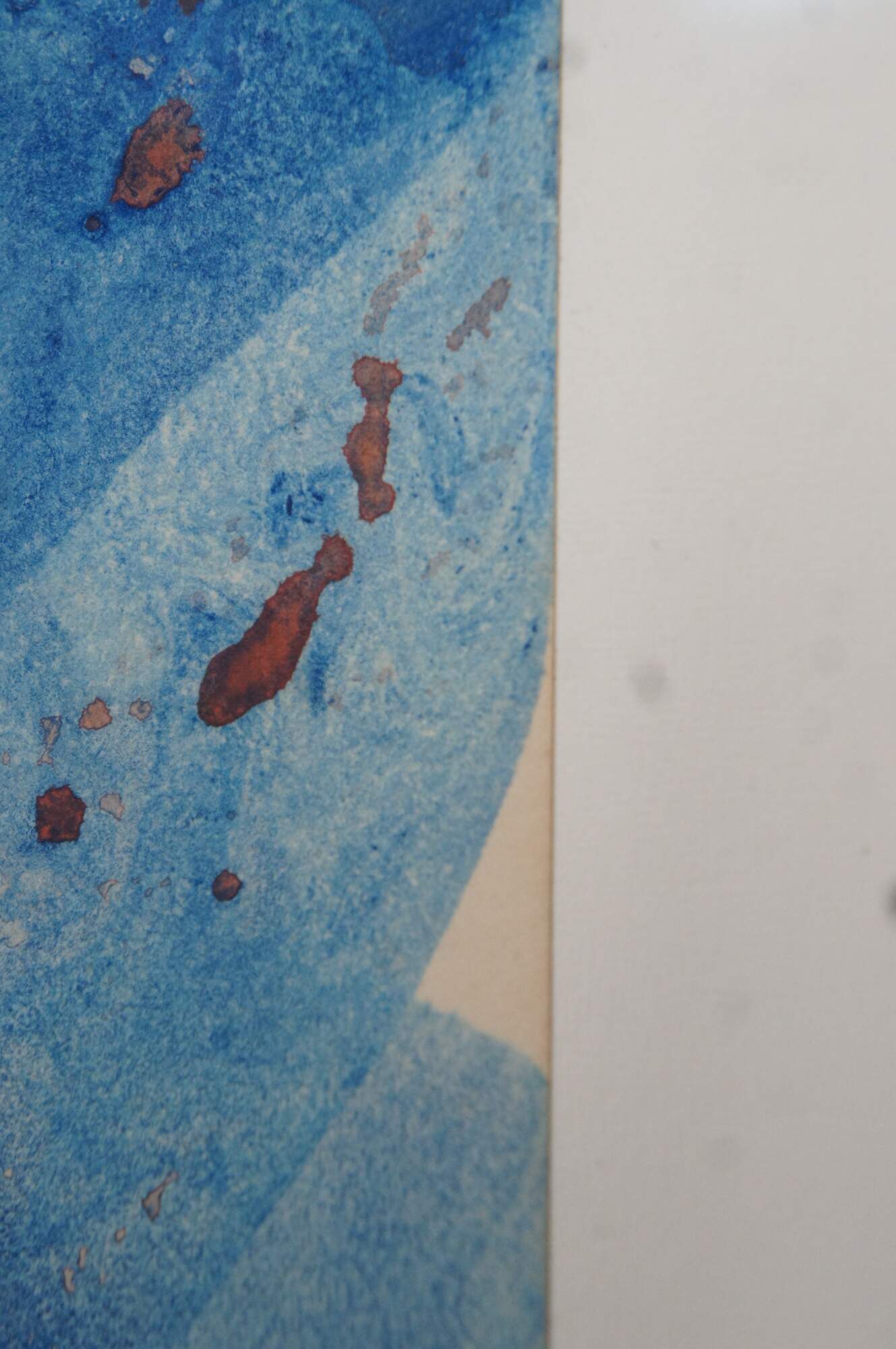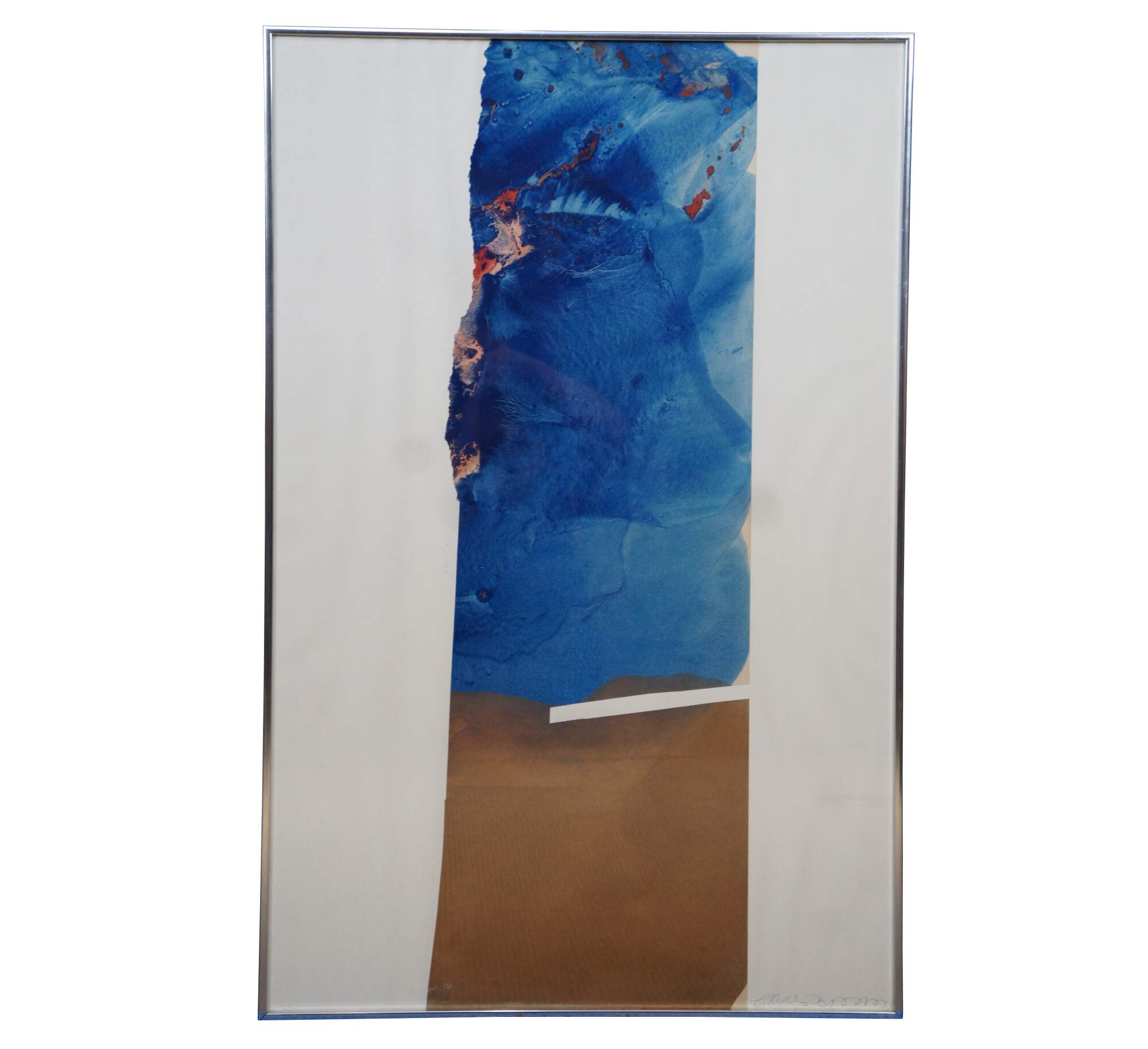 Vintage 1970s-1990s abstract watercolor painting by Gordon R. Richardson featuring flowing blues over brown with splotches of peach/red on a column of torn paper. Pencil signed lower right corner. Part of Richardson’s series inspired by Cape Hatteras, this piece was once included in the Dayton Art Institute’s Circulating Gallery. Titled on label: “Hatteras [something] – Series (Bridges [?])”