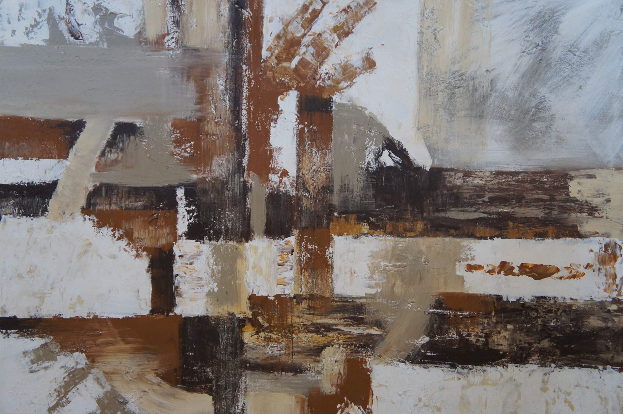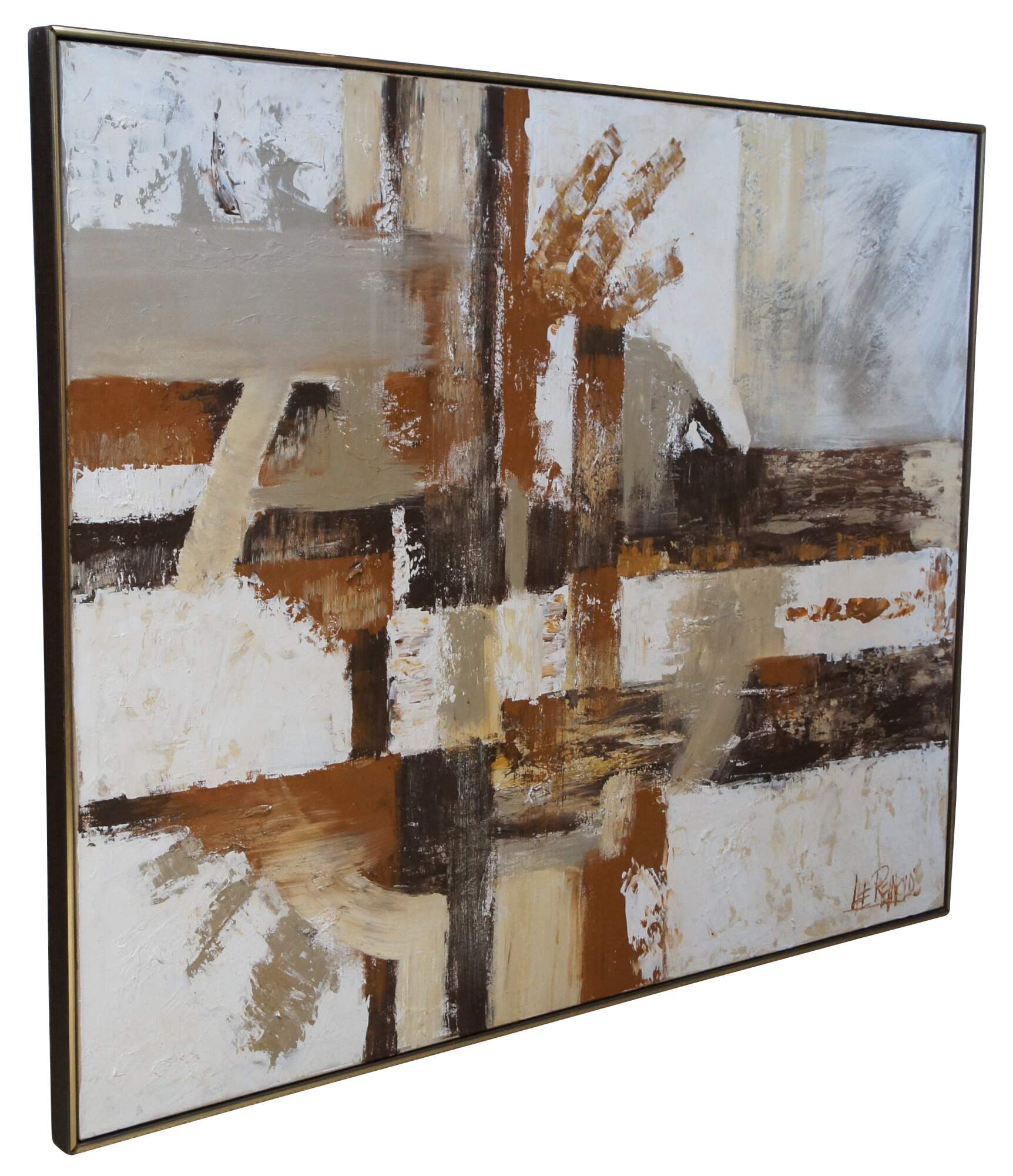 Large scale mid 20th century abstract oil painting on canvas signed Lee Reynolds, crafted in shades of brown and gray.