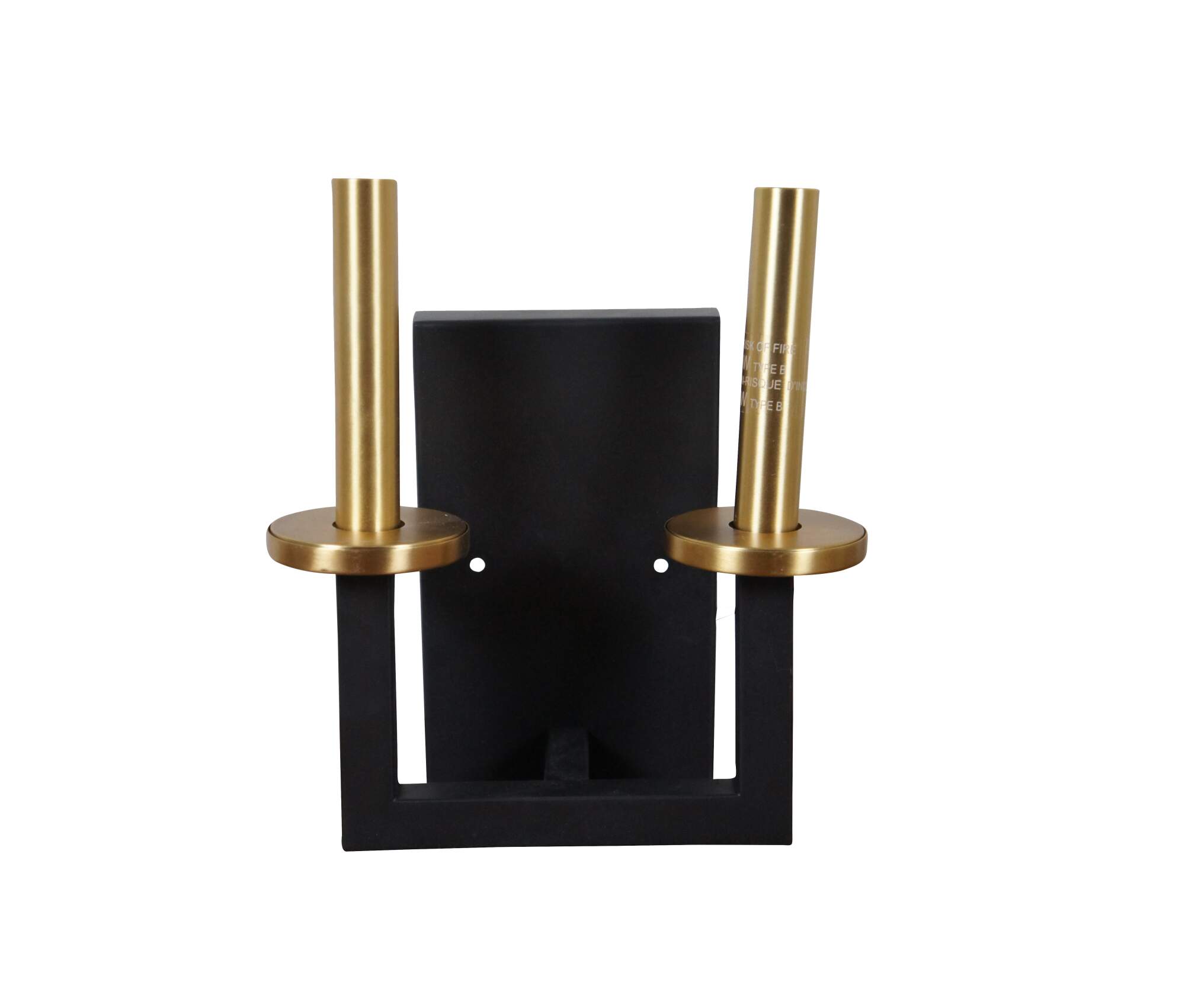 Pair of vintage Blakely modernist / industrial chic two light candelabra wall sconces featuring a black metal base and gilded brass / gold candle shaped fixtures. Made by Progress Lighting, circa 2020.