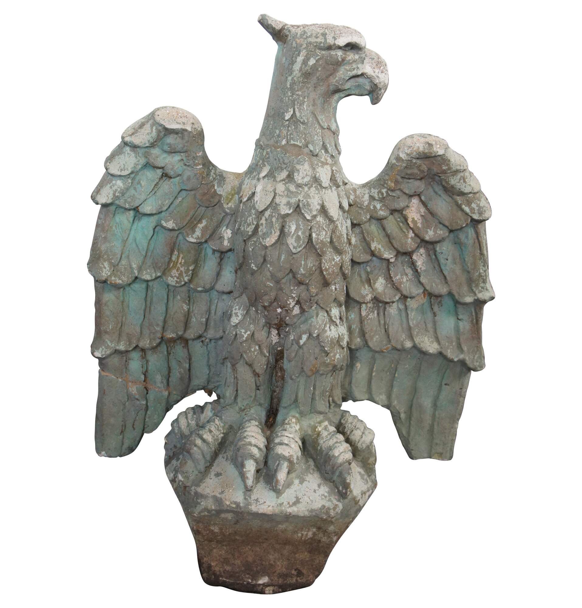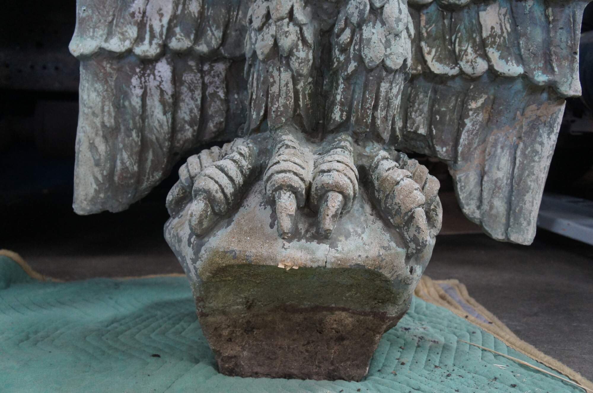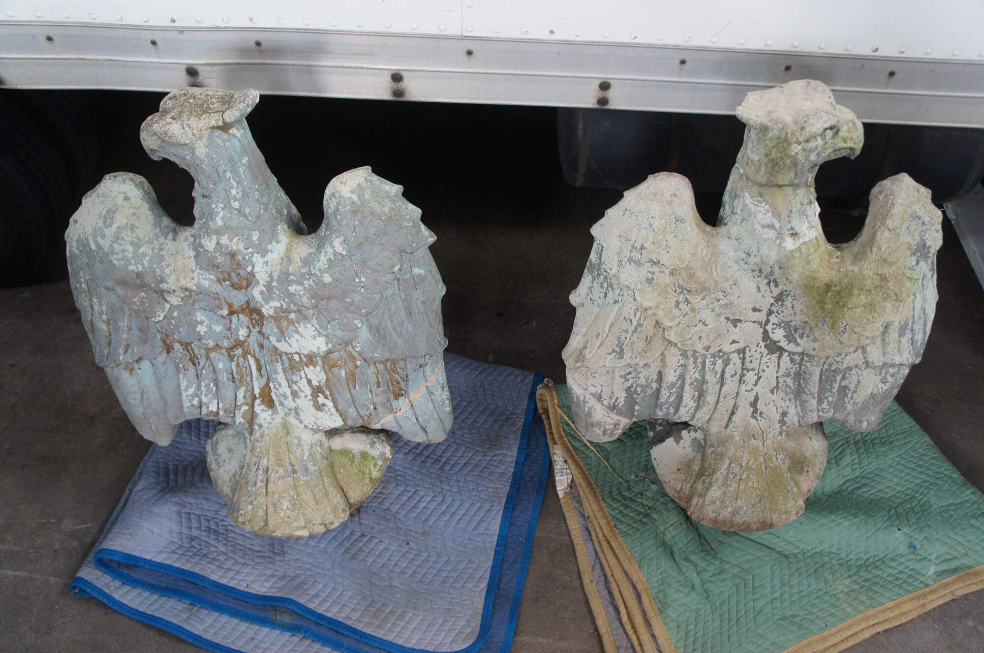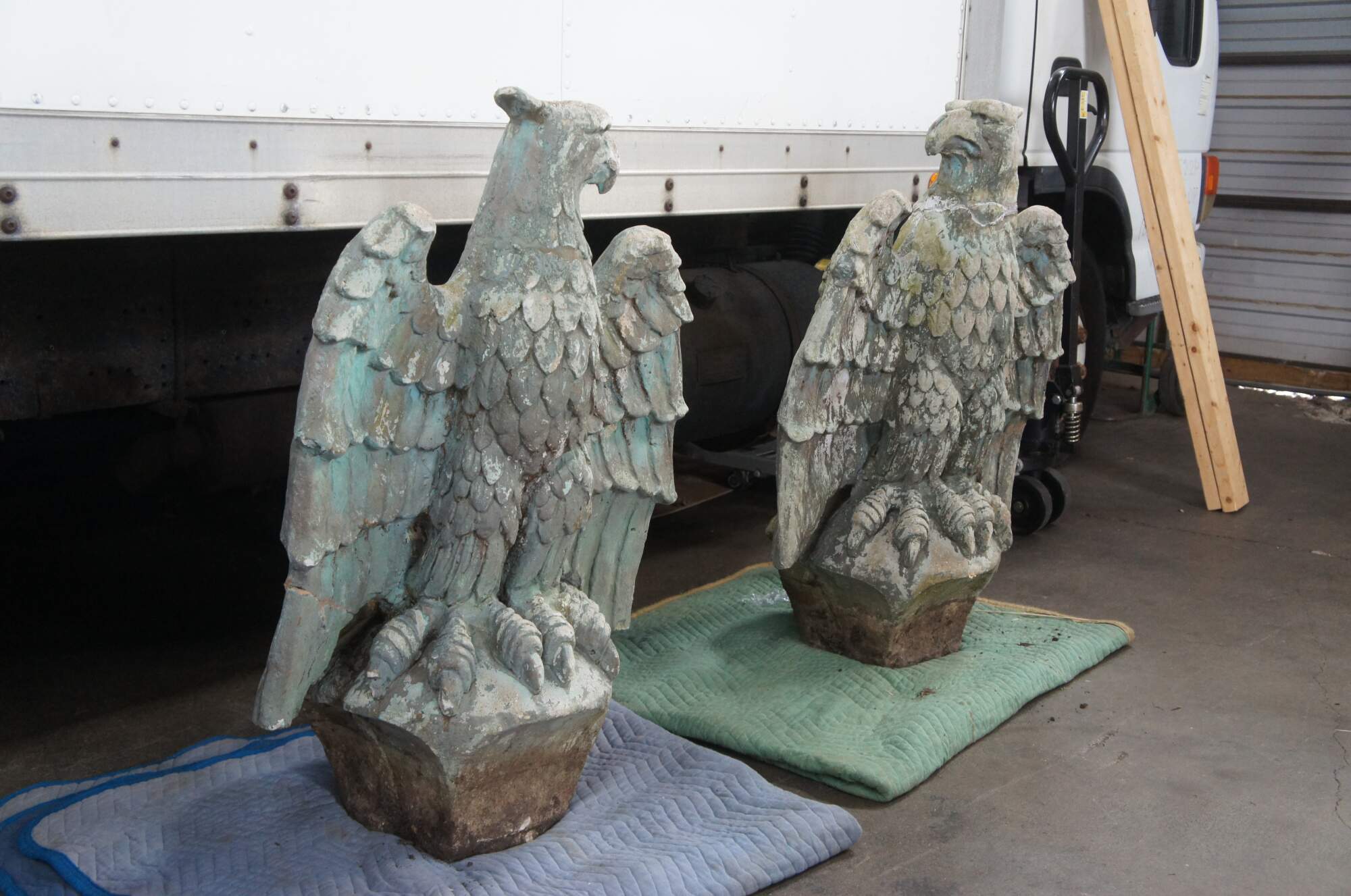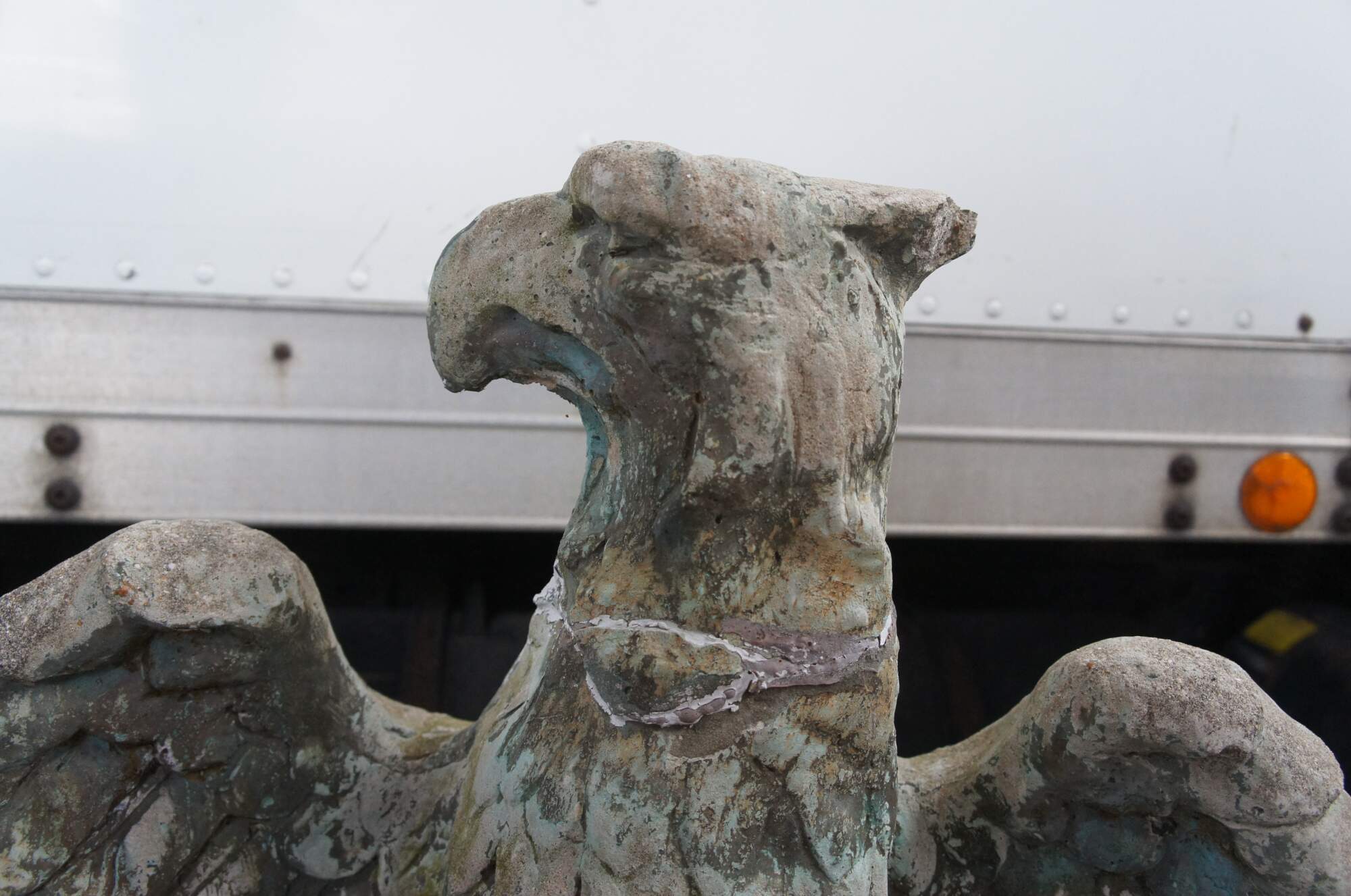 An impressive pair of early 20th century concrete / cast stone eagle sculptures. Lifelike in size with apposing faces, oustretched wings and large talons. The bases of the statues are tapered allowing them to inset into the ground nicely. Thes statues were originally mounted to the rooftop facade of an Indianapolis building.