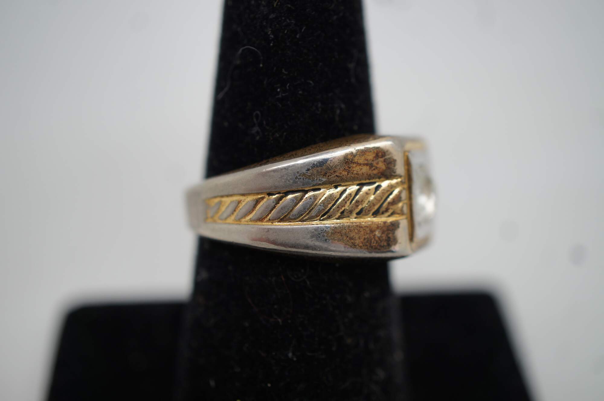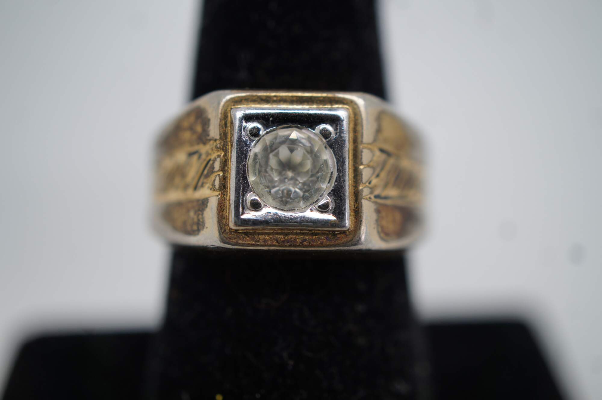 Vintage 14 karat gold filled signet style ring with white rhinestone setting and rope twist accent.