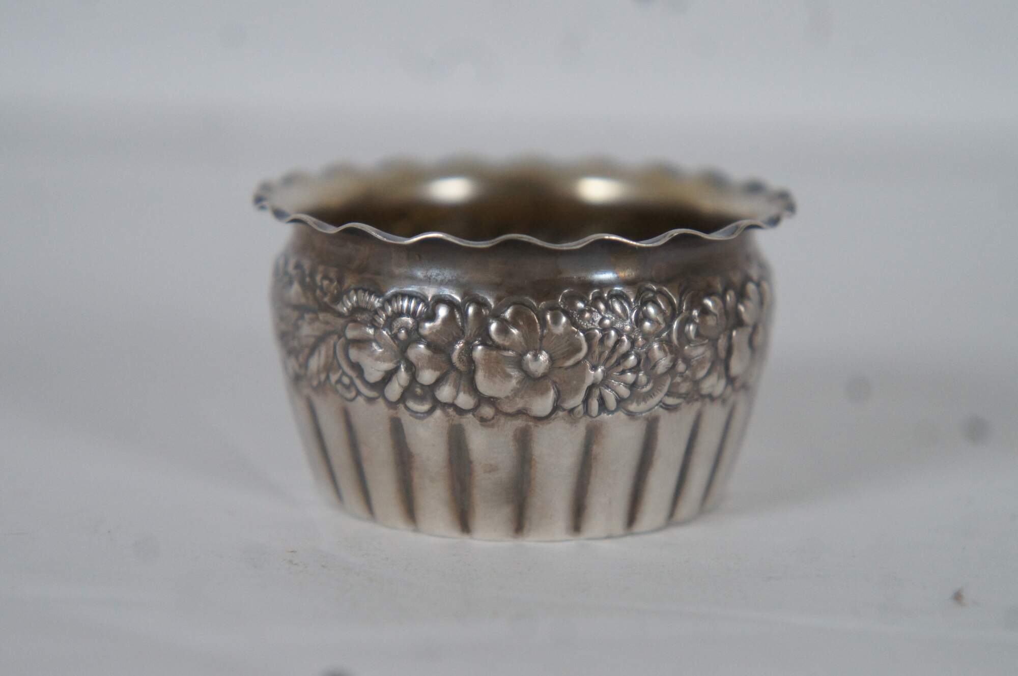Pair of antique Victorian era Gorham number 2215 repousse sterling silver salt cellars featuring a round tapered form, rippling scalloped upper edge, and a band of flowers. Manufactured in 1894, according to arrow shaped date mark.
