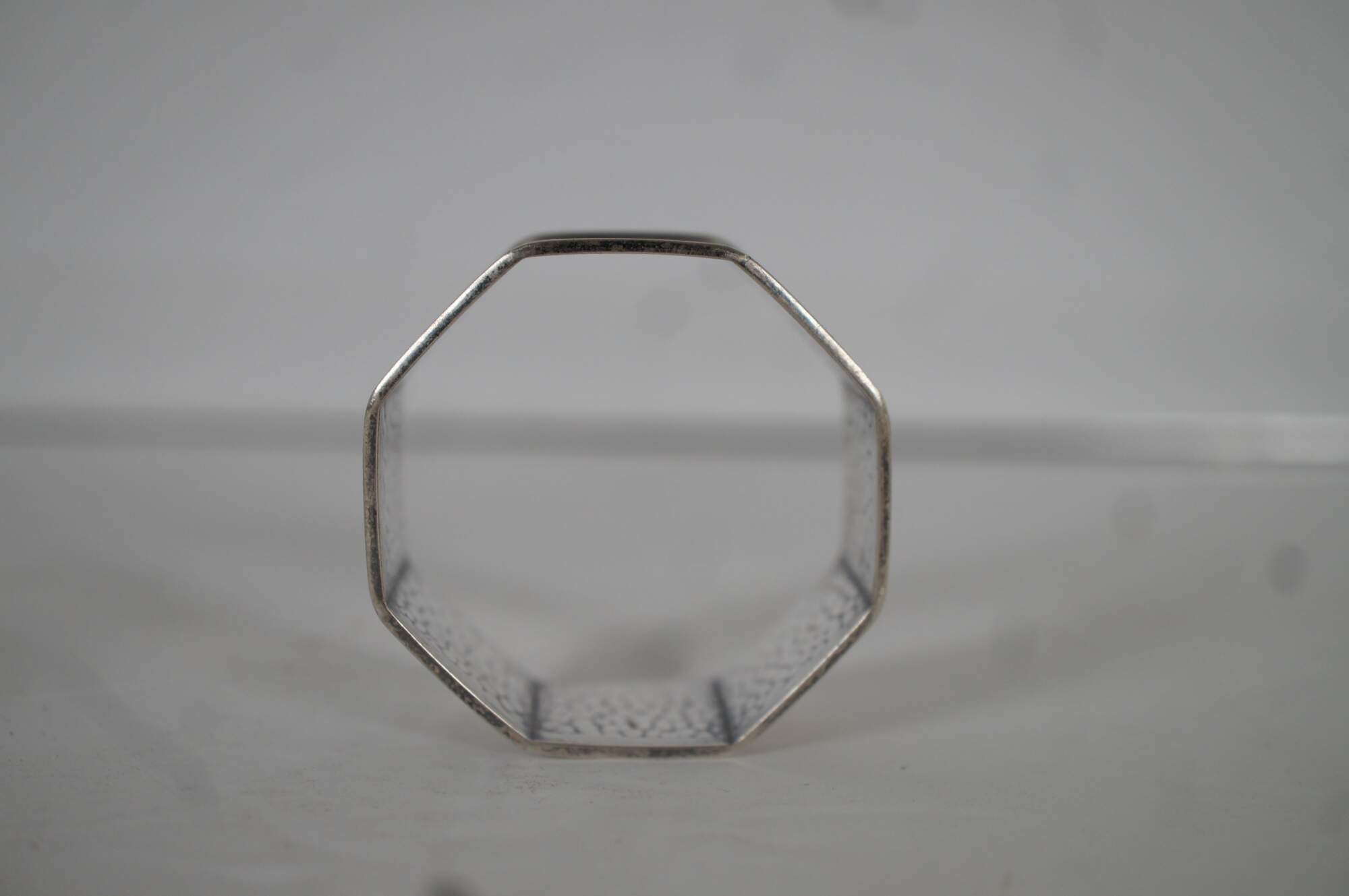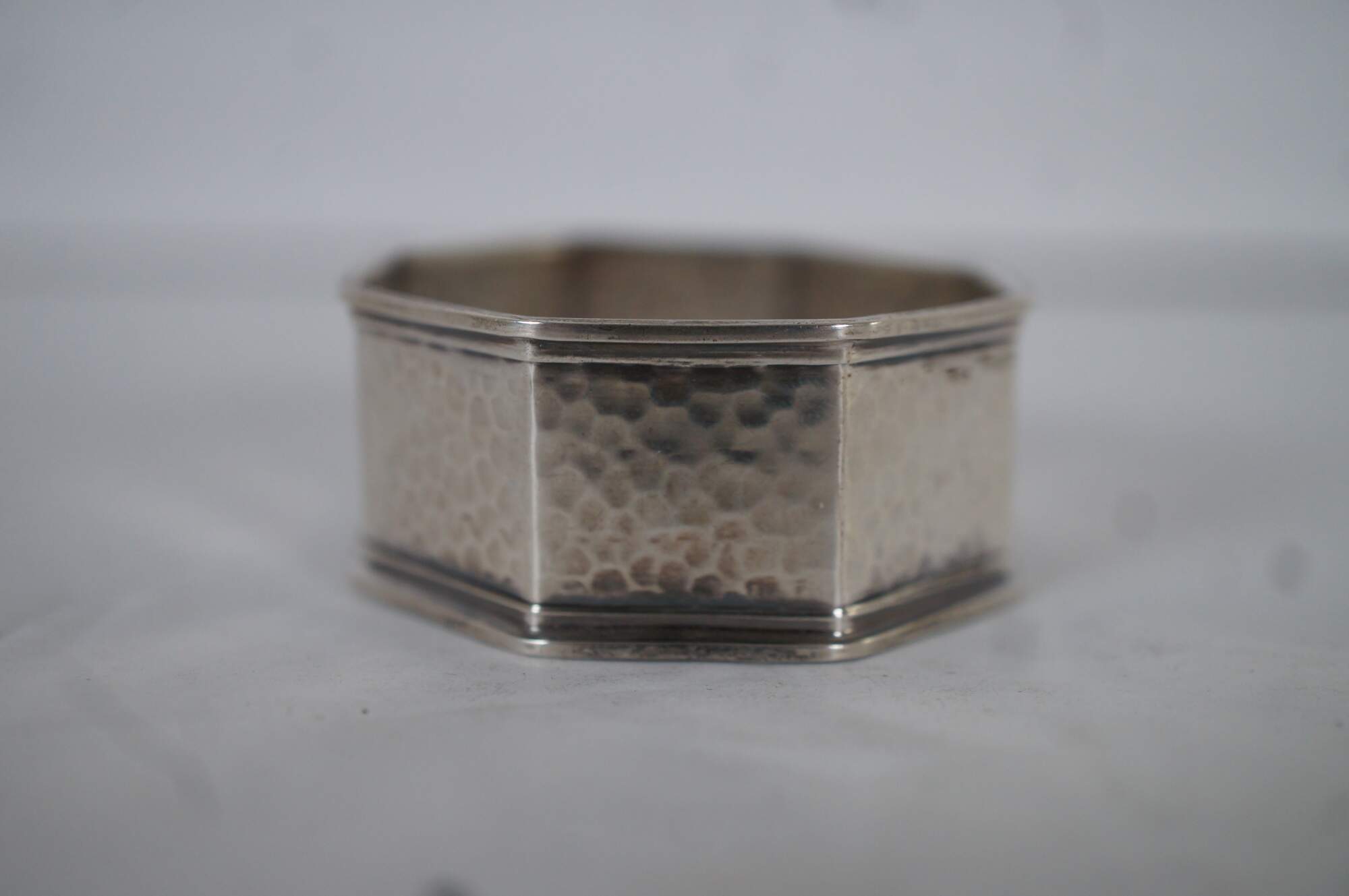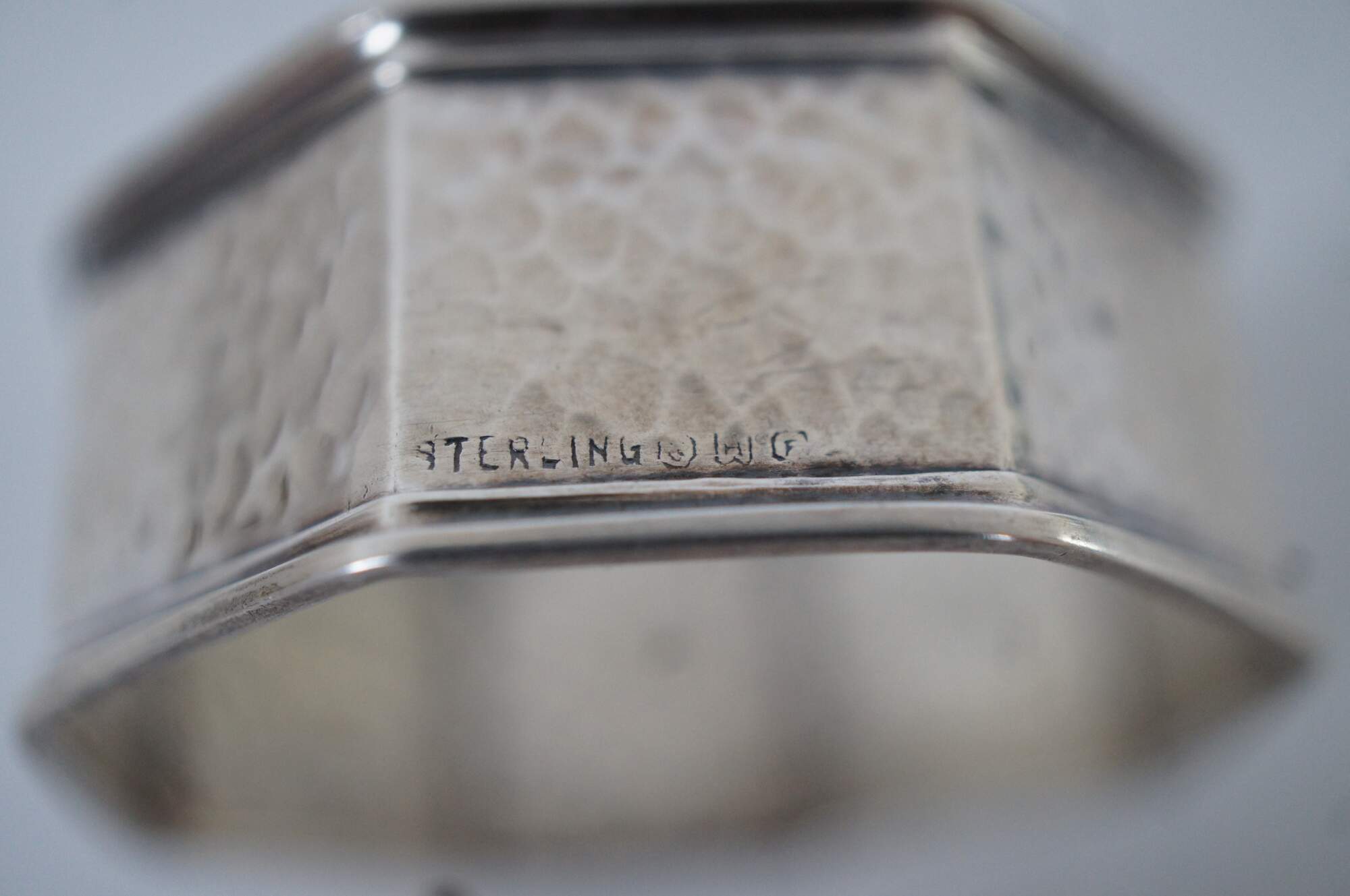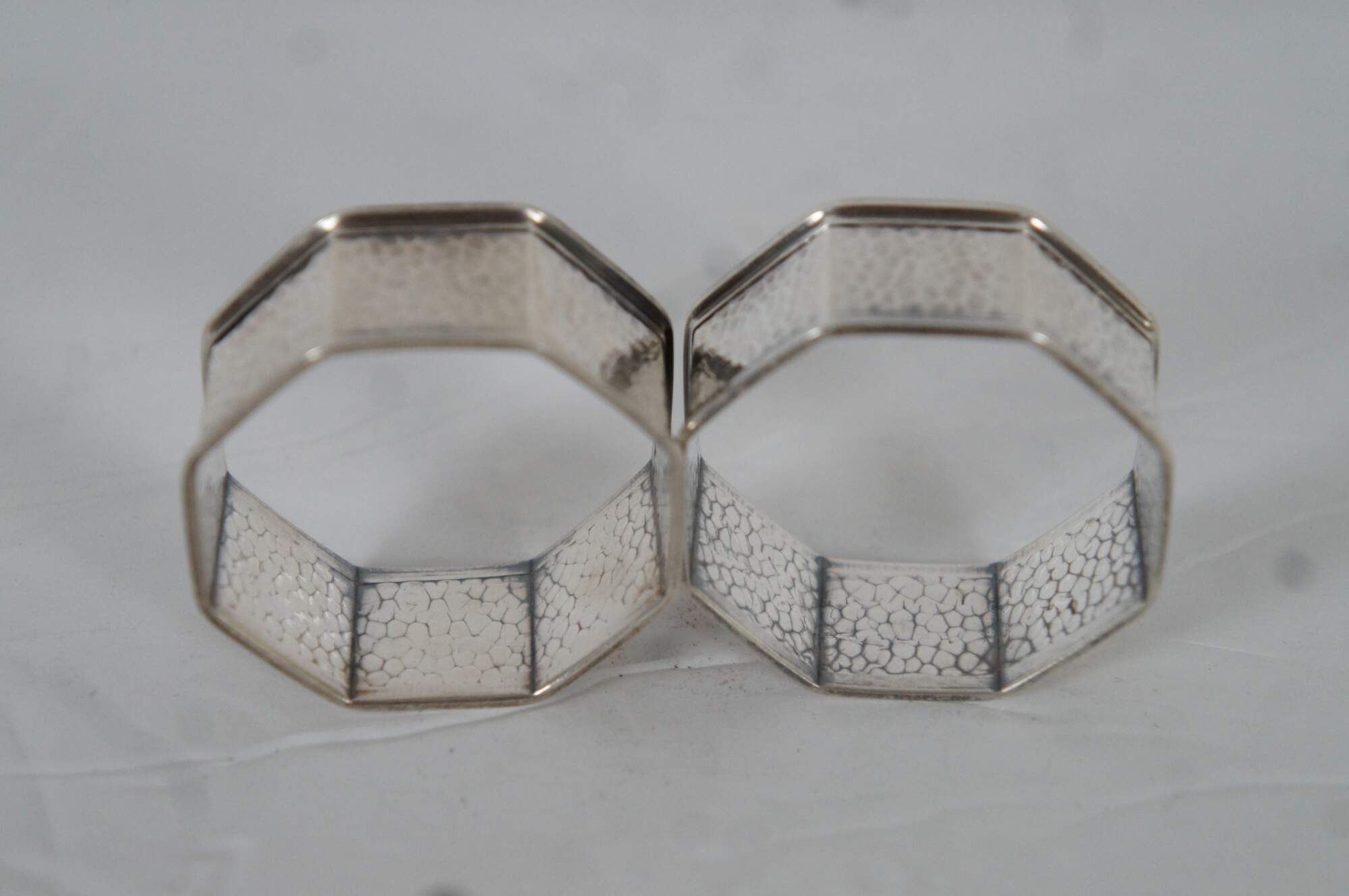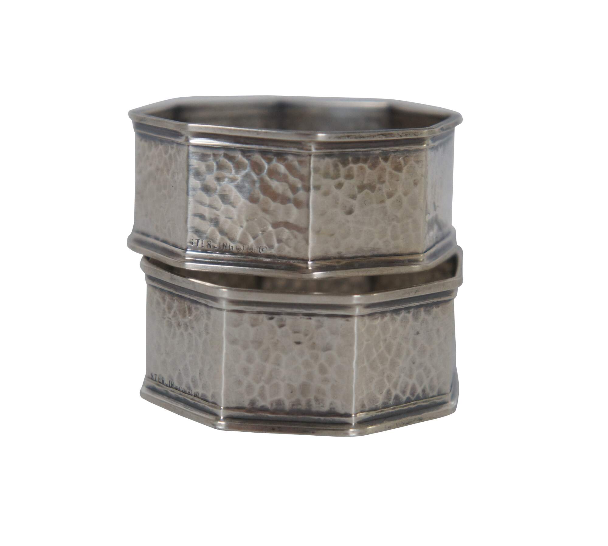 Pair of early 20th century antique hammered sterling silver, octagonal napkin rings with beveled edges, crafted by G.H. French and Company.