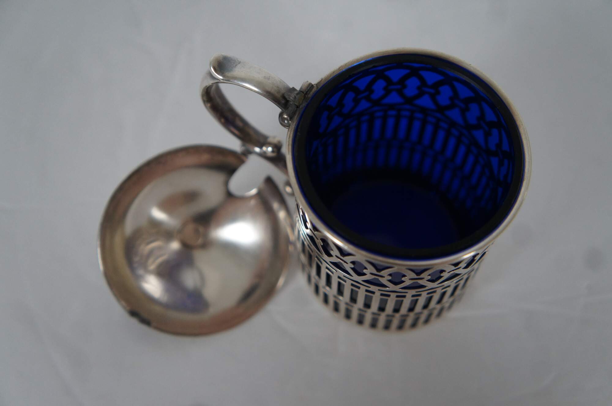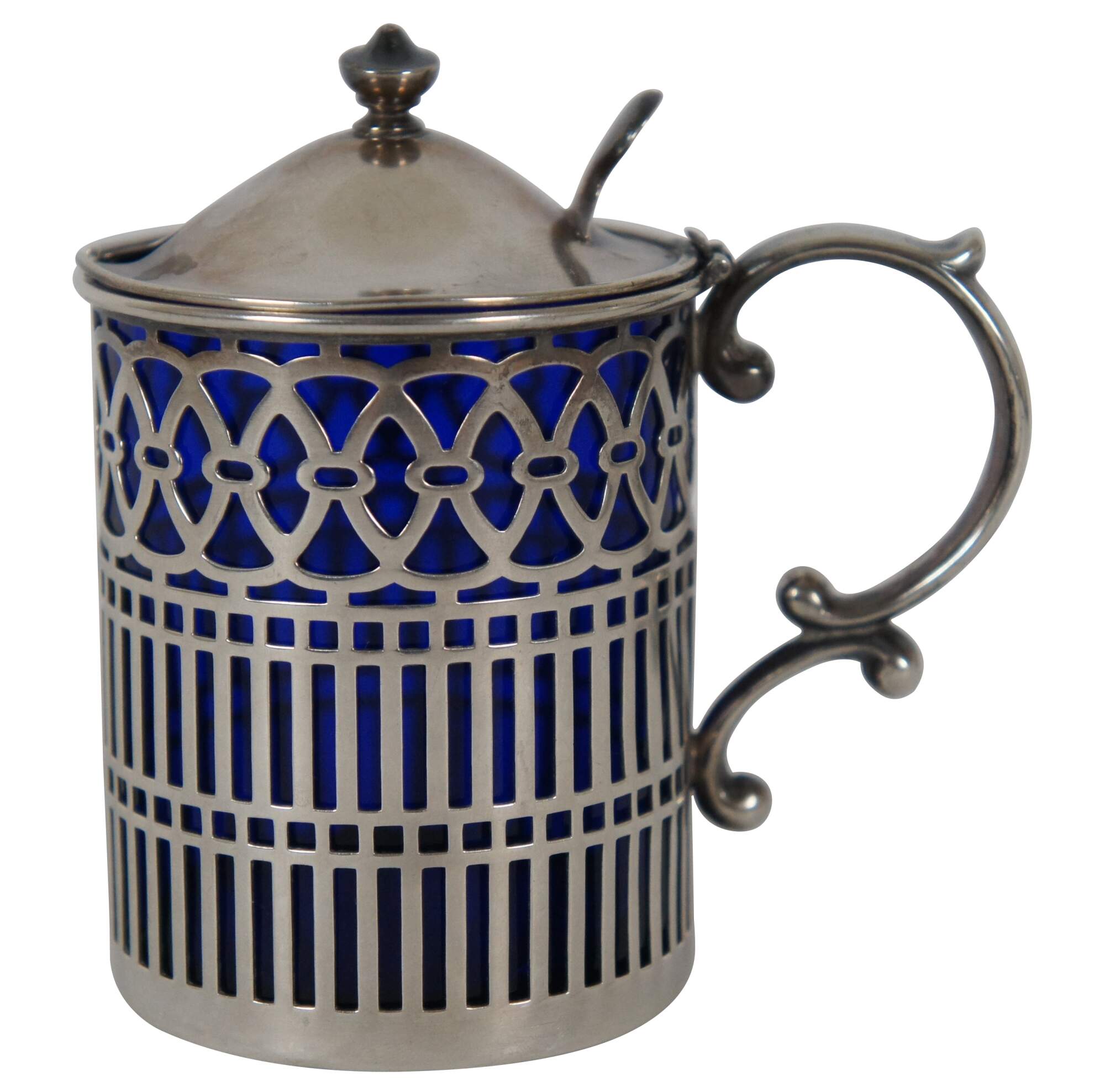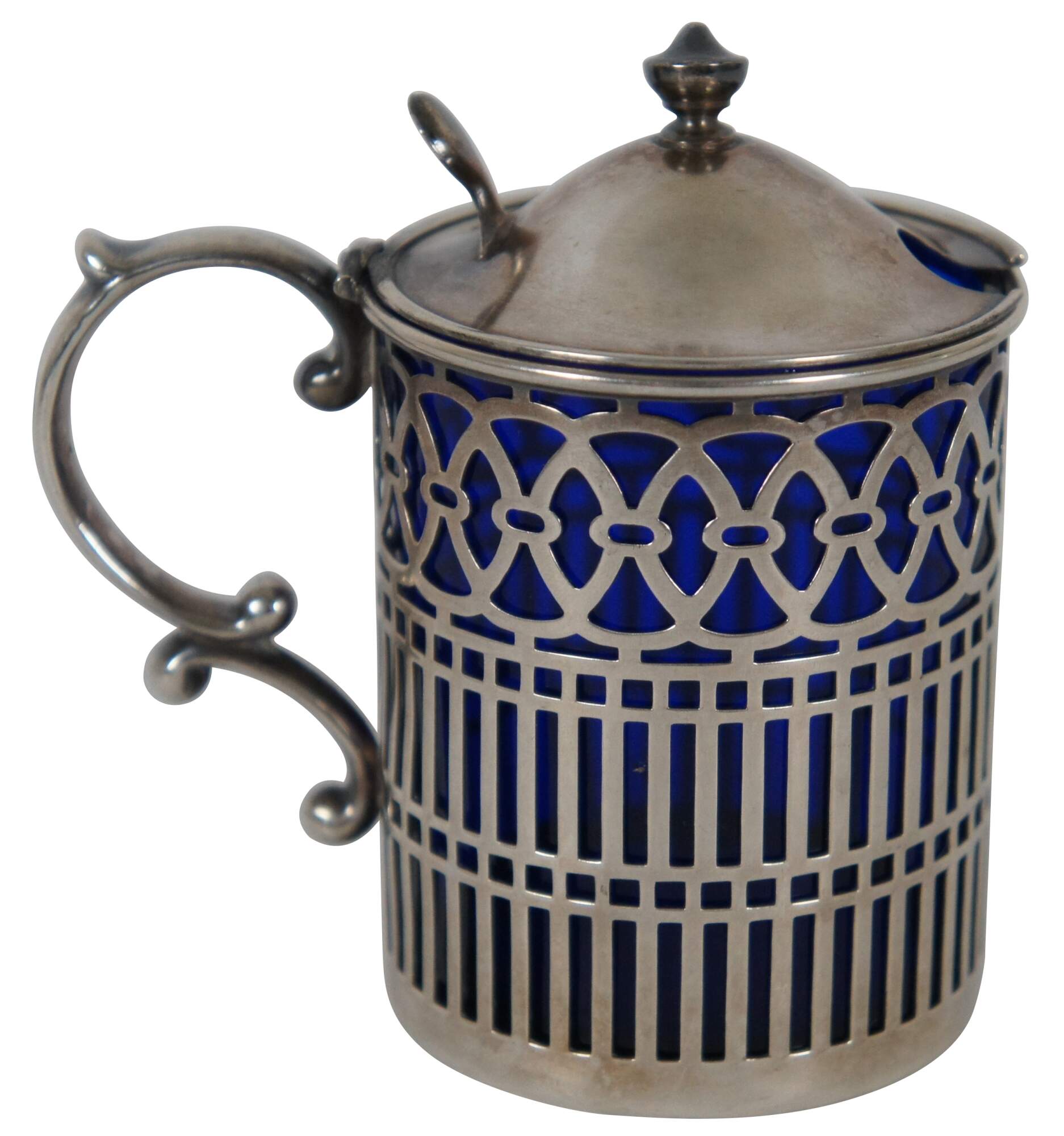 Antique early 20th century Watson for Wilcox & Wagoner number 474 lidded sterling silver jam / mustard / condiment pot featuring pierced sides, scrolled handle, vase shaped finial and cobalt glass insert.