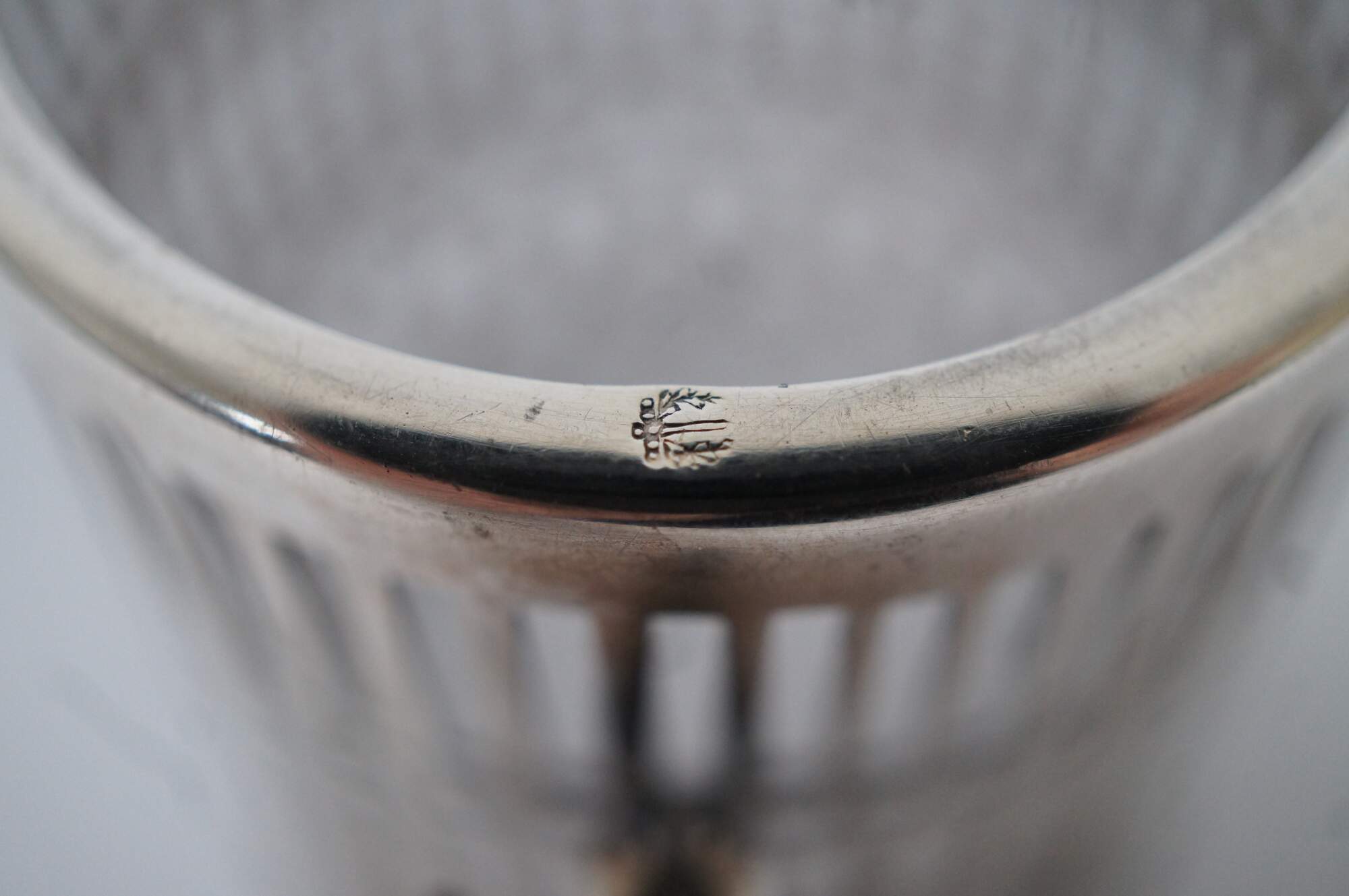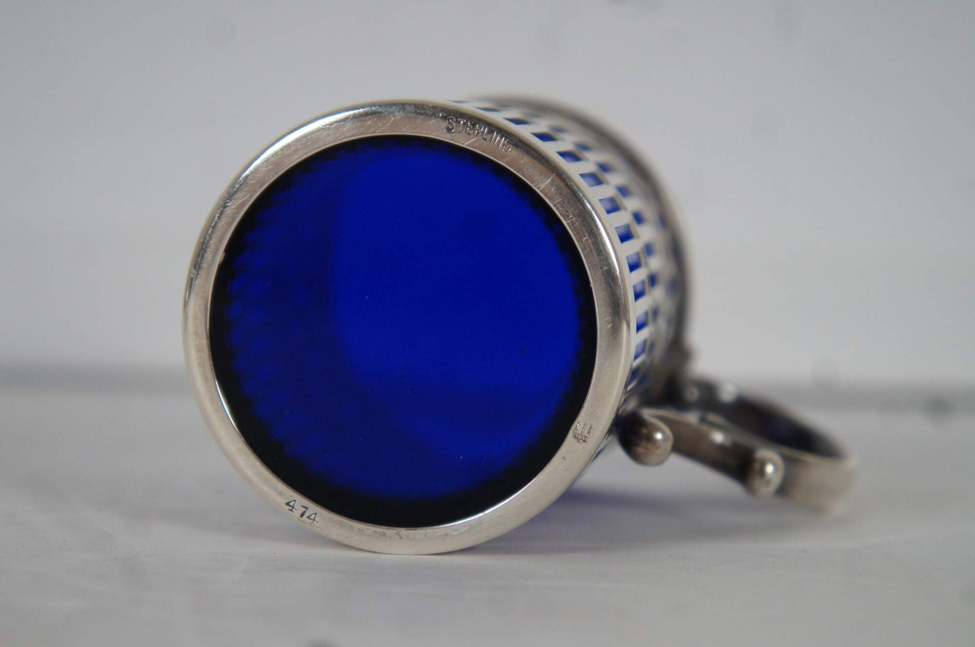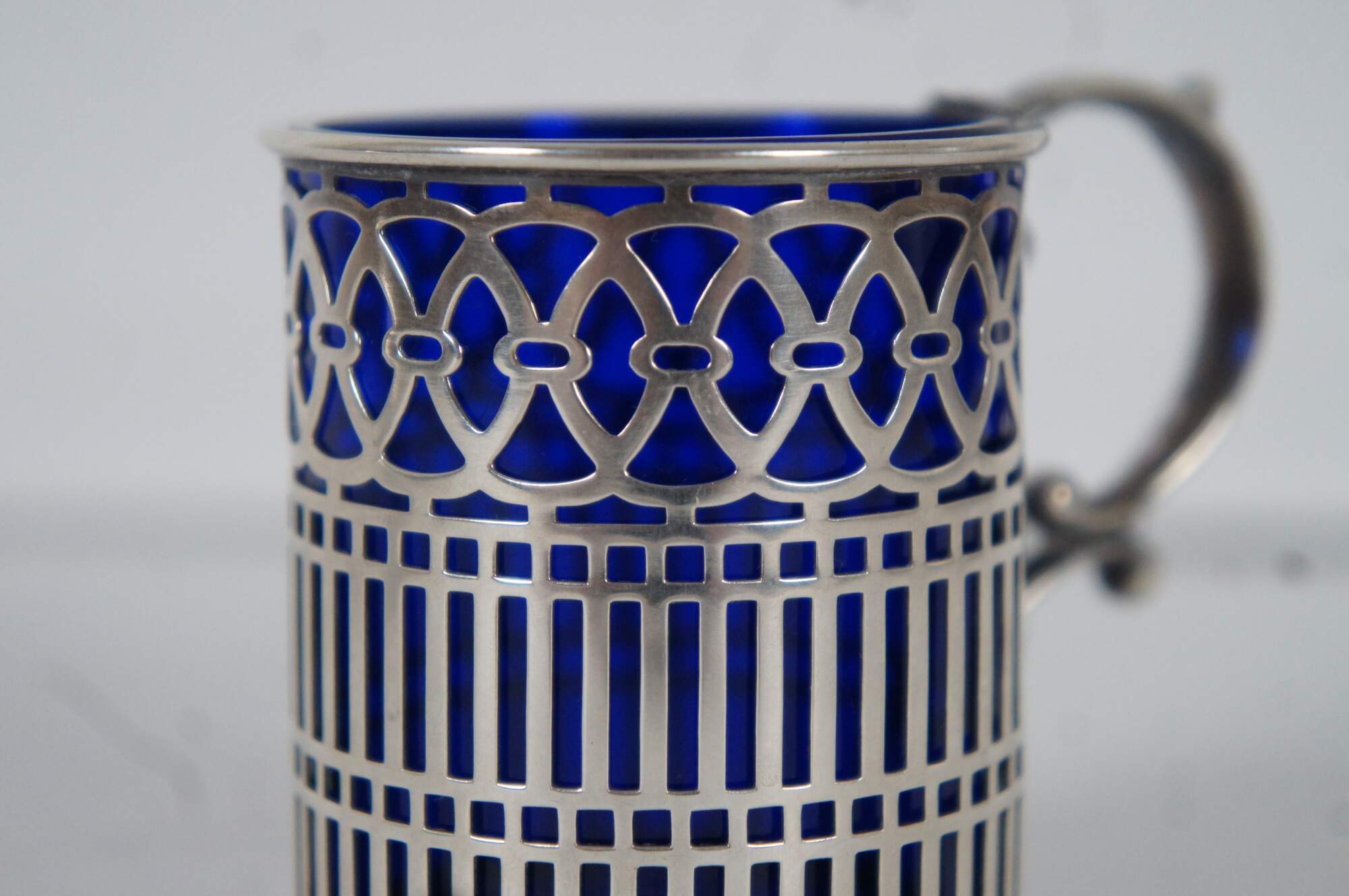 Antique early 20th century Watson for Wilcox & Wagoner number 474 lidded sterling silver jam / mustard / condiment pot featuring pierced sides, scrolled handle, vase shaped finial and cobalt glass insert.