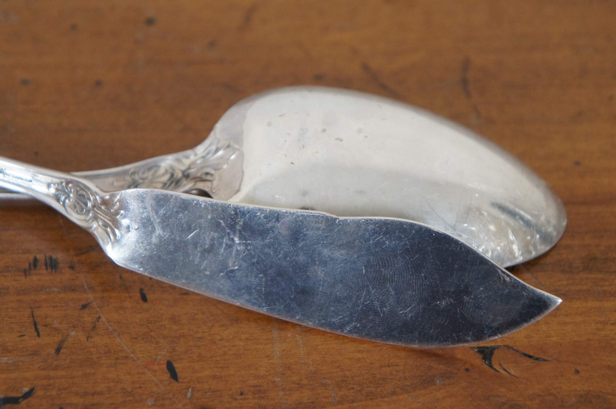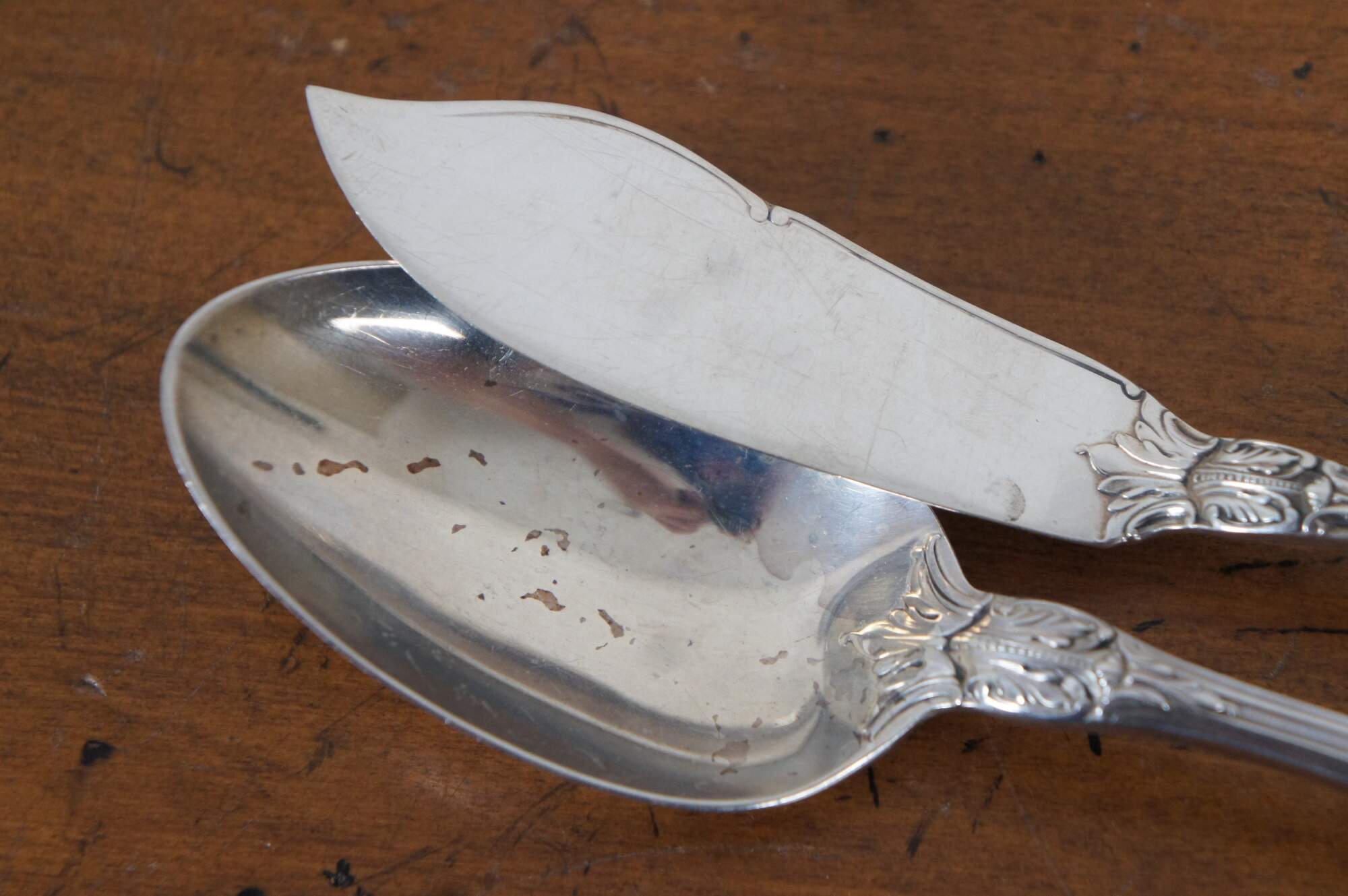 Antique early 20th century Wallace Sterling silver serving spoon and master butter knife pair in the Sir Christopher pattern (patented in 1936) with a rose below the foliate and scallop shell motif.