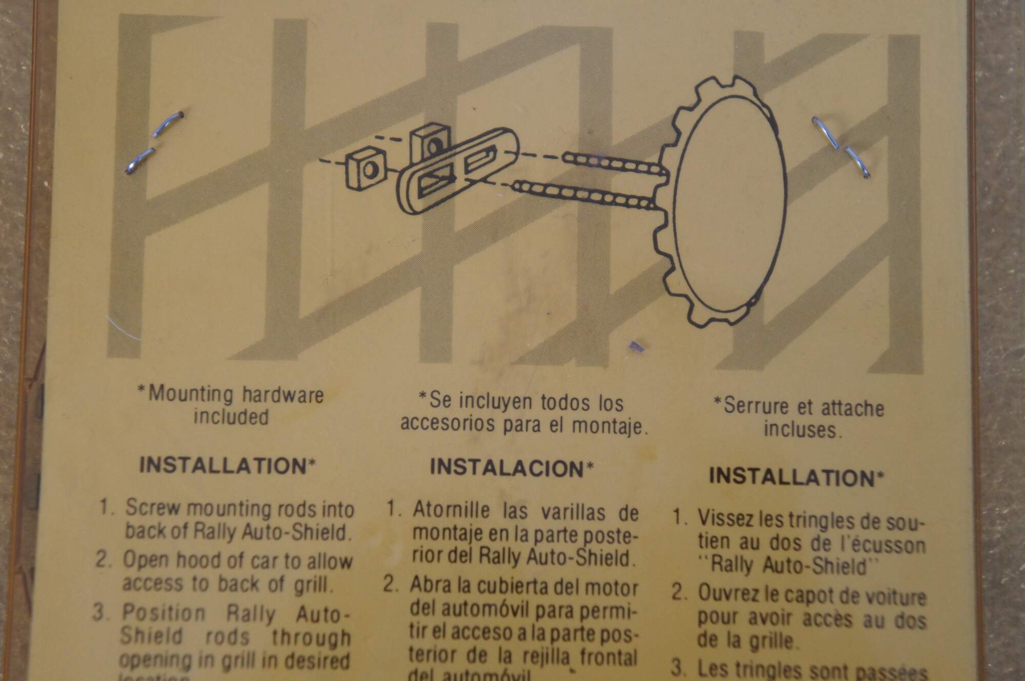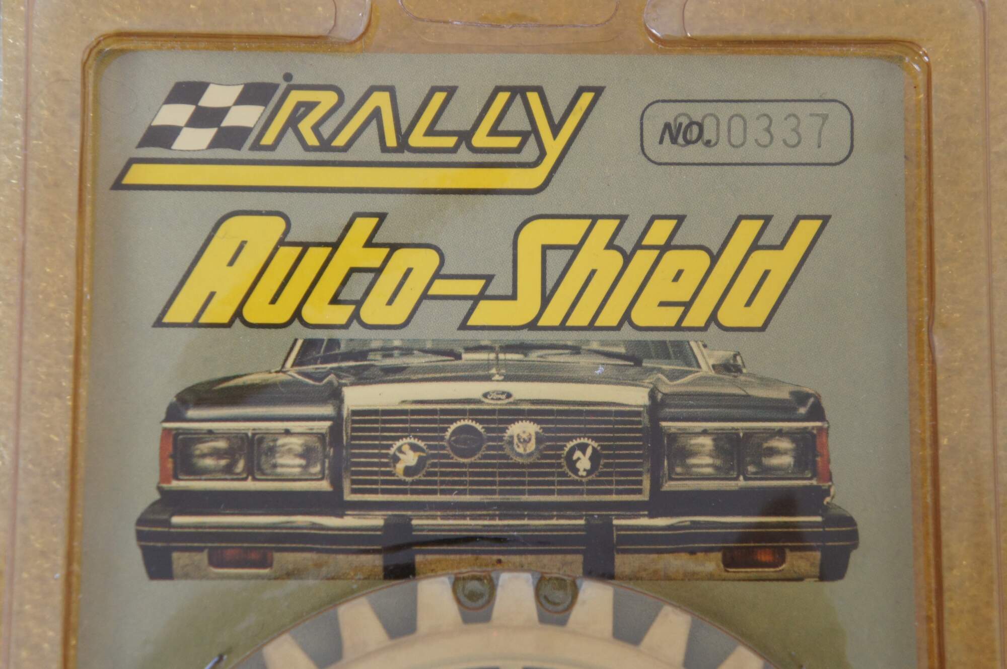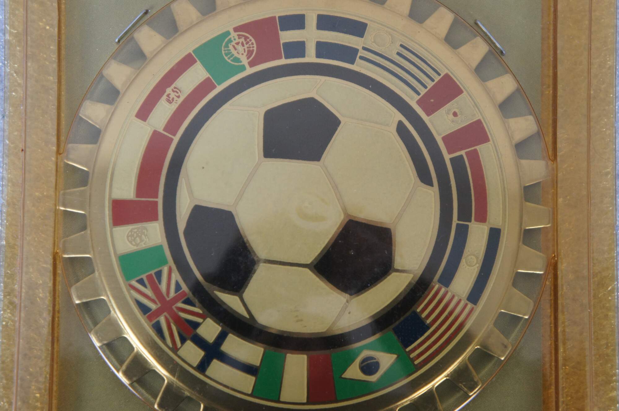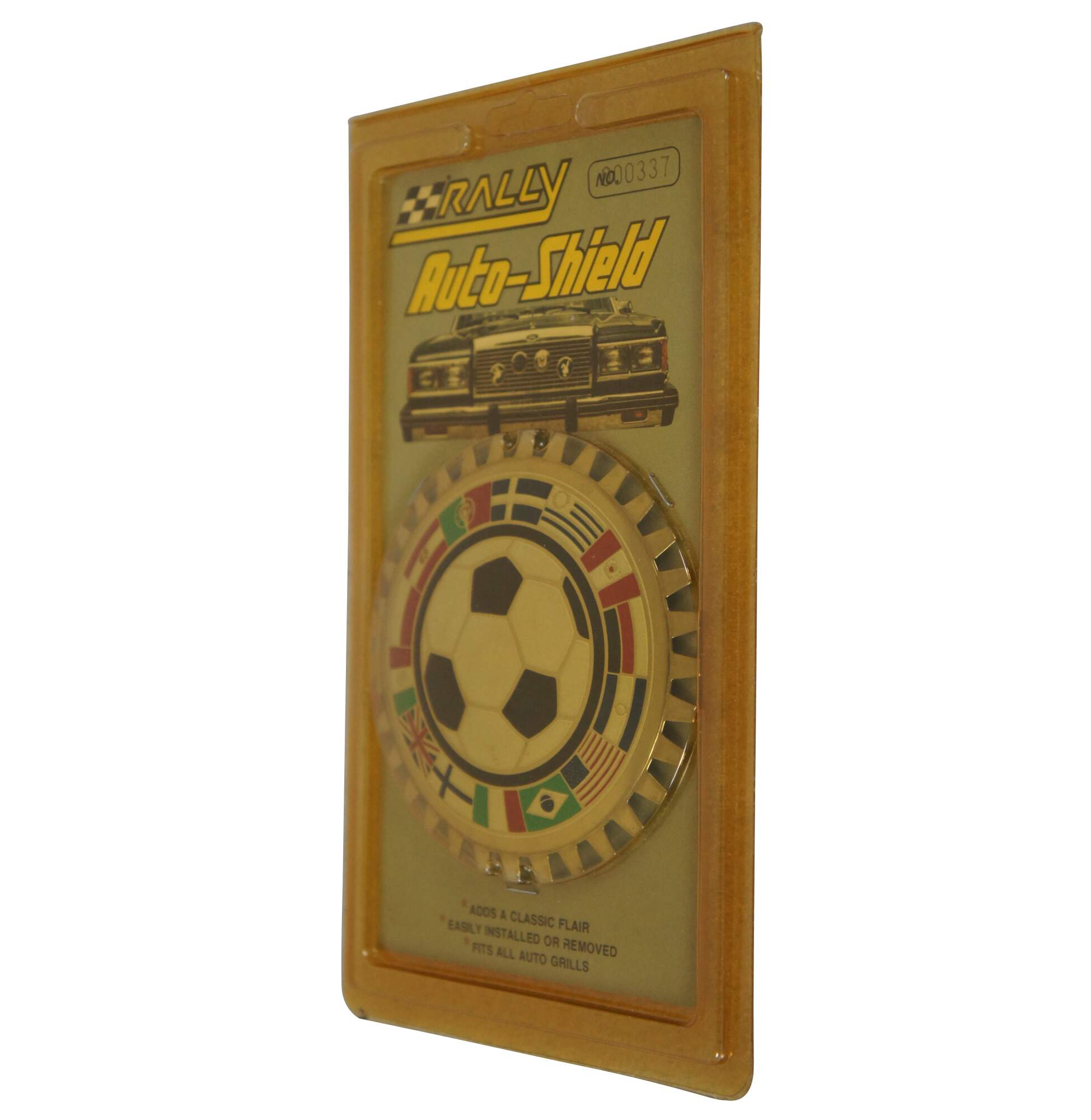 Vintage never used chrome and enamel Rally Auto-Shield auto emblem / grill badge, design number 000337, celebrating international soccer / futbol / football.