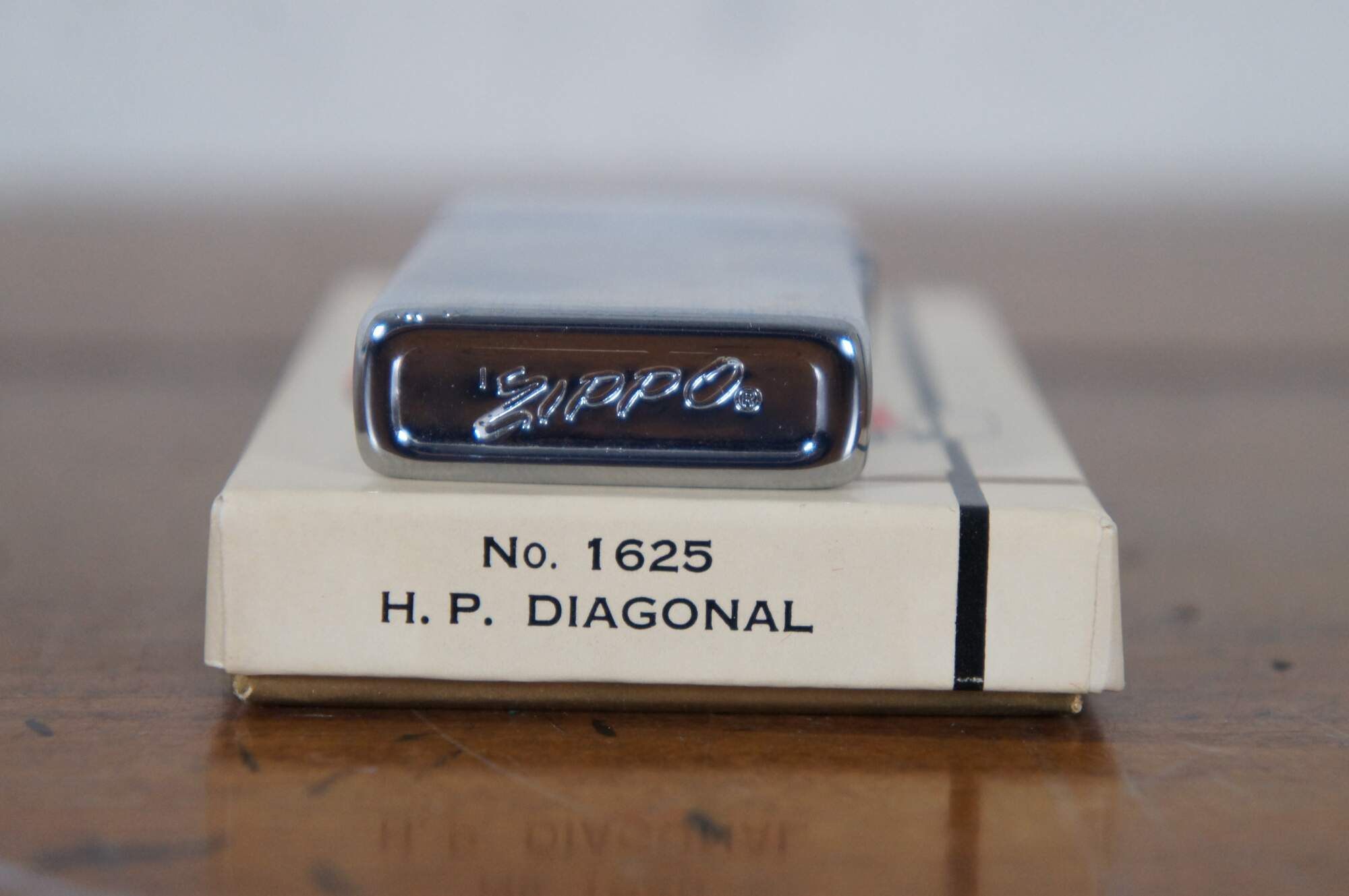 Vintage circa 1960’s Zippo Slim Lighter, Number 1625 H.P. Diagonal, featuring a vertical pin stripe pattern with space for a monogram. Includes original advertising box. Appears unused, new old stock.
