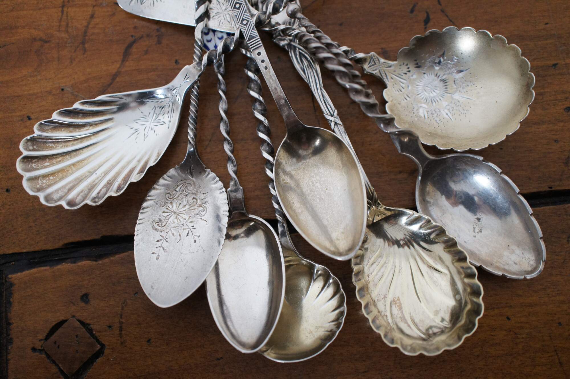Lot of 10 antique sterling and one 800 silver sugar / tea spoons in a variety of styles and designs including shell bowls, twisted handles, floral motifs and one enameled. Makers include Whiting Mfg Co, Towle Sterling, William B Kerr & Co, Davis & Galt, William B. Durgin, Manchester Mfg Co, and Bruckmann & Sohne.