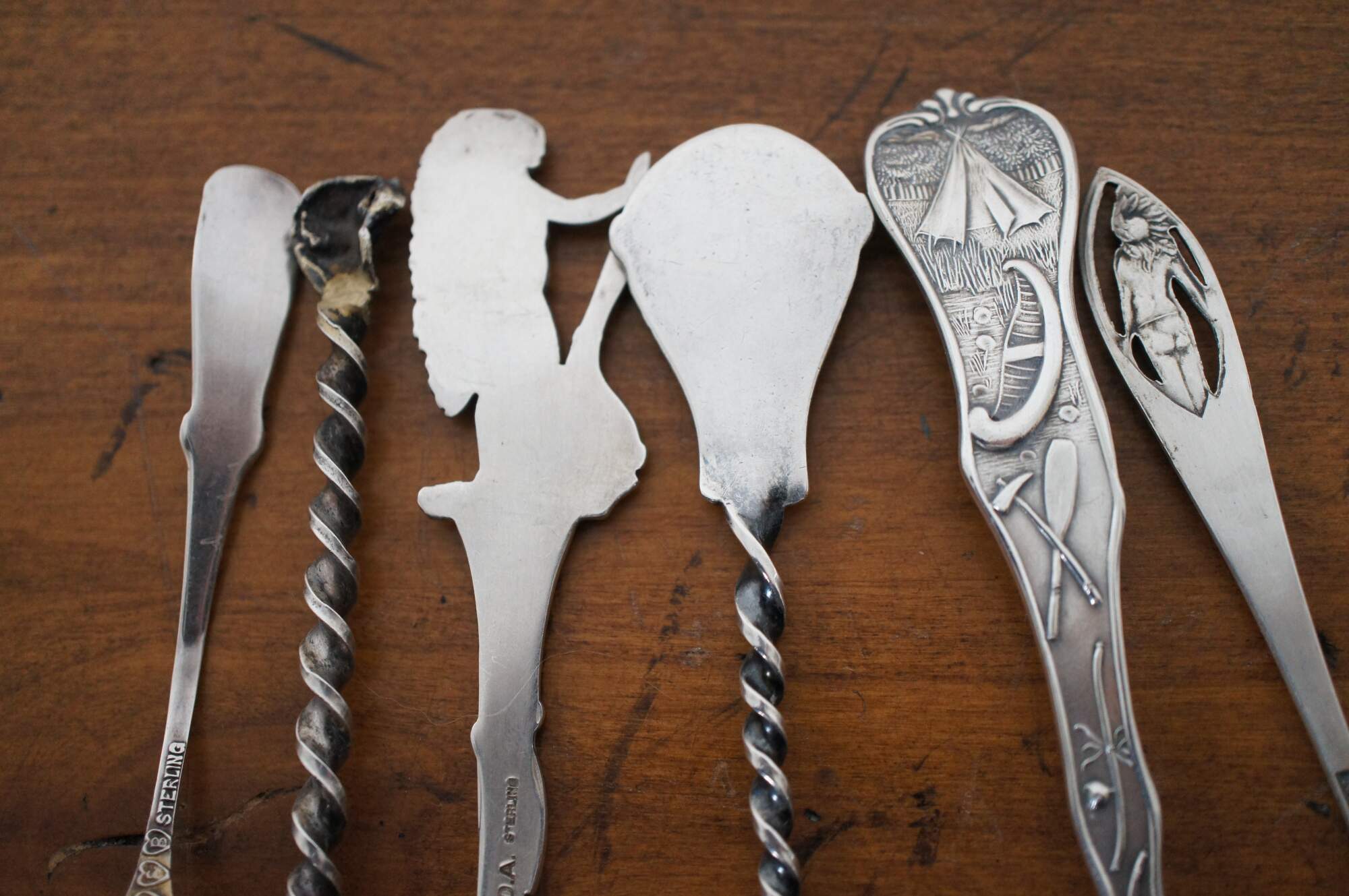 Lot of 6 antique / vintage sterling silver Western souvenir spoons featuring Native American figures / motifs. Makers include Paye & Baker, Colorado Silver, Lunt Silversmiths, Mechanics Silver Co, and Charles M. Robbins.