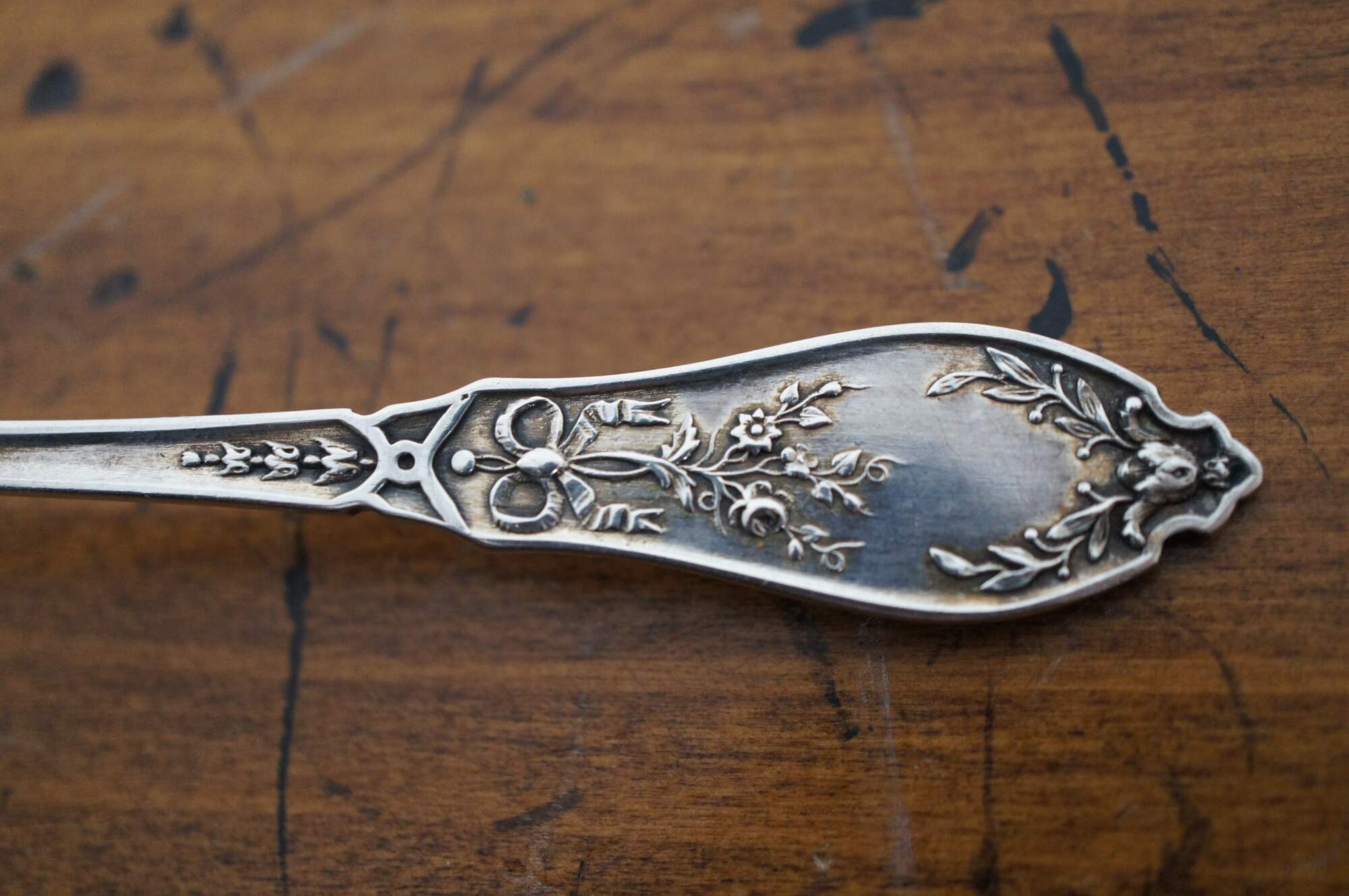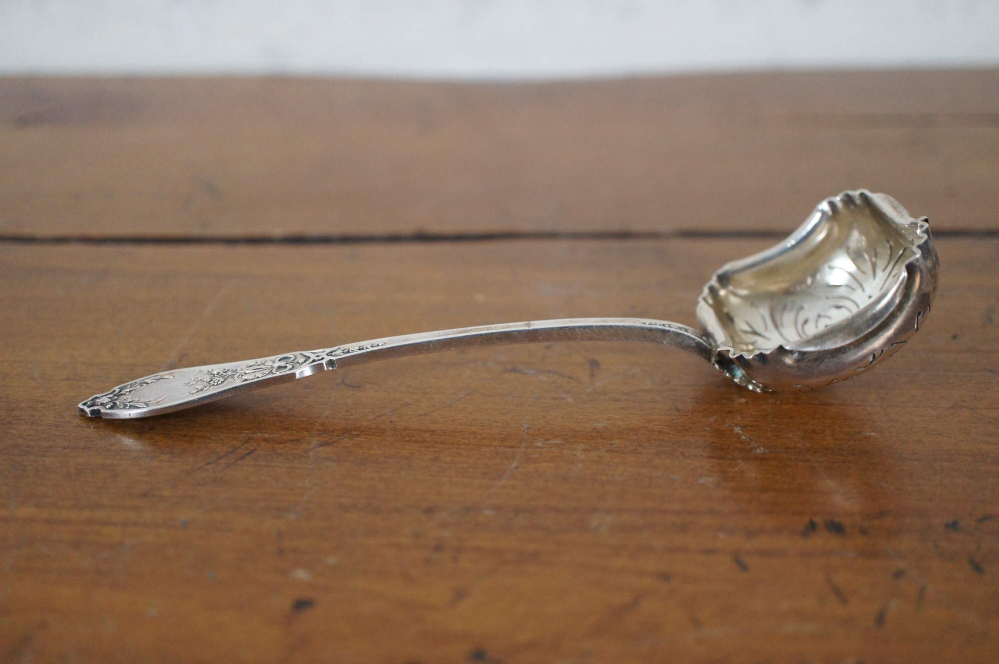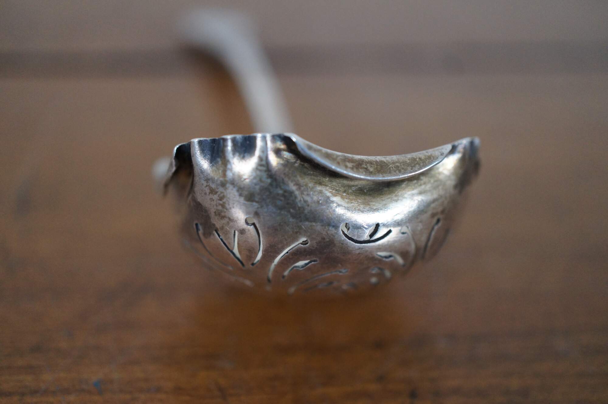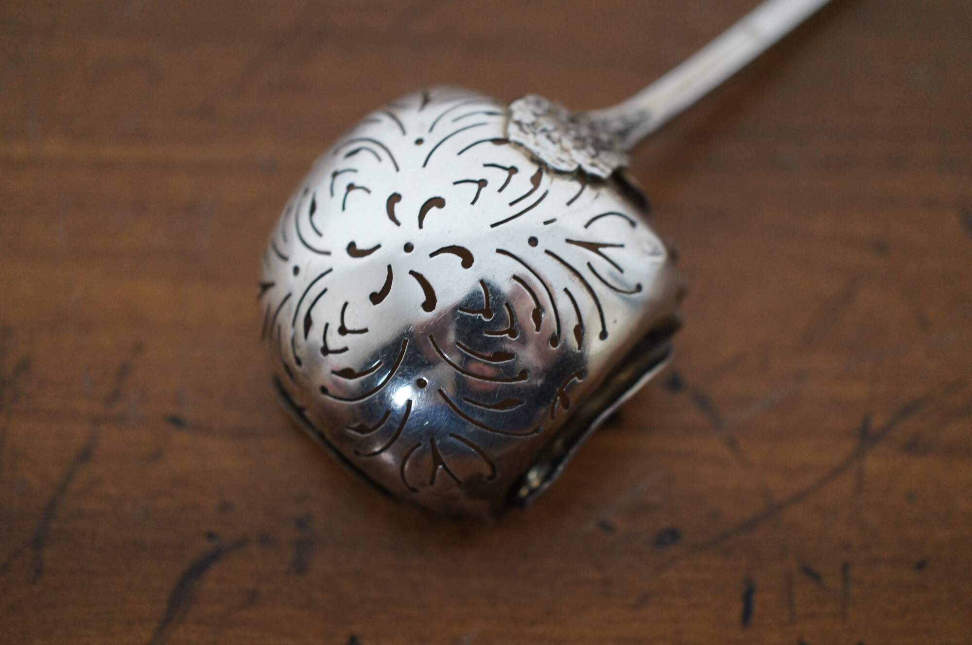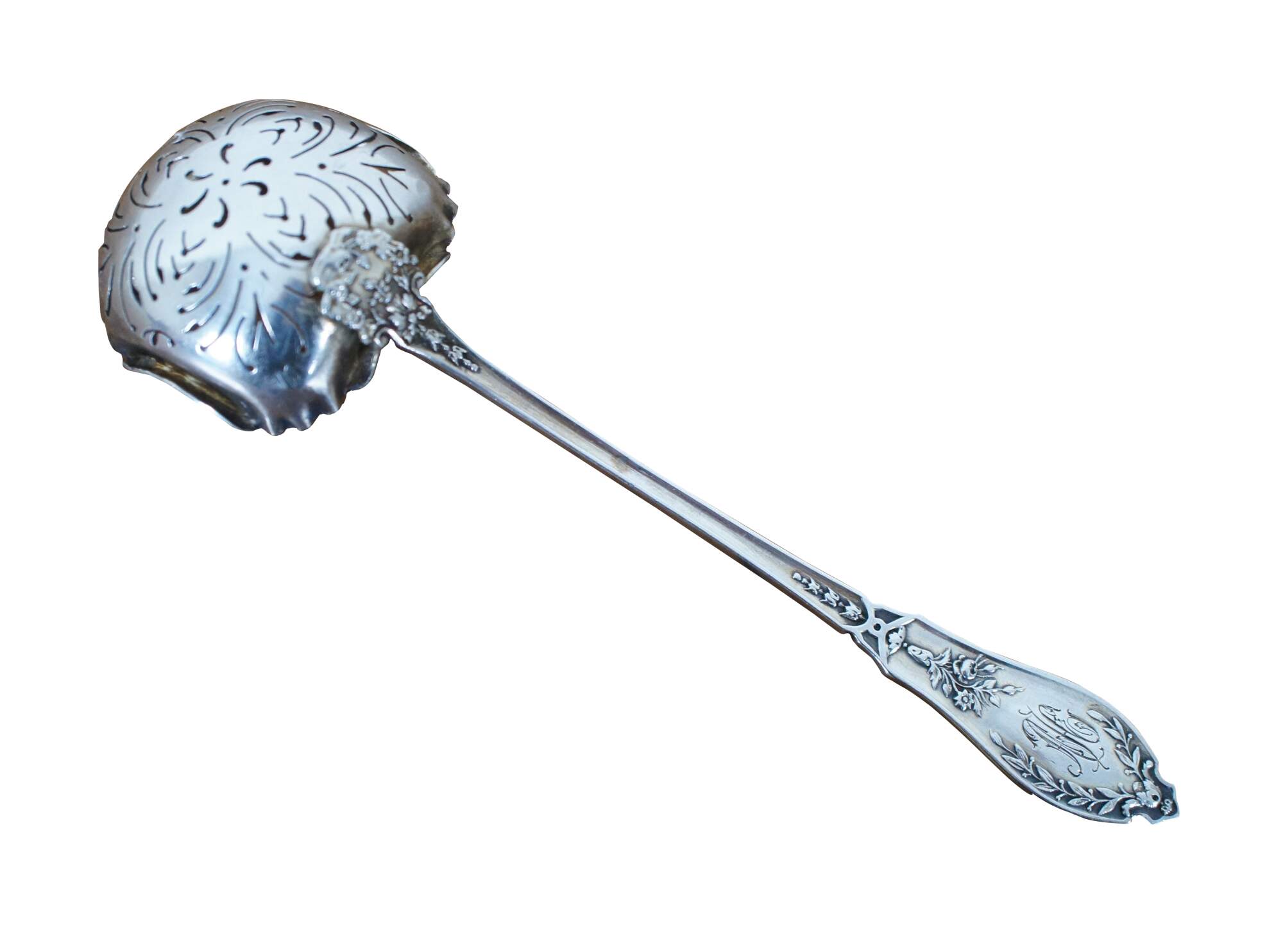 Antique silver pea spoon / tea strainer featuring a ladle shaped pierced bowl with lightly crimped edges and floral monogrammed motif on the handle.