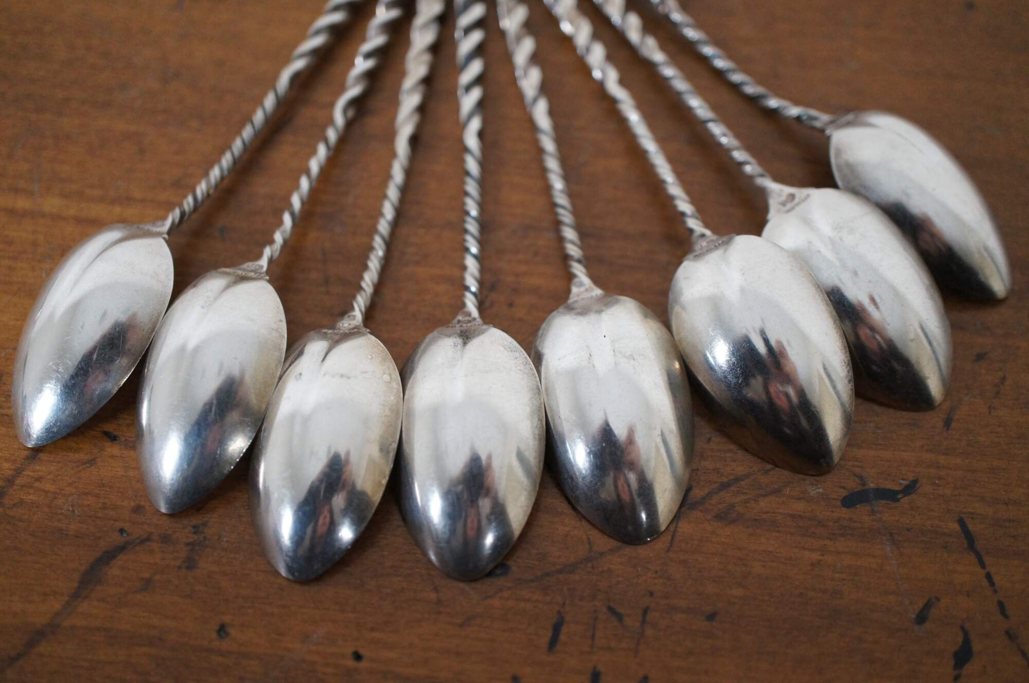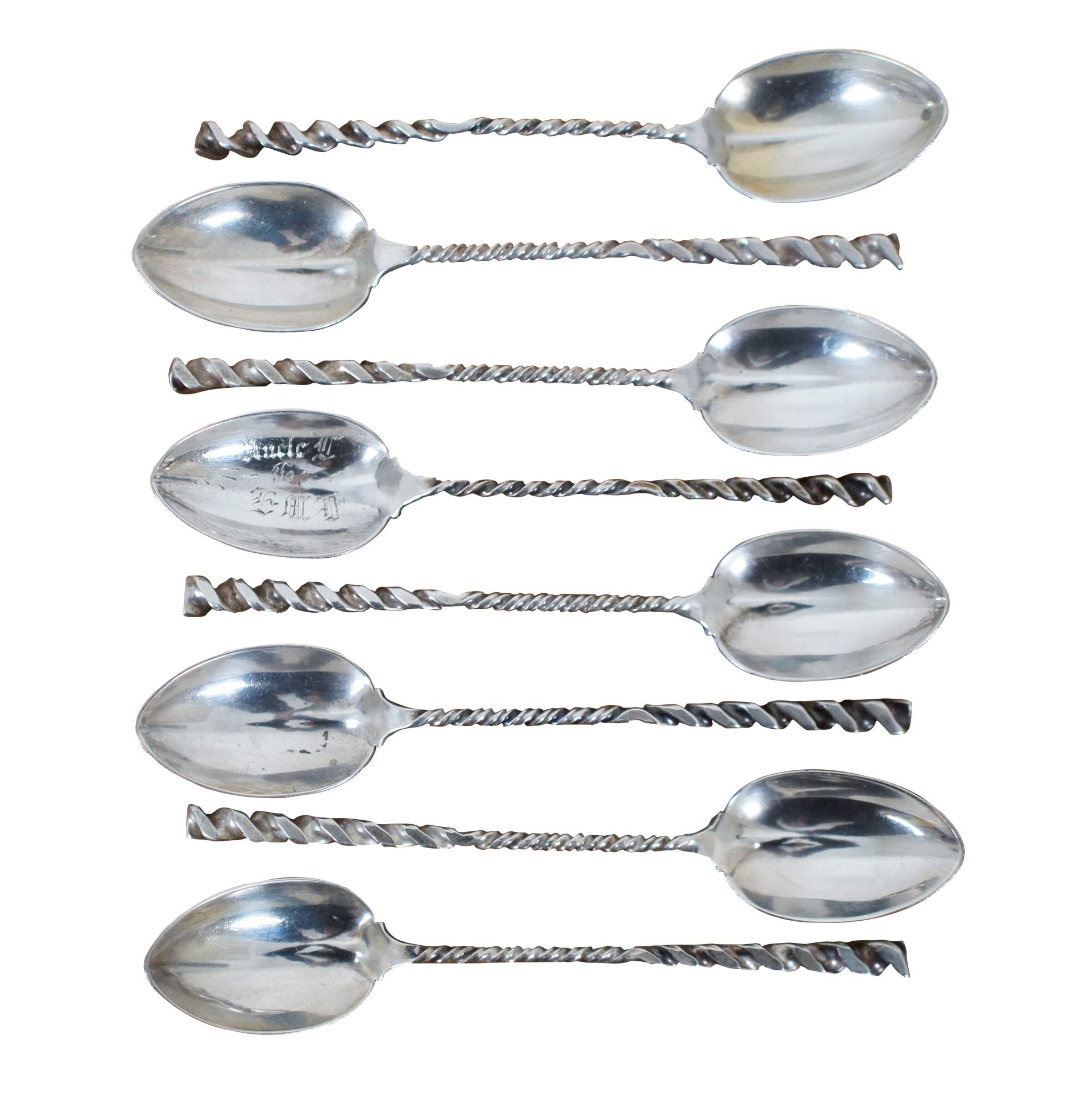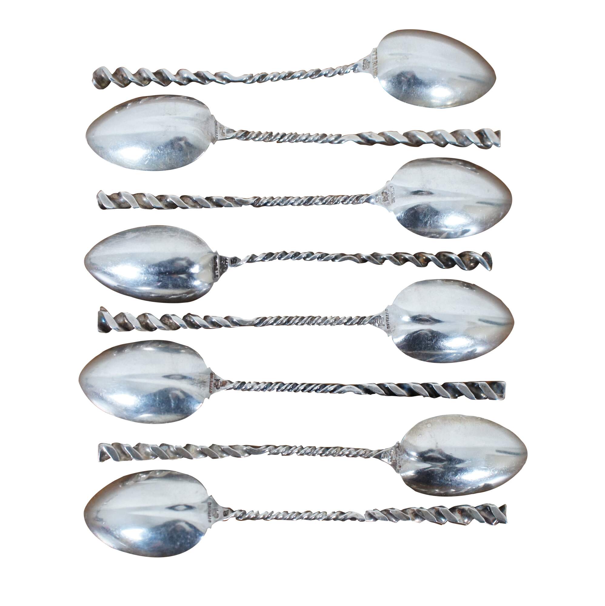 Set of 8 Whiting Mfg Co number 5 sterling silver coffee spoons with cleft bowl and twisted handles.