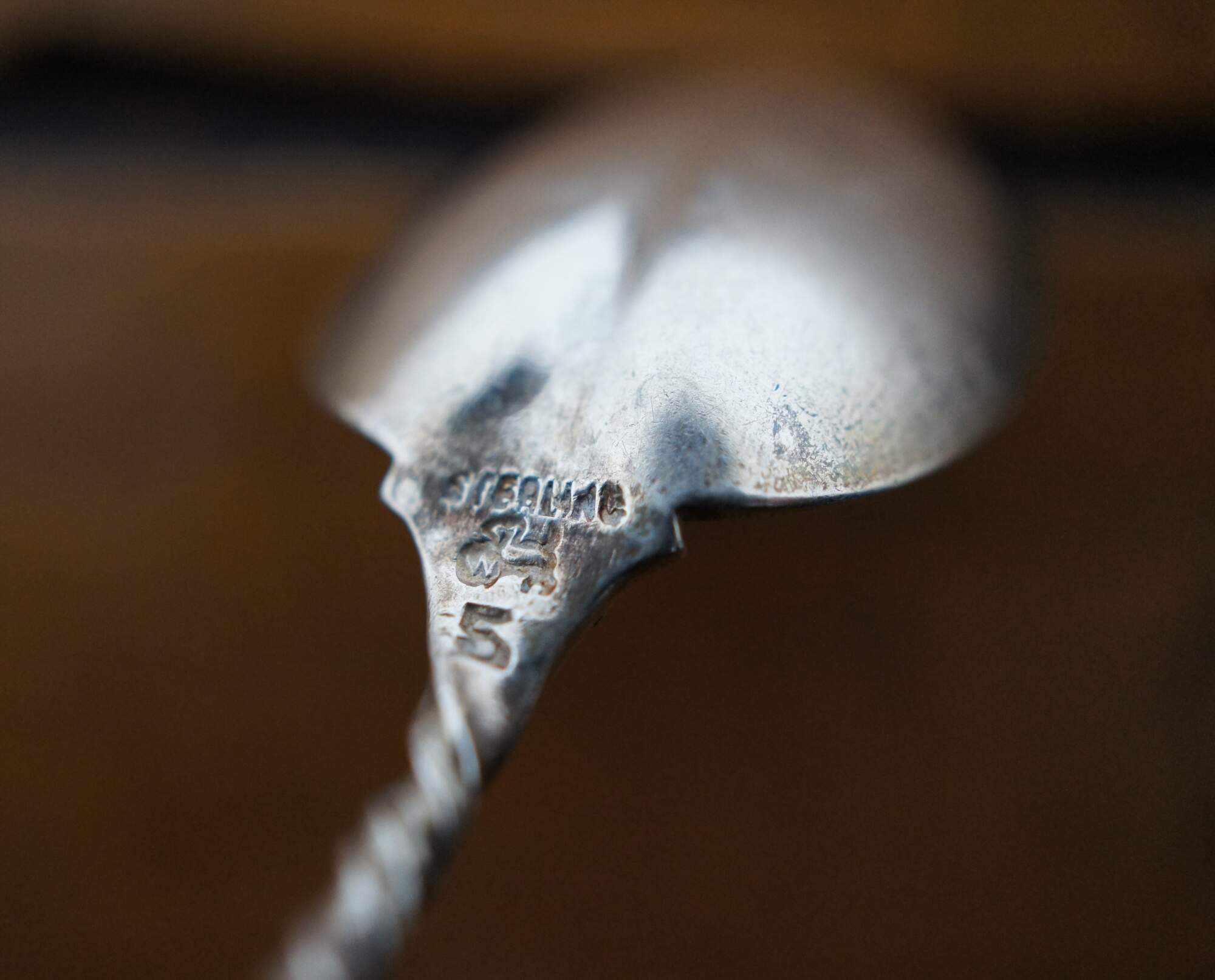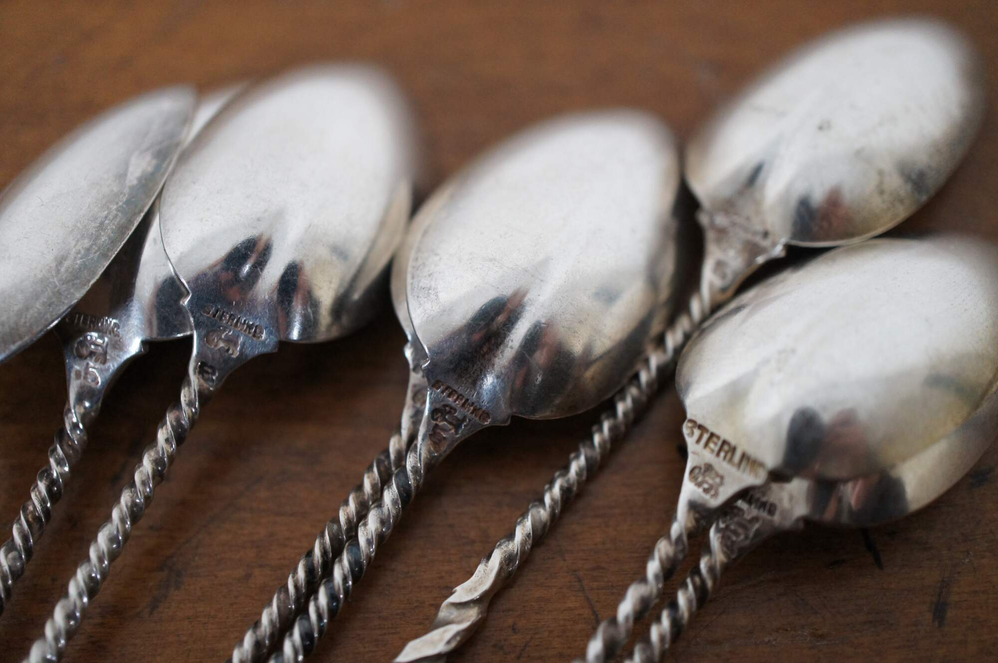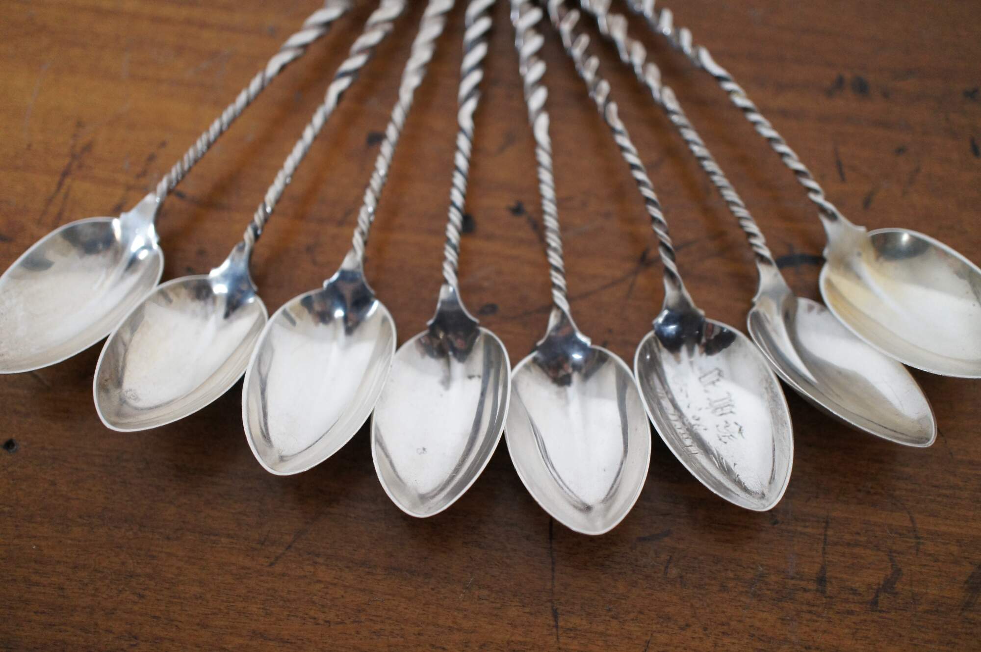 Set of 8 Whiting Mfg Co number 5 sterling silver coffee spoons with cleft bowl and twisted handles.