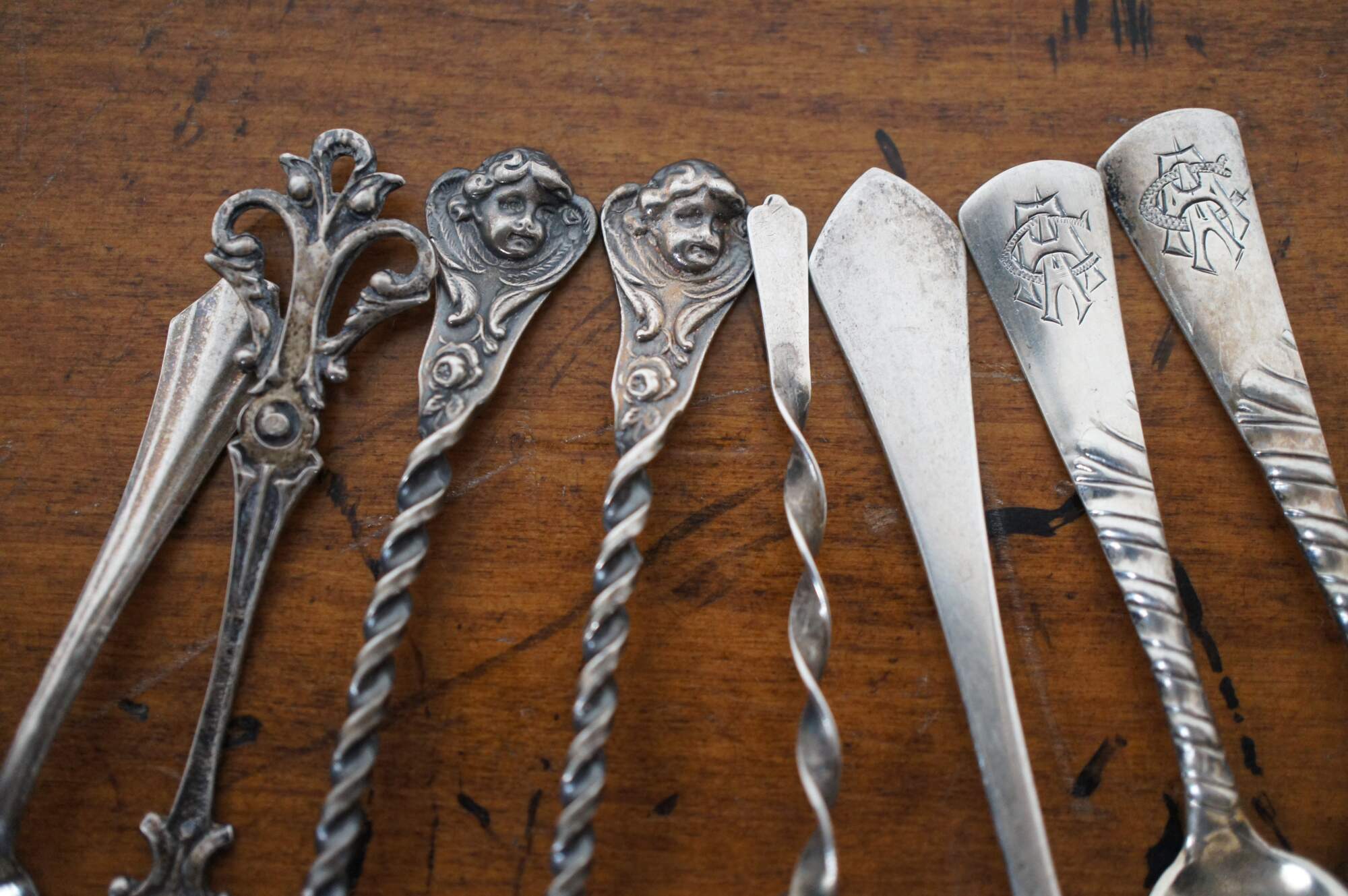 Lot of 8 assorted antique sterling silver salt spoons in a variety of designs and slightly different sizes. Makers include Webster Company and Gorham Mfg Co.