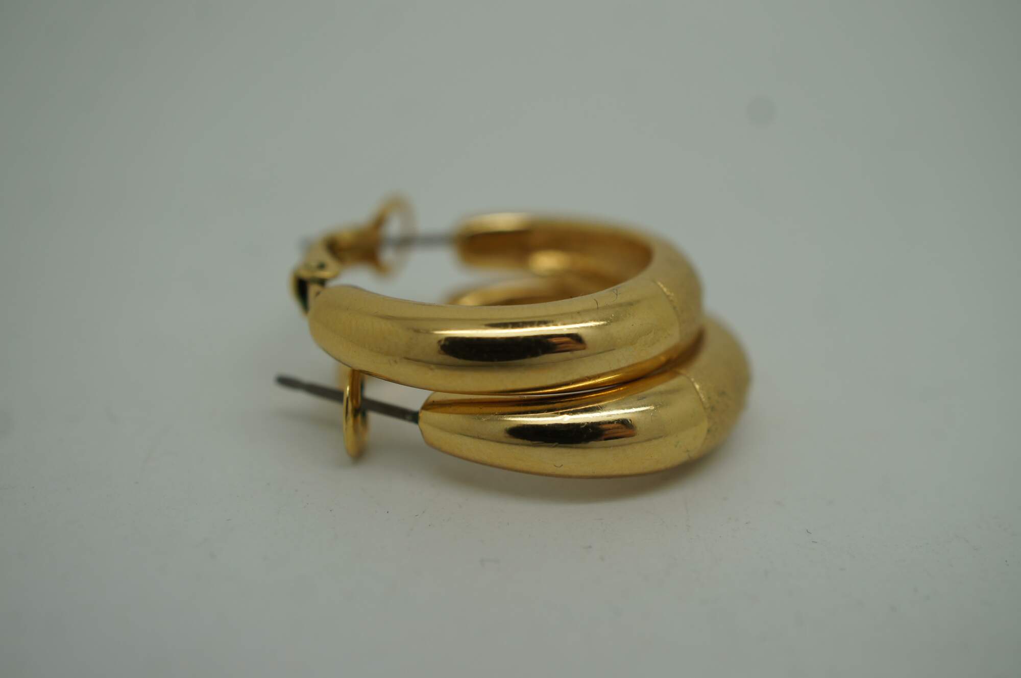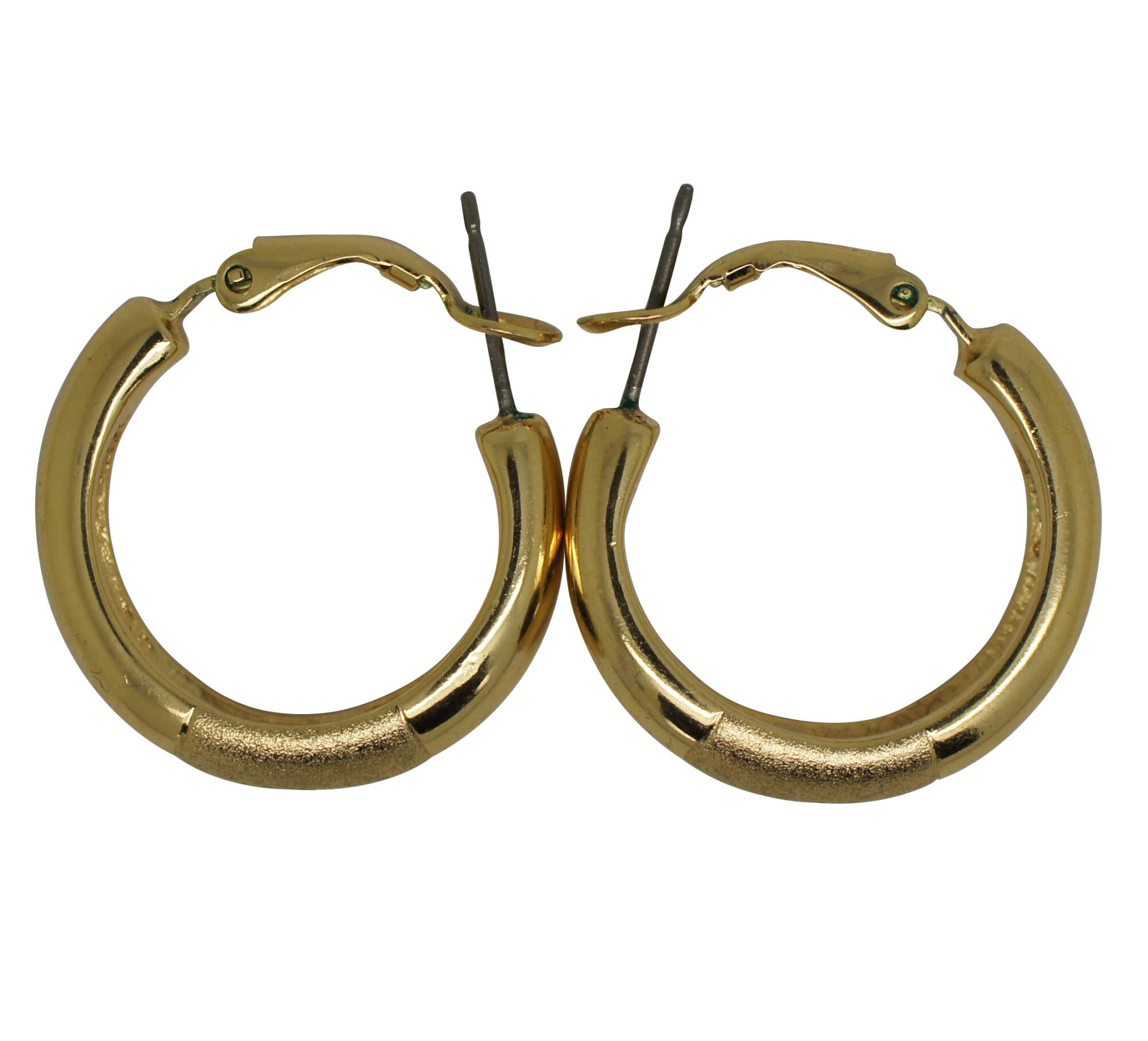 Vintage gold tone hoop earrings featuring a textured center section accented with a white rhinestone and polished sides, with lever back hoop earring backs. No makers mark.