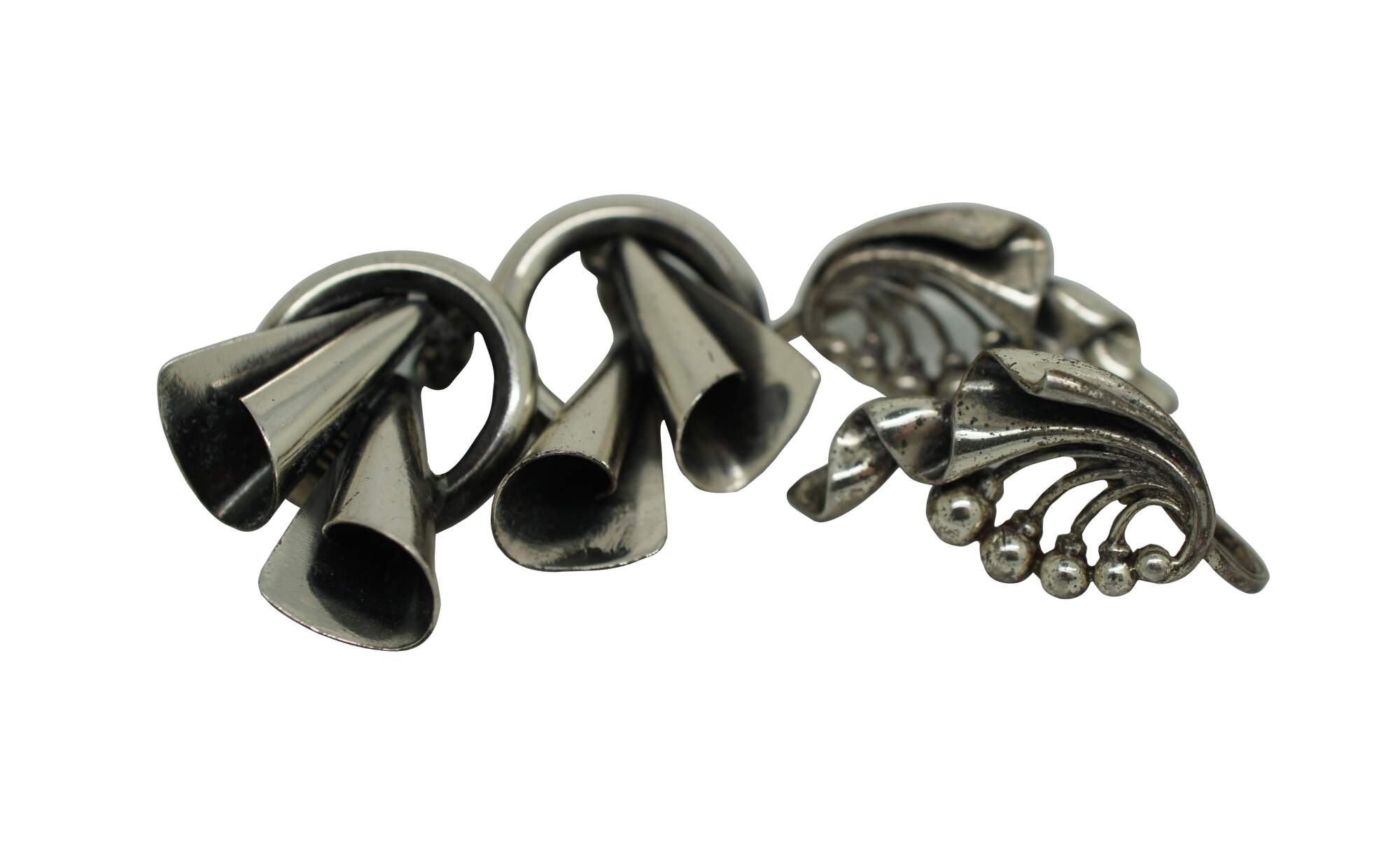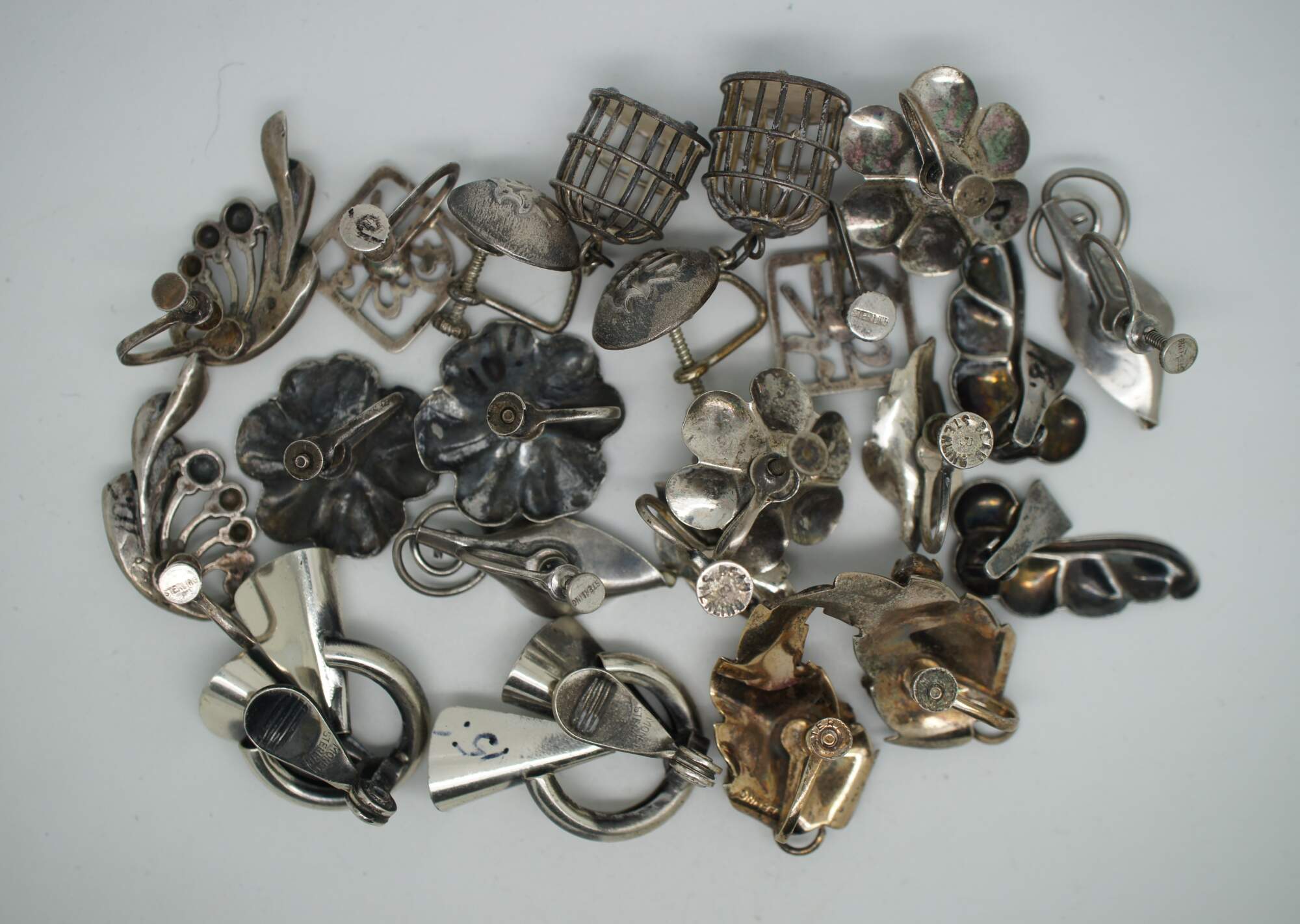 Lot of 10 pairs of early to mid 20th century sterling silver screw back and clip on earrings in a variety of chinoiserie and art deco floral designs. Monet, Beau.