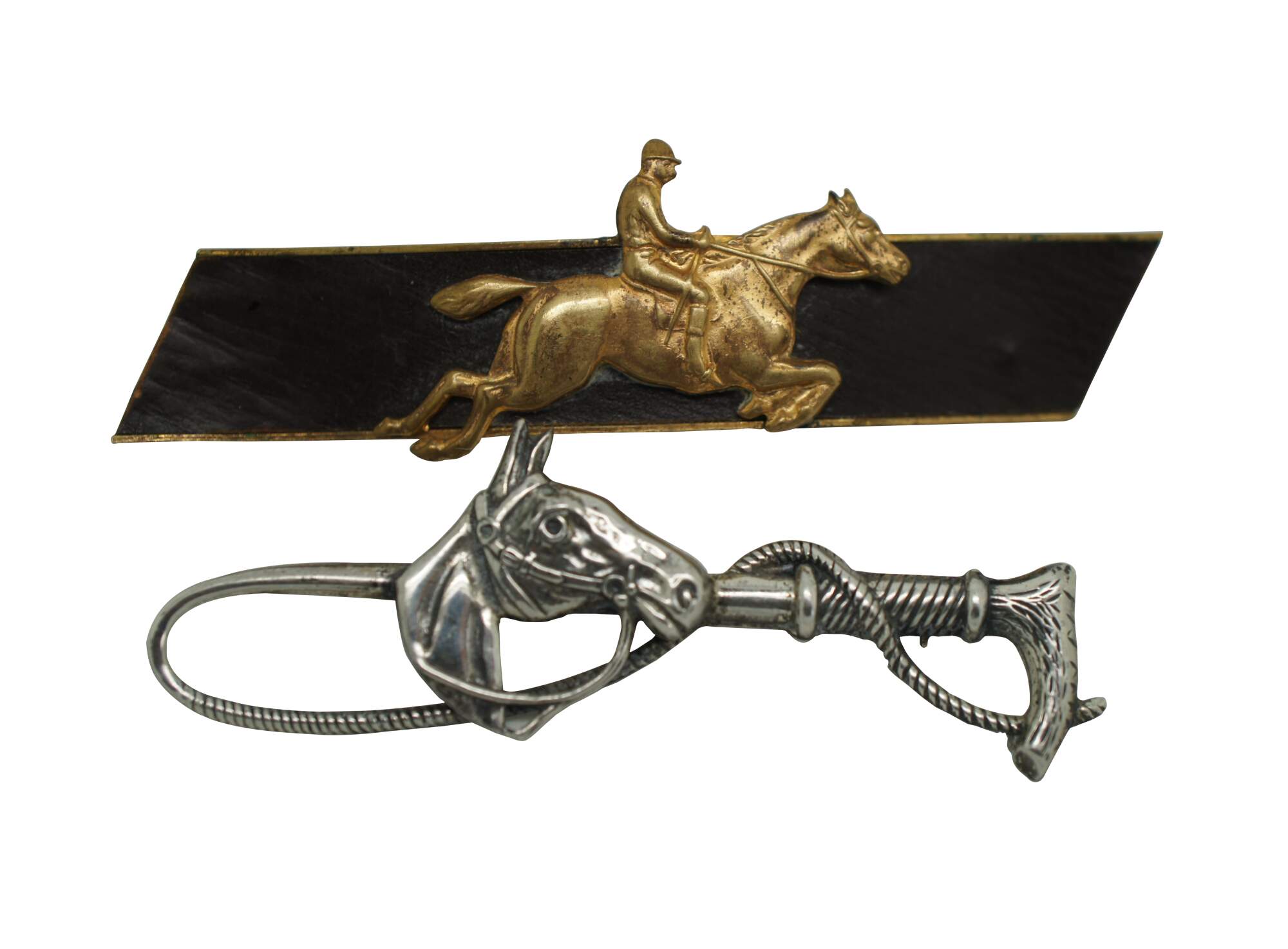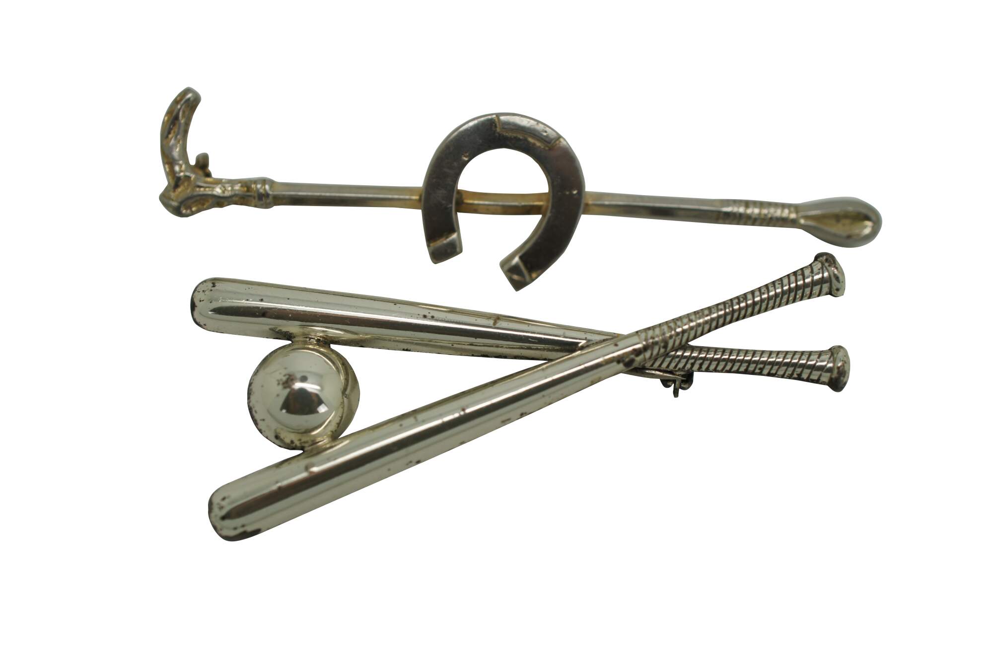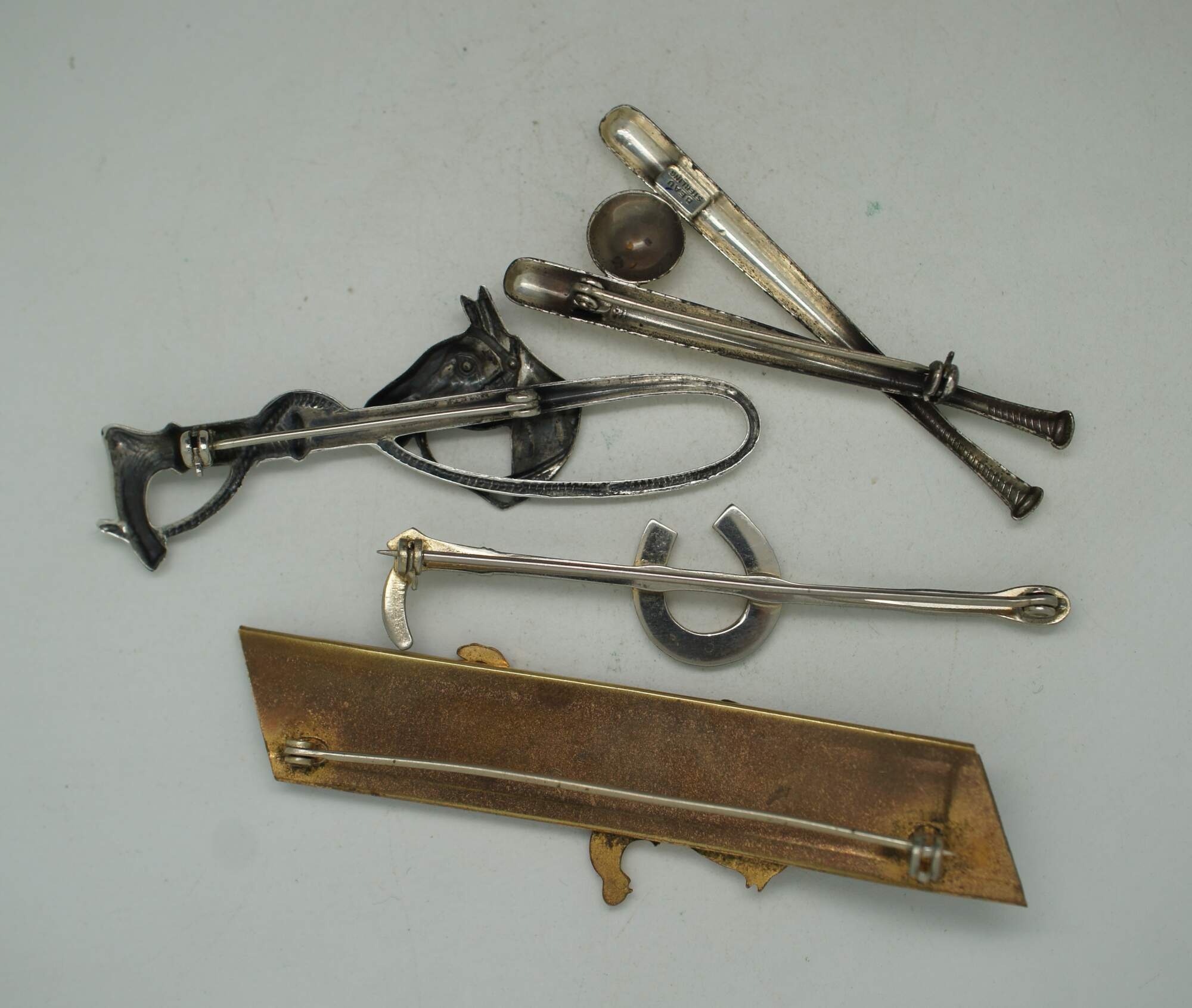 Assorted set of four vintage pins / brooches, including one gilt and leather horse rider / jumper, two sterling silver riding crops with horseshoe, and one sterling crossed baseball bats by Beau.