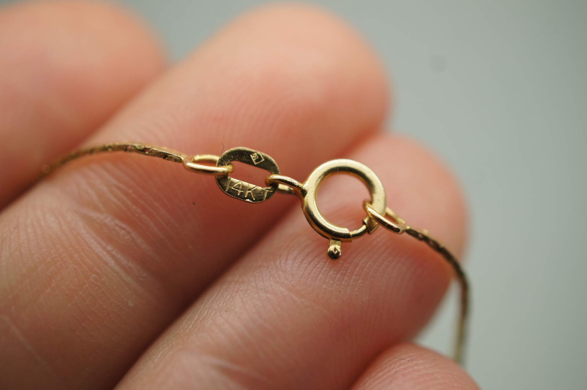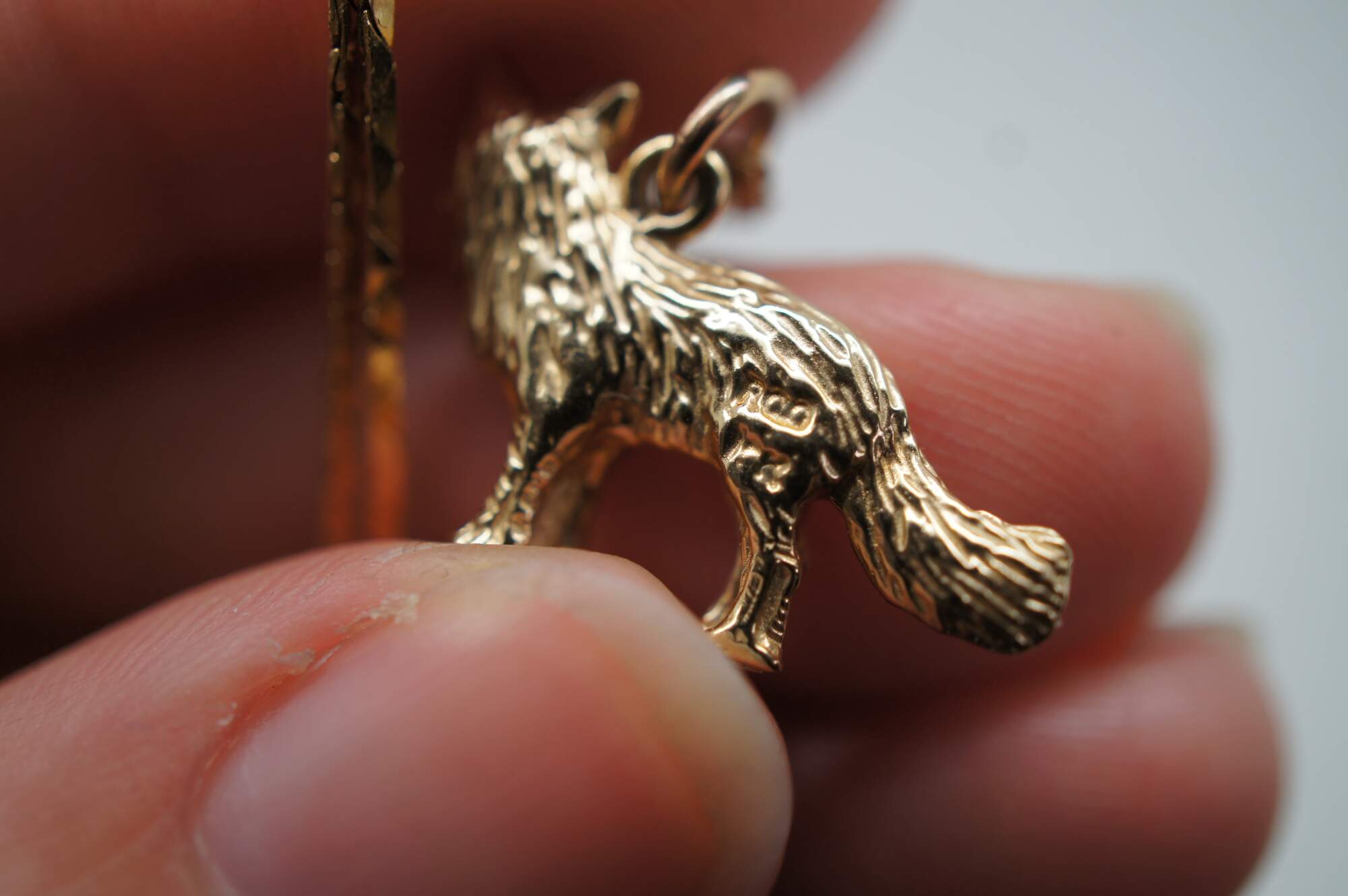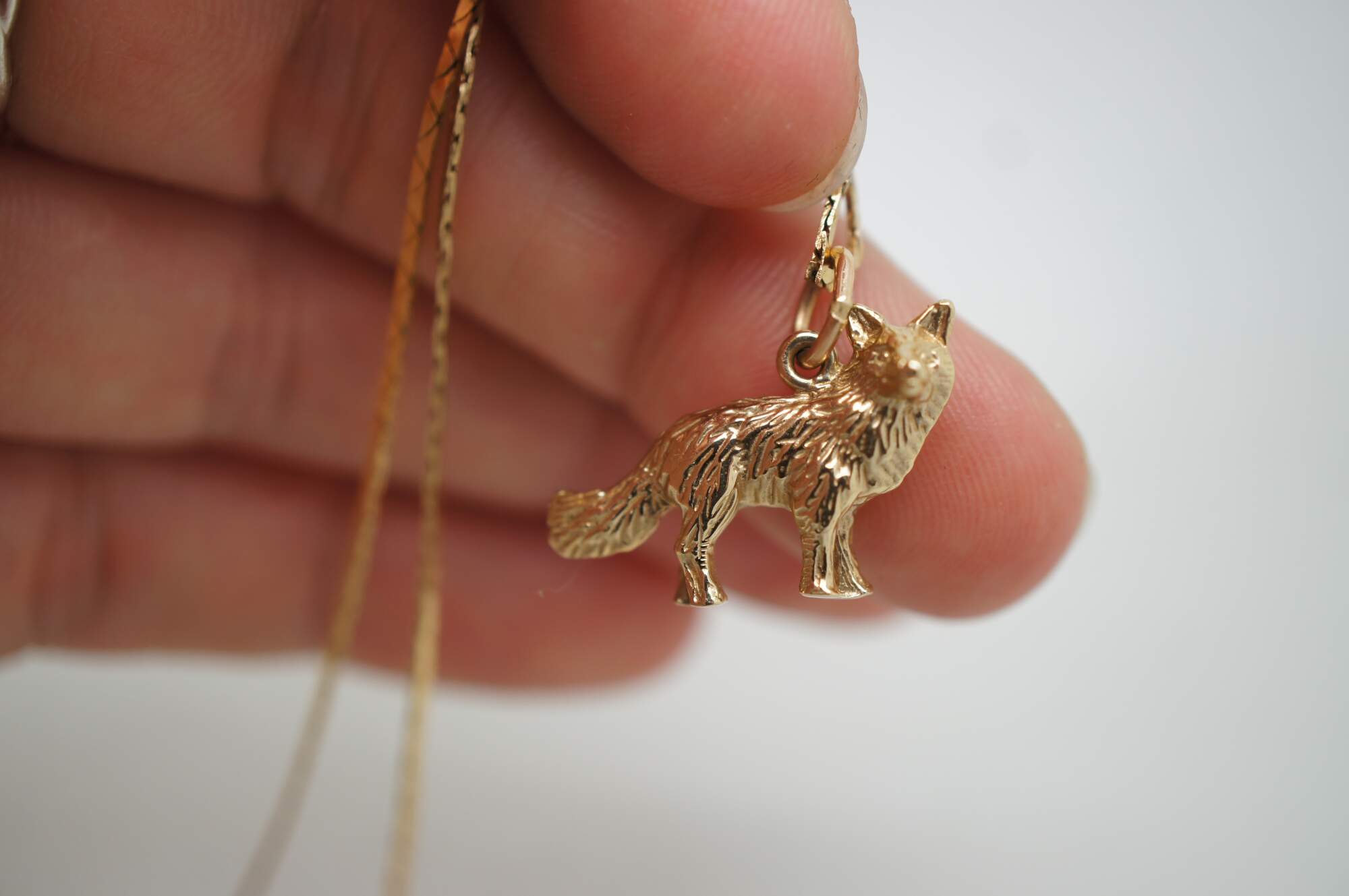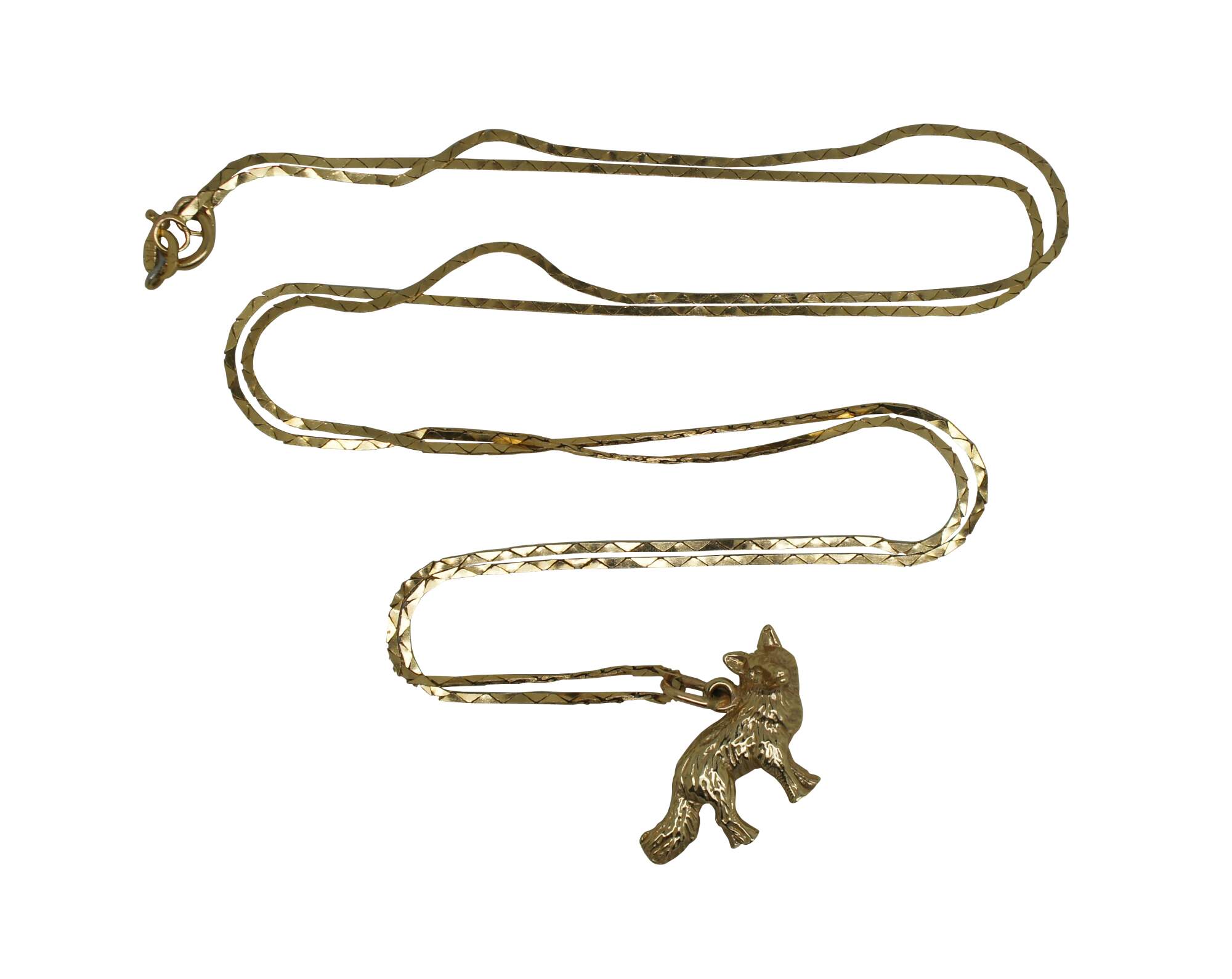 Vintage 14k yellow gold flat cobra chain necklace with a pendant charm in the shape of a fox or wolf.