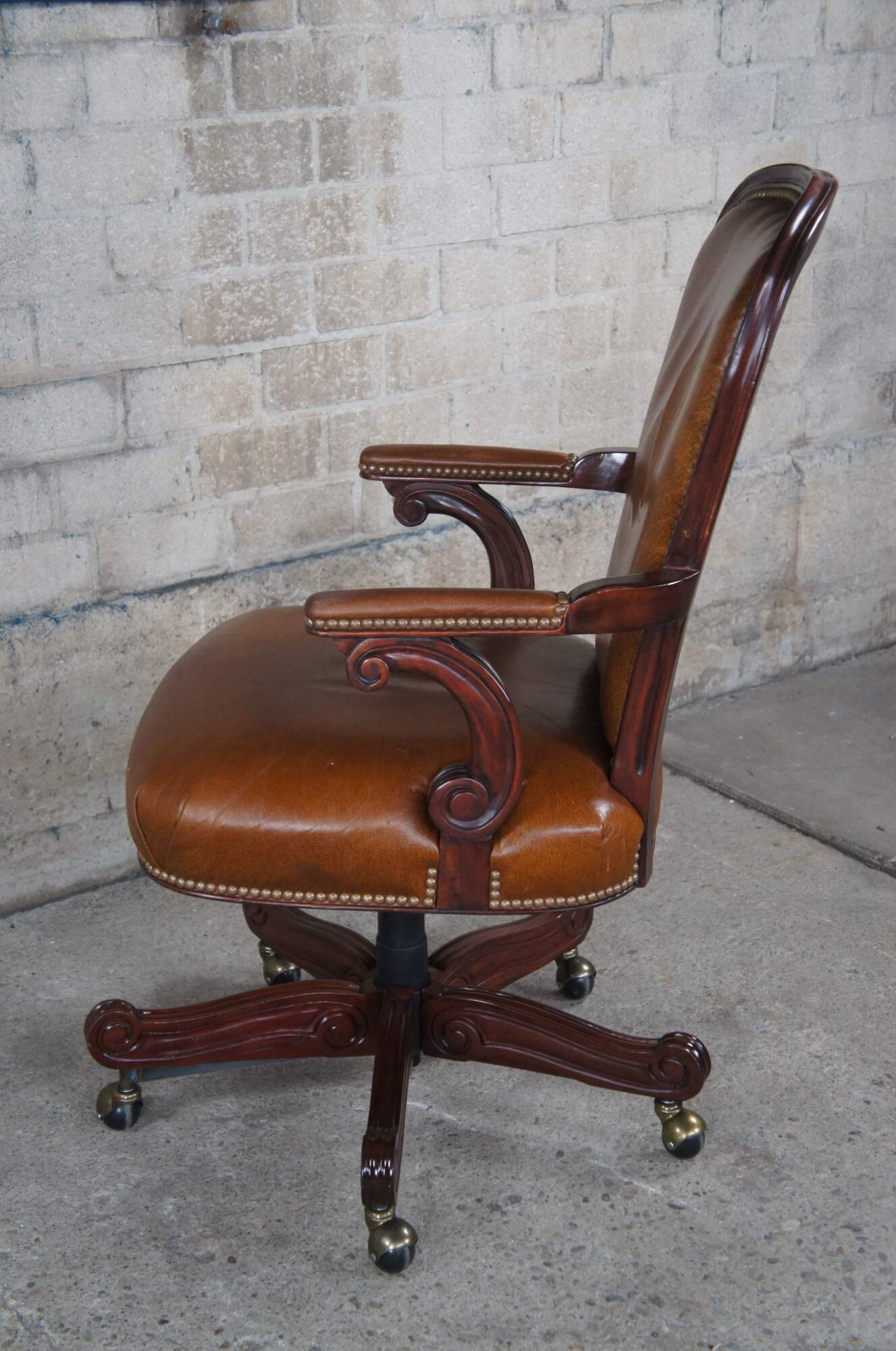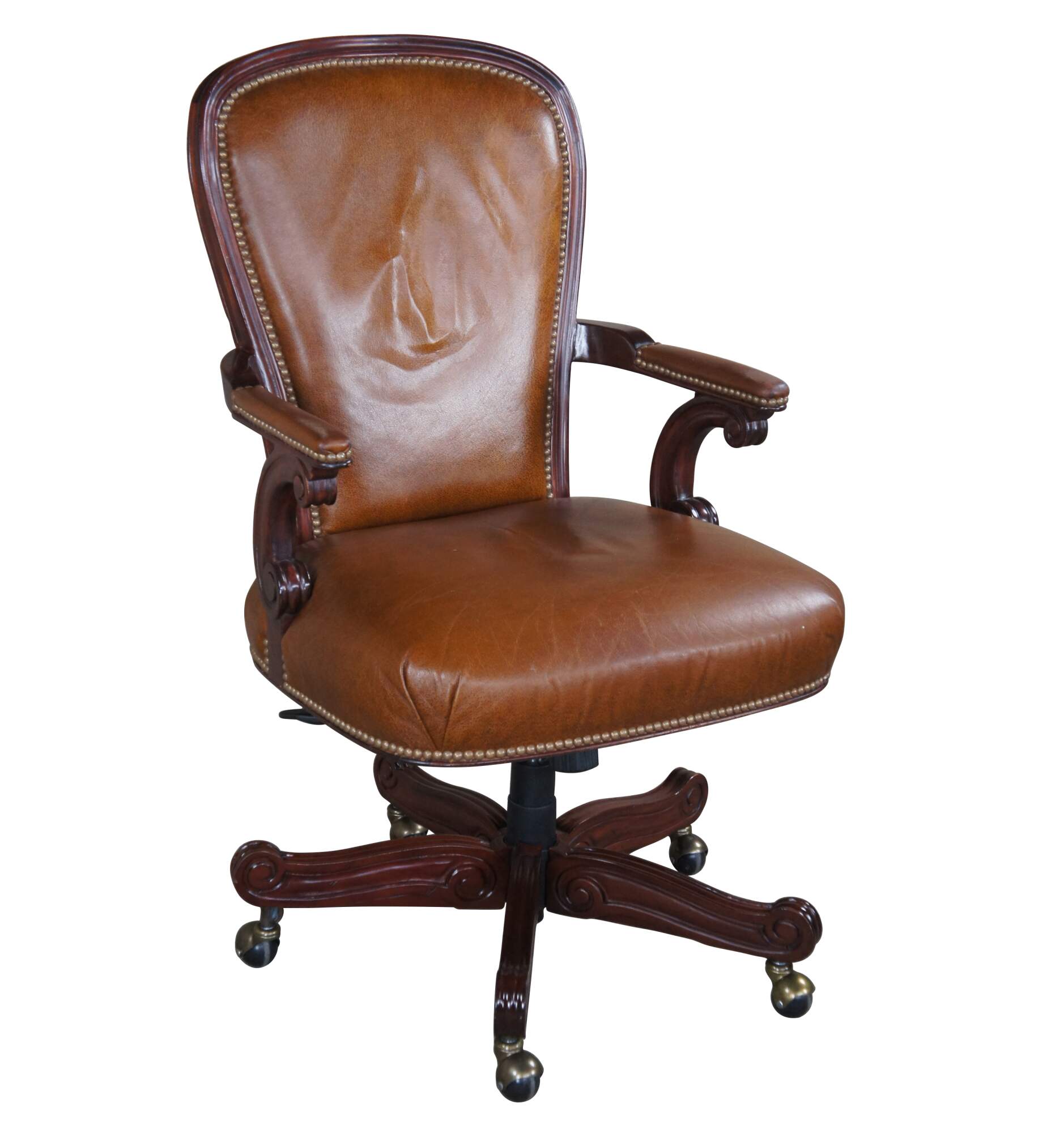 The Wiggins Executive Swivel Chair (SKU:693-27) by Leathercraft Furniture is a smooth and balanced piece that brings completeness to any home. Features a warm brown leather with nailhead trim. Made from beechwood with a mahogany finish.